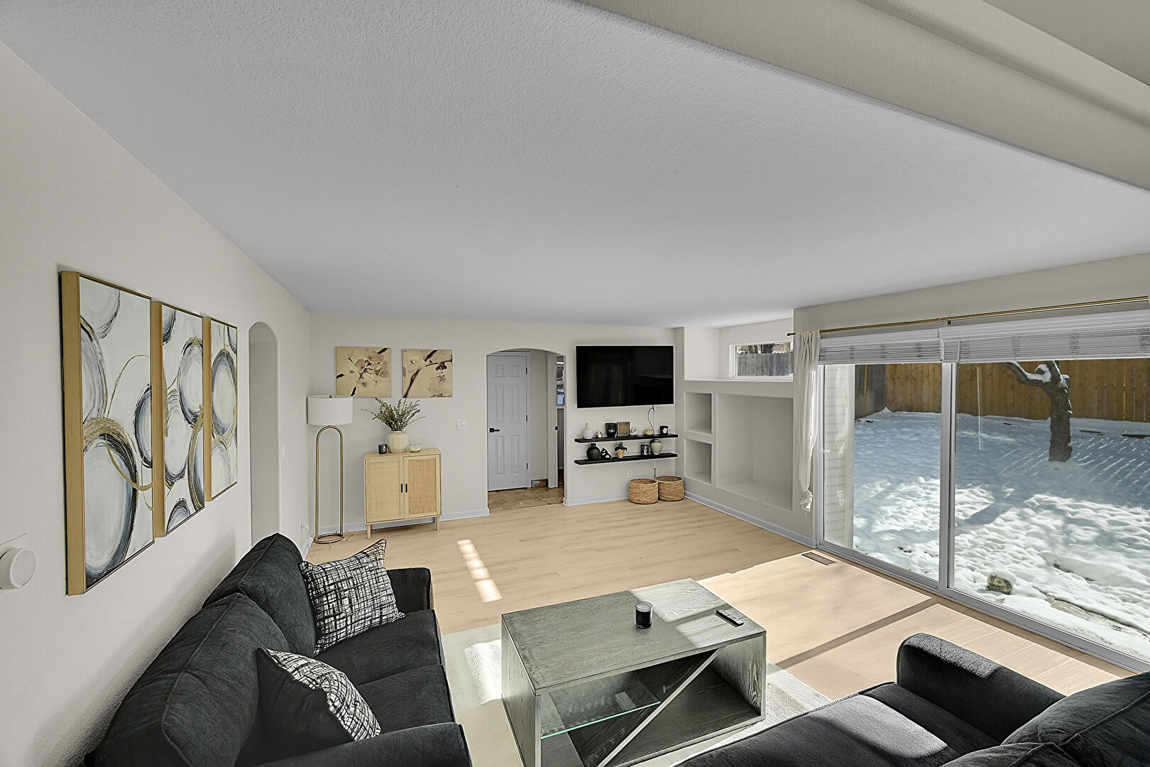 Arched Walkways, Baseboards Wall, Built In Shelves, Drywall, Natural Light, Notable Chandelier, Textured Ceiling, Vent, Wall Mounted Ac, Wood Finish Floor, Arched Walkways, Baseboards Wall, Natural Light, Wood Finish Floor