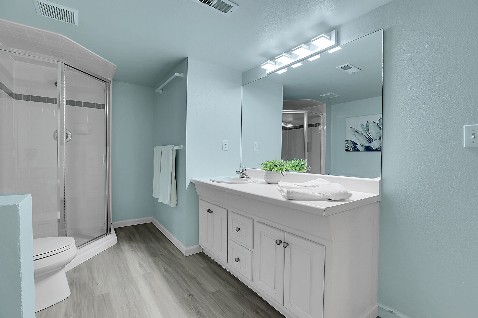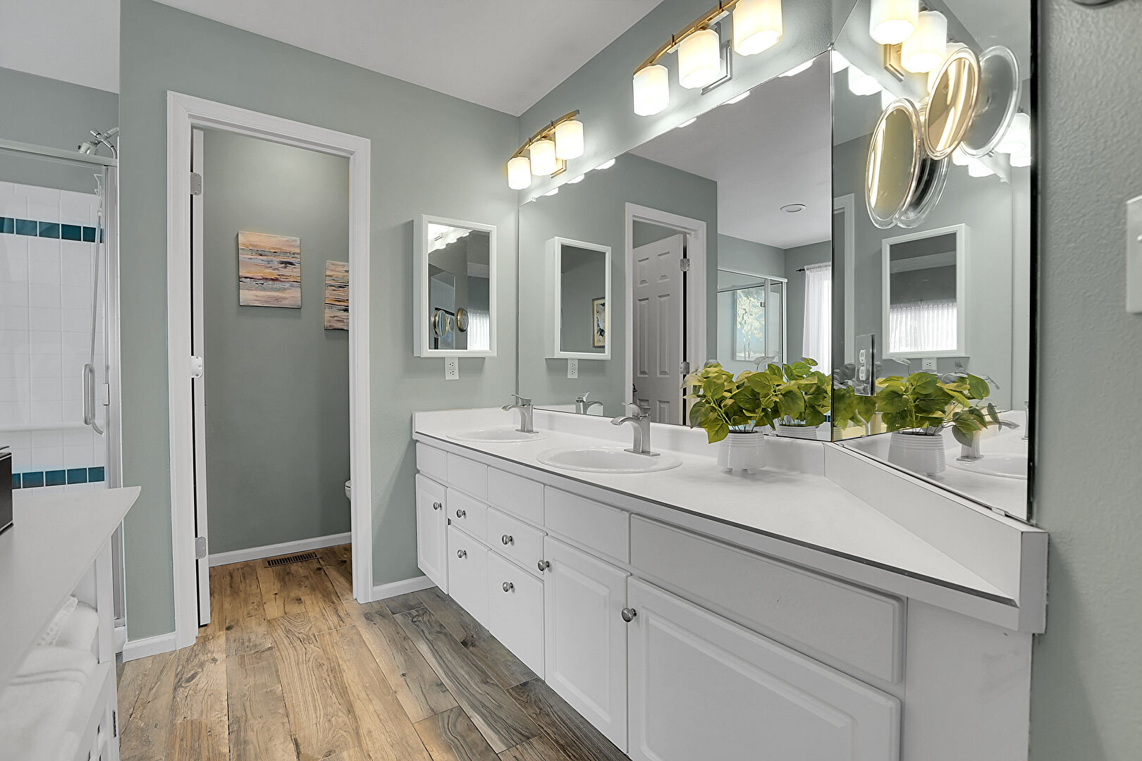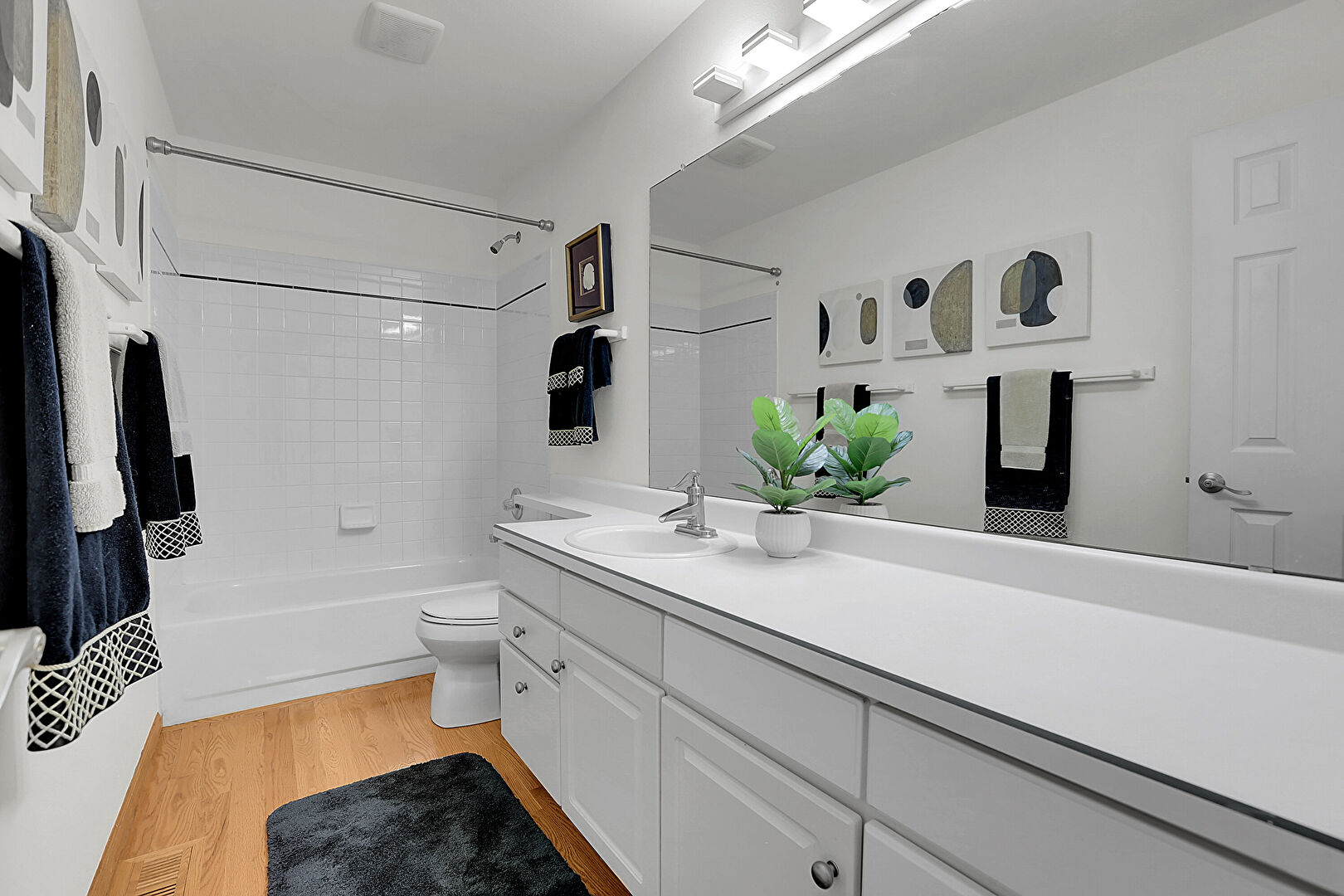 Baseboards Wall, Closet, Combined Bath Shower, Drywall, Full Bathroom, Natural Light, Textured Wall, Vanity, Vent, Wood Finish Floor, Double Vanity, Full Bathroom, Natural Light, Wood Finish Floor