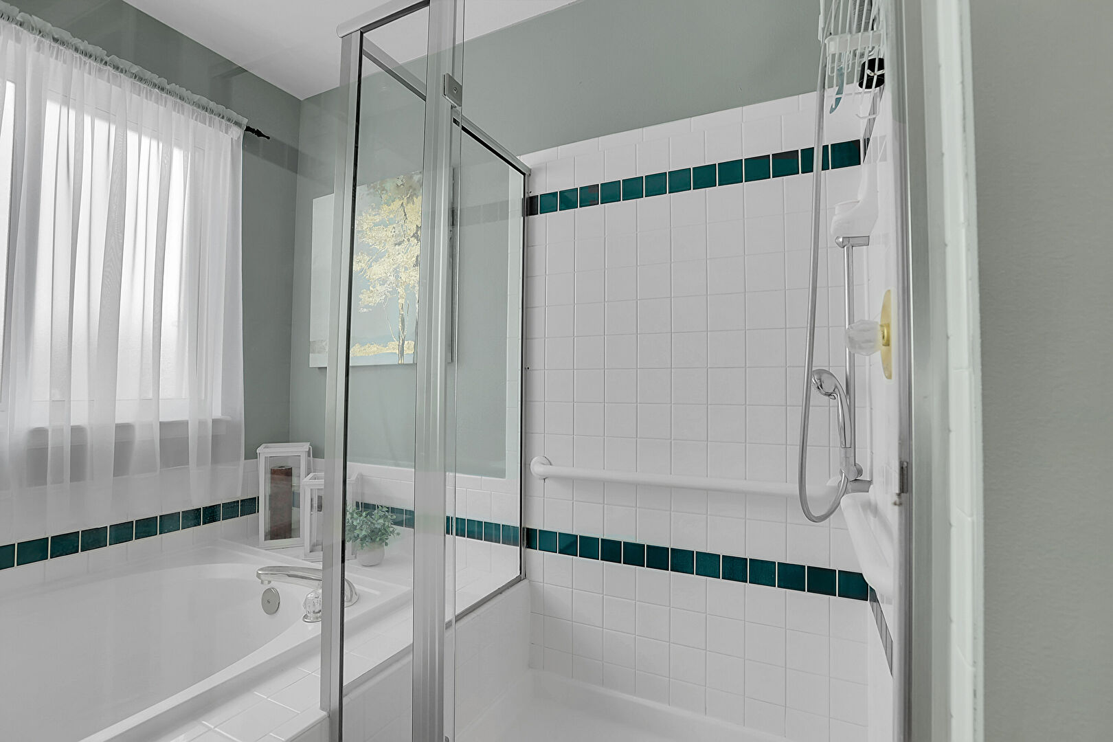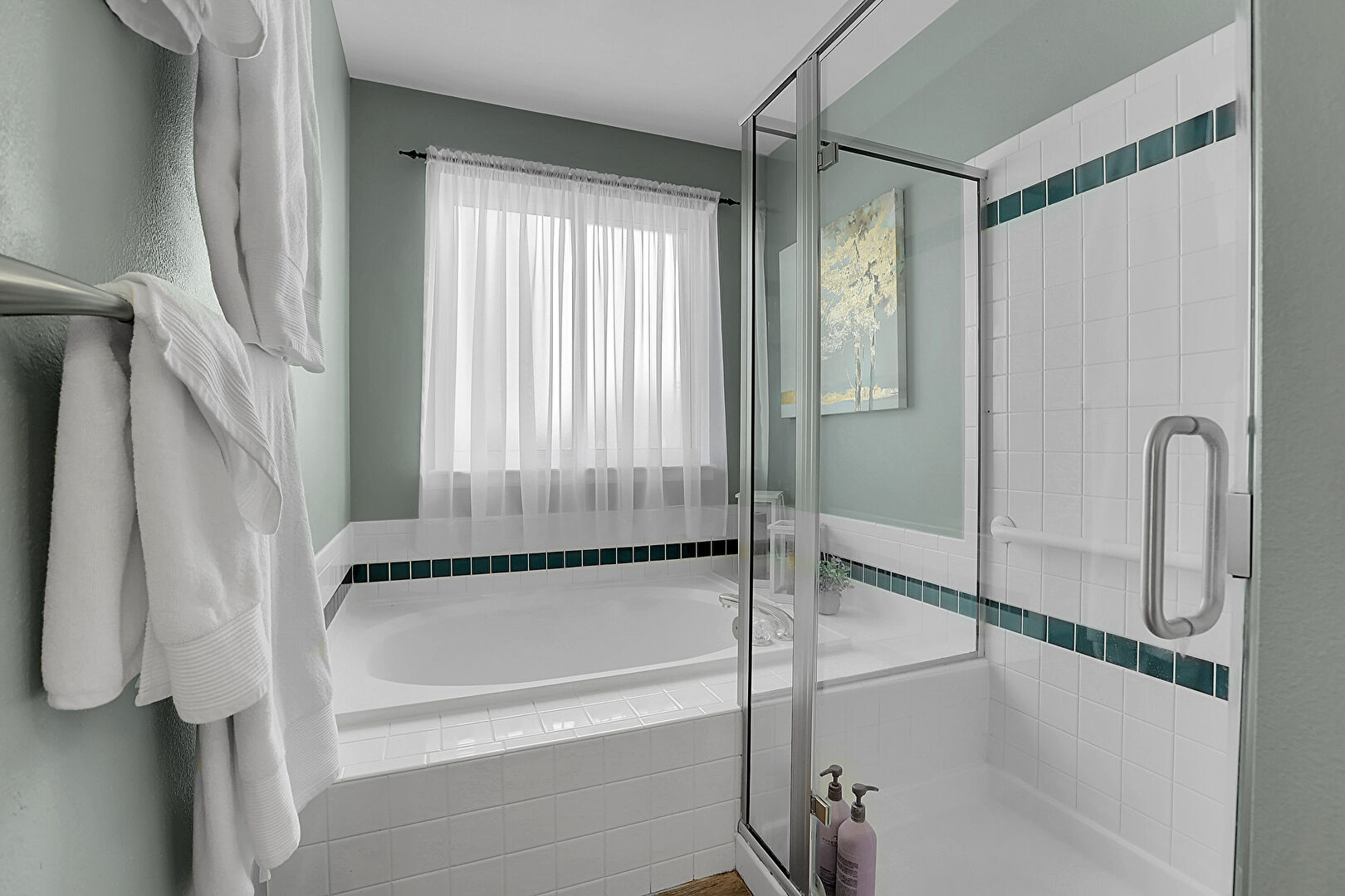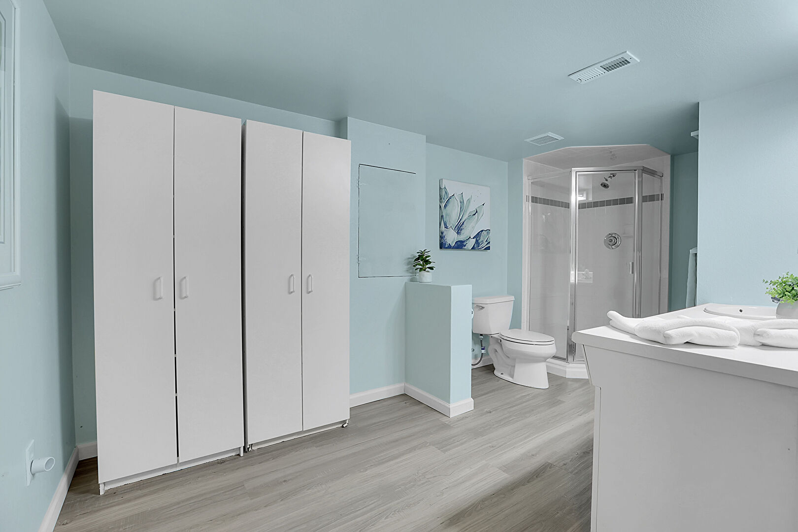 Baseboards Wall, Closet, Combined Bath Shower, Drywall, Full Bathroom, Natural Light, Textured Wall, Vanity, Vent, Wood Finish Floor, Double Vanity, Full Bathroom, Natural Light, Wood Finish Floor