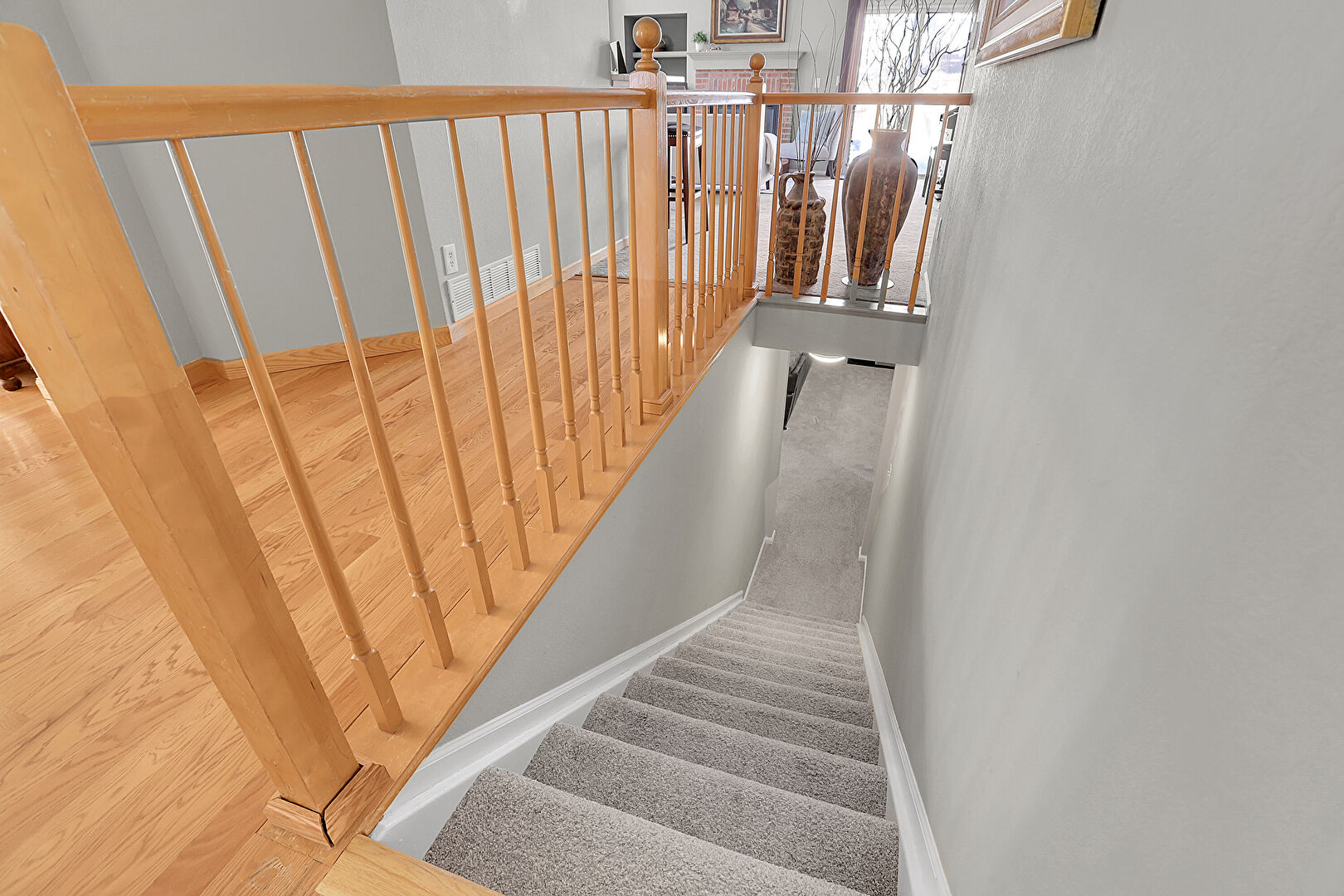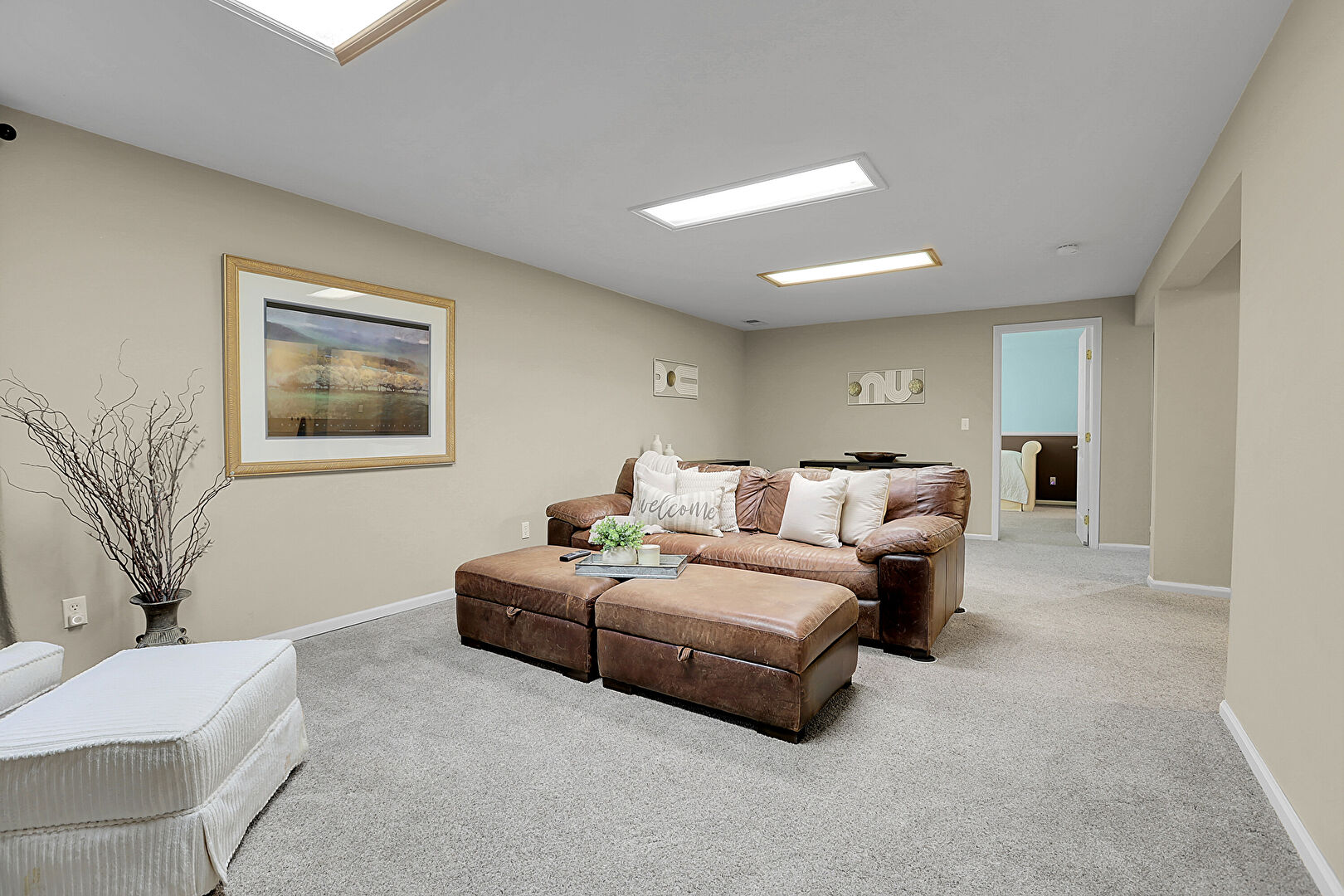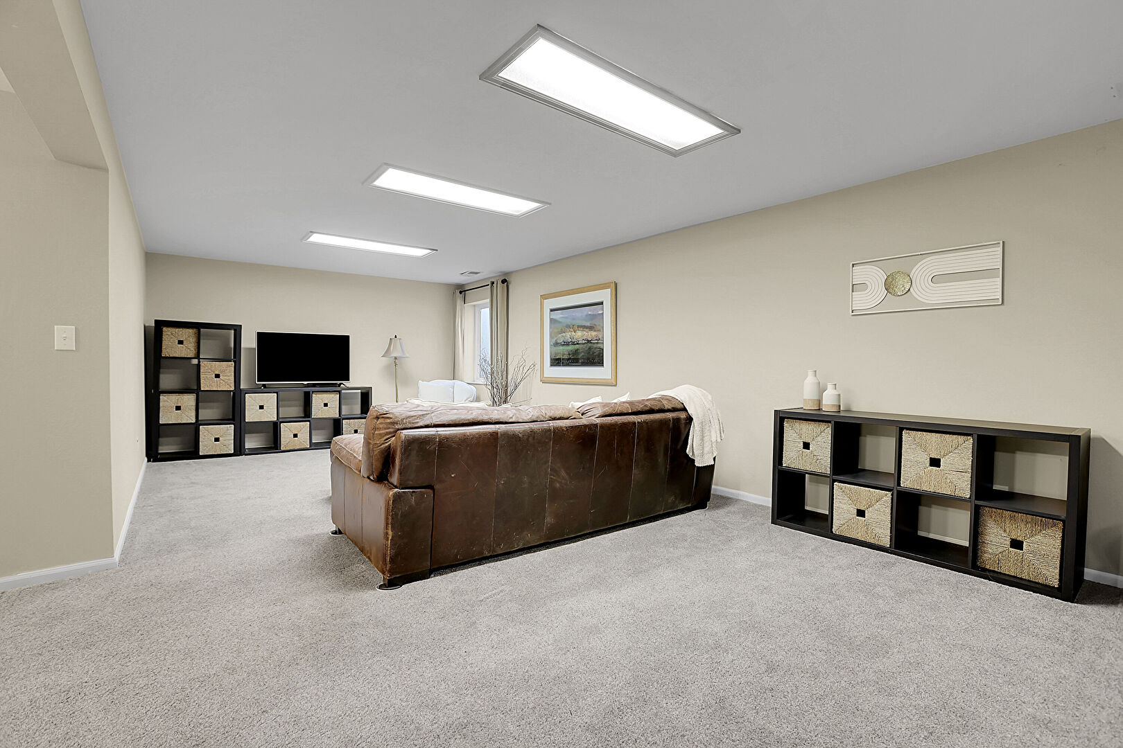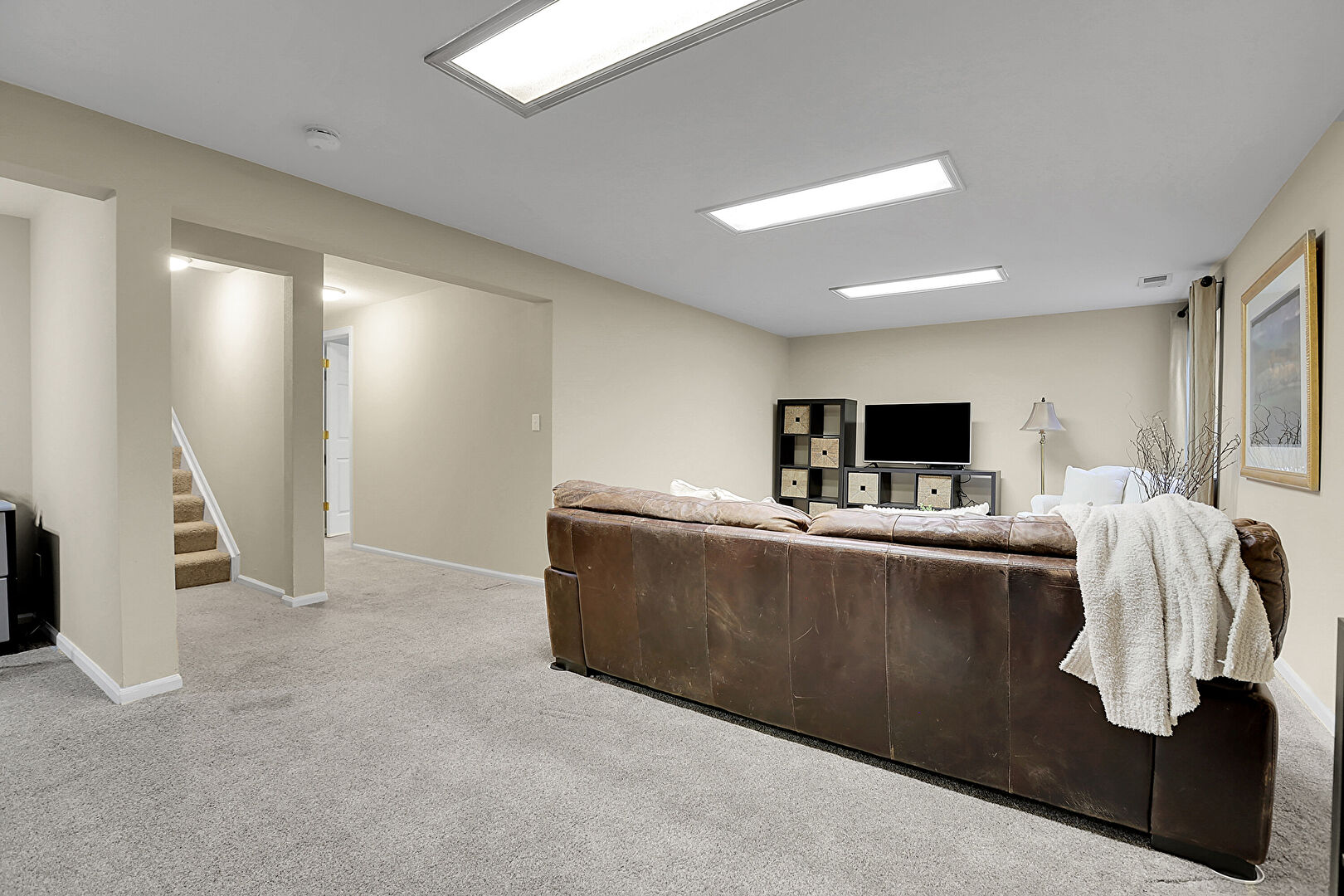 Baseboards Wall, Basement, Built In Shelves, Carpet, Ceiling Fan, Drywall, Fireplace, Natural Light, Notable Chandelier, Recessed Lighting, Smoke Carbon Monoxide Detector, Stairs, Vent, Baseboards Wall, Carpet, Drywall, Fireplace, Natural Light, Wood Finish Floor