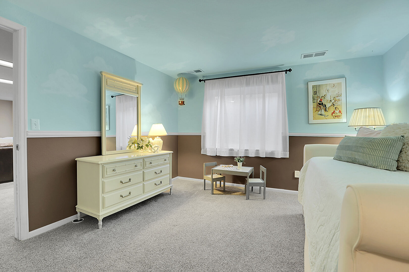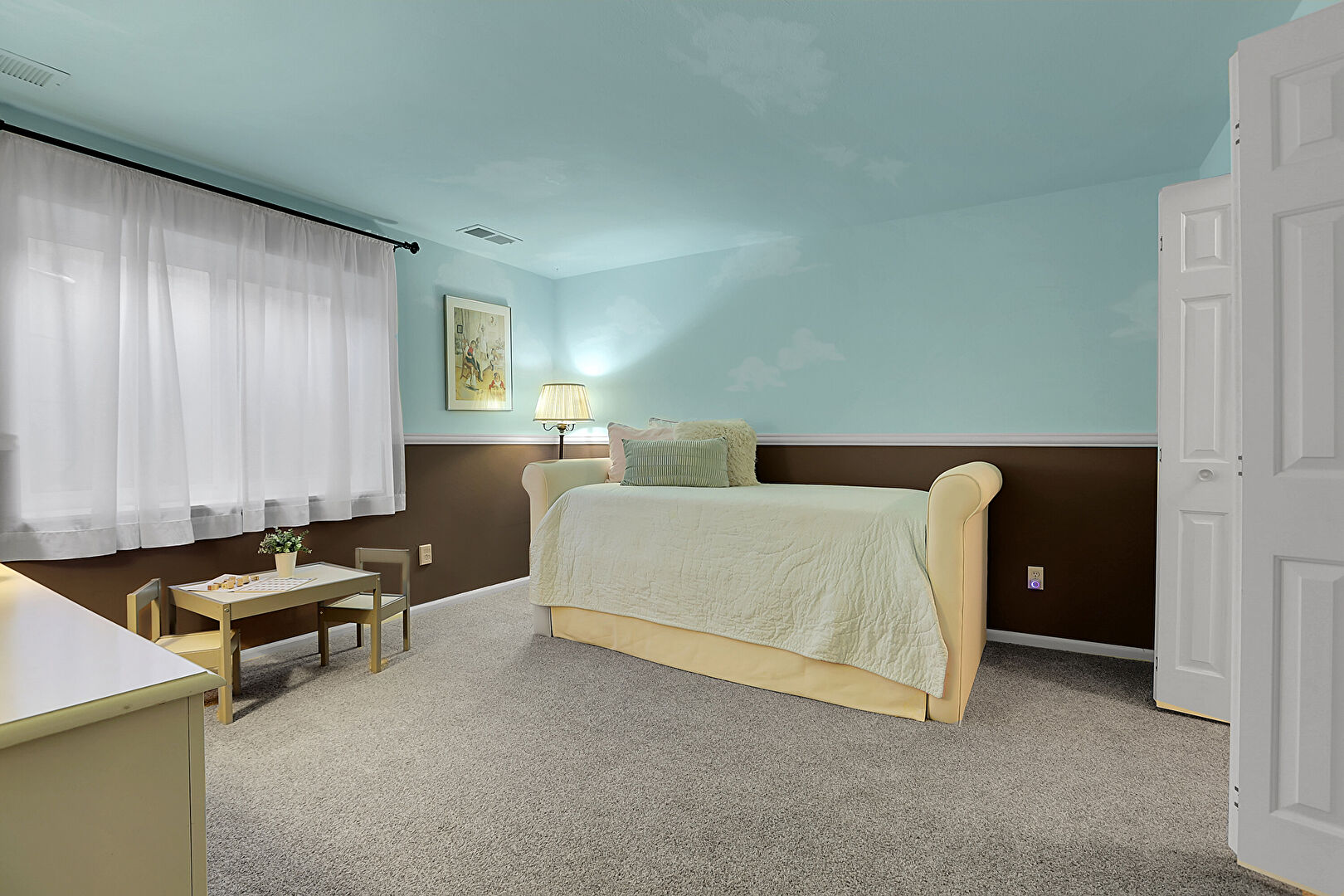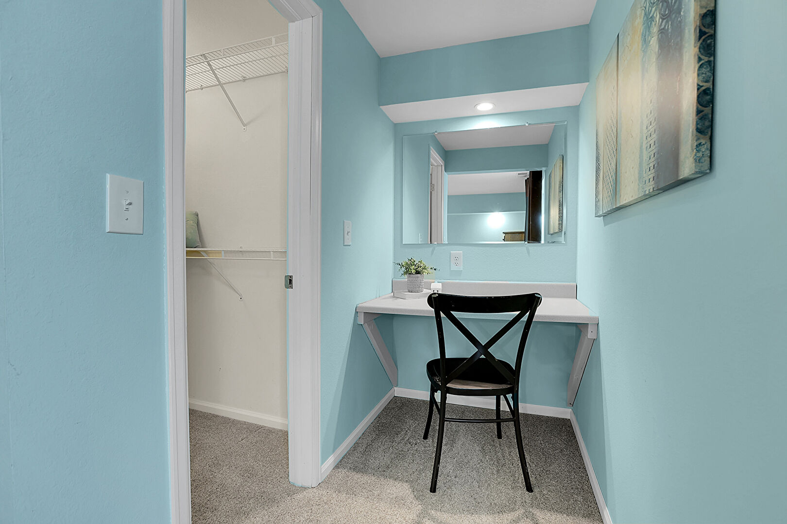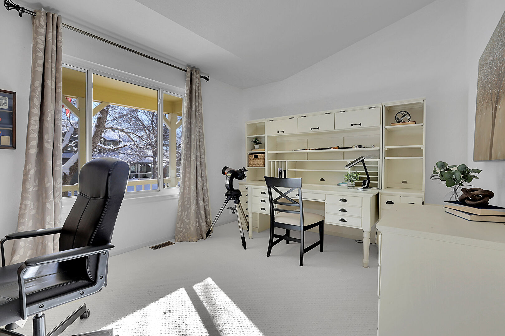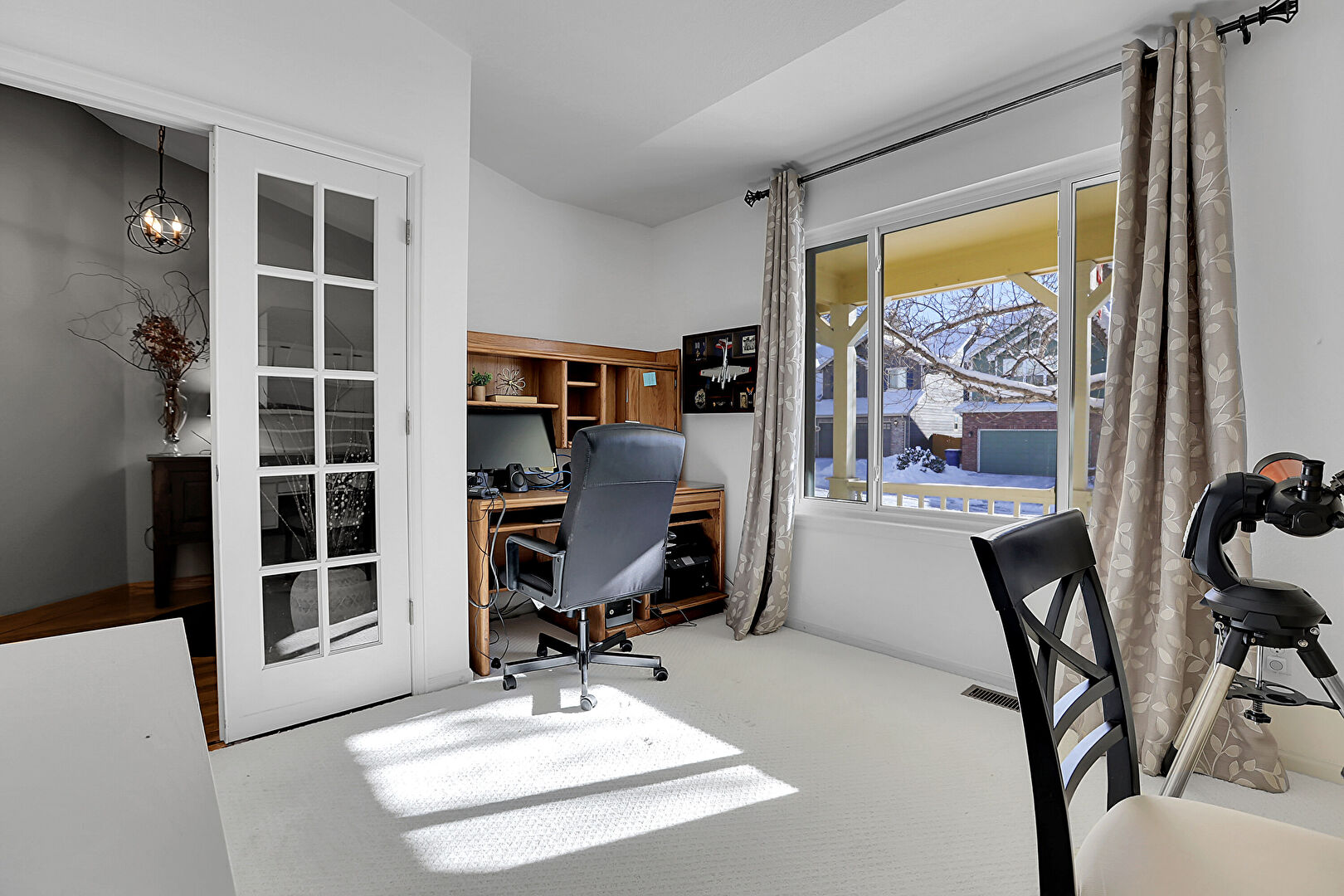 Carpet, Drywall, Natural Light, Notable Chandelier, Office Area, Vaulted Ceiling, Vent, Natural Light, Office Area