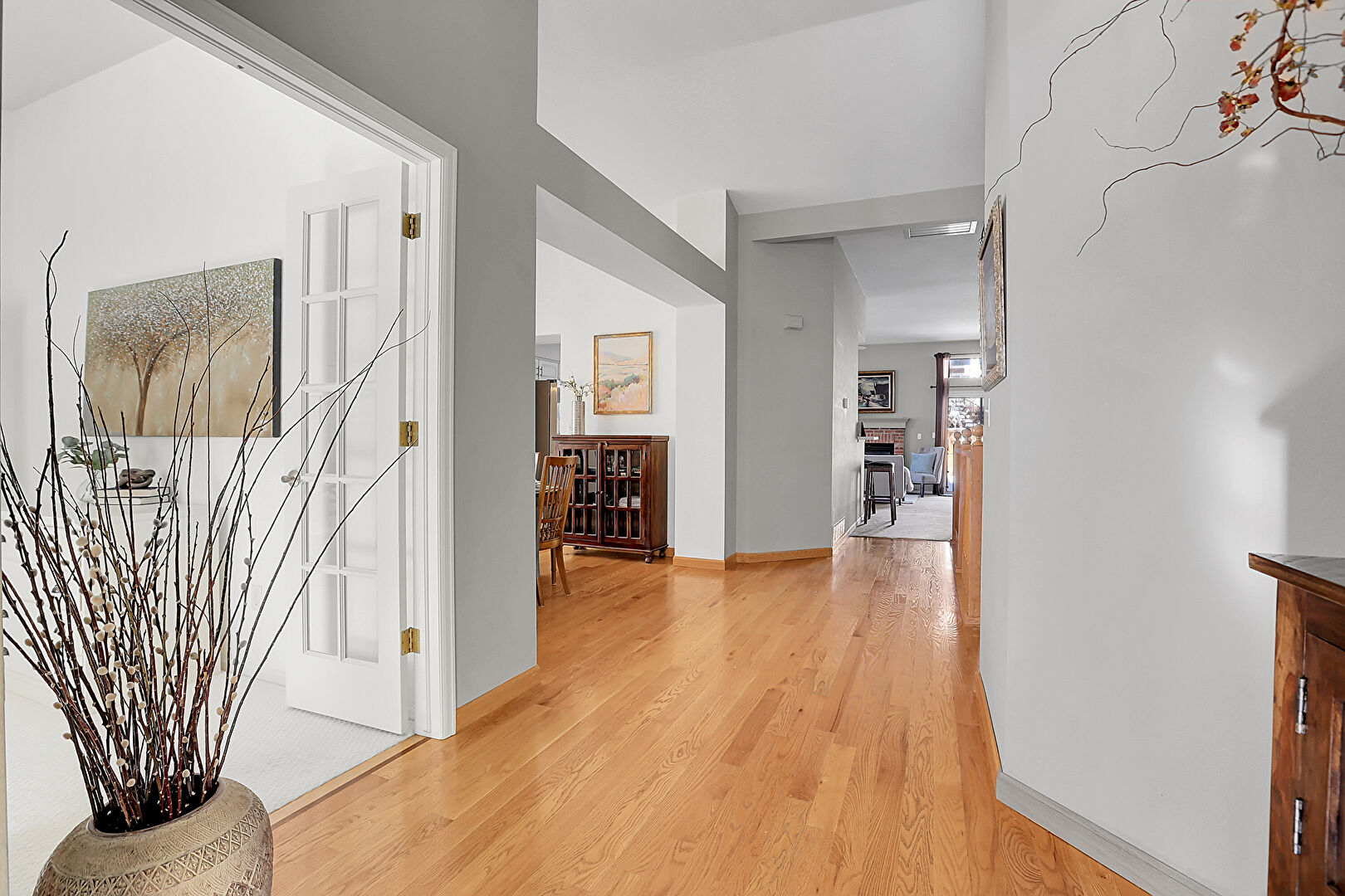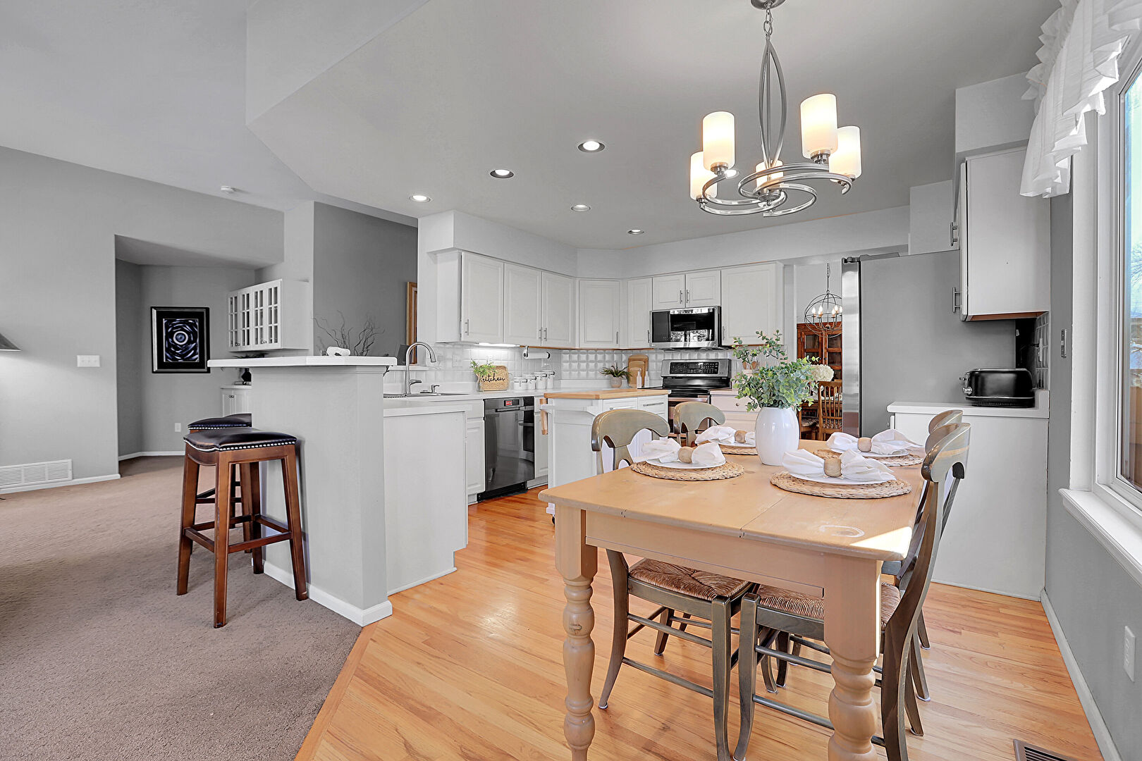 Baseboards Wall, Cathedral Ceiling, Drywall, French Doors, Natural Light, Notable Chandelier, Recessed Lighting, Vaulted Ceiling, Vent, Wood Finish Floor, High Ceiling, U Shaped Kitchen, Vent, Wood Finish Floor