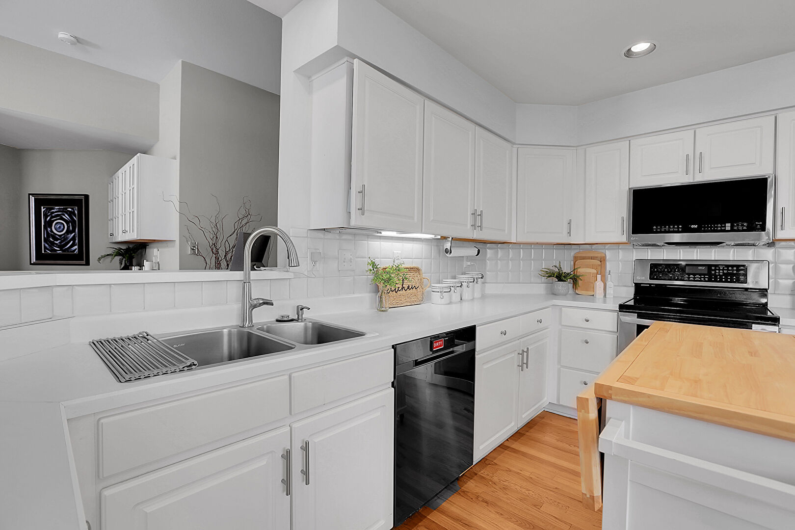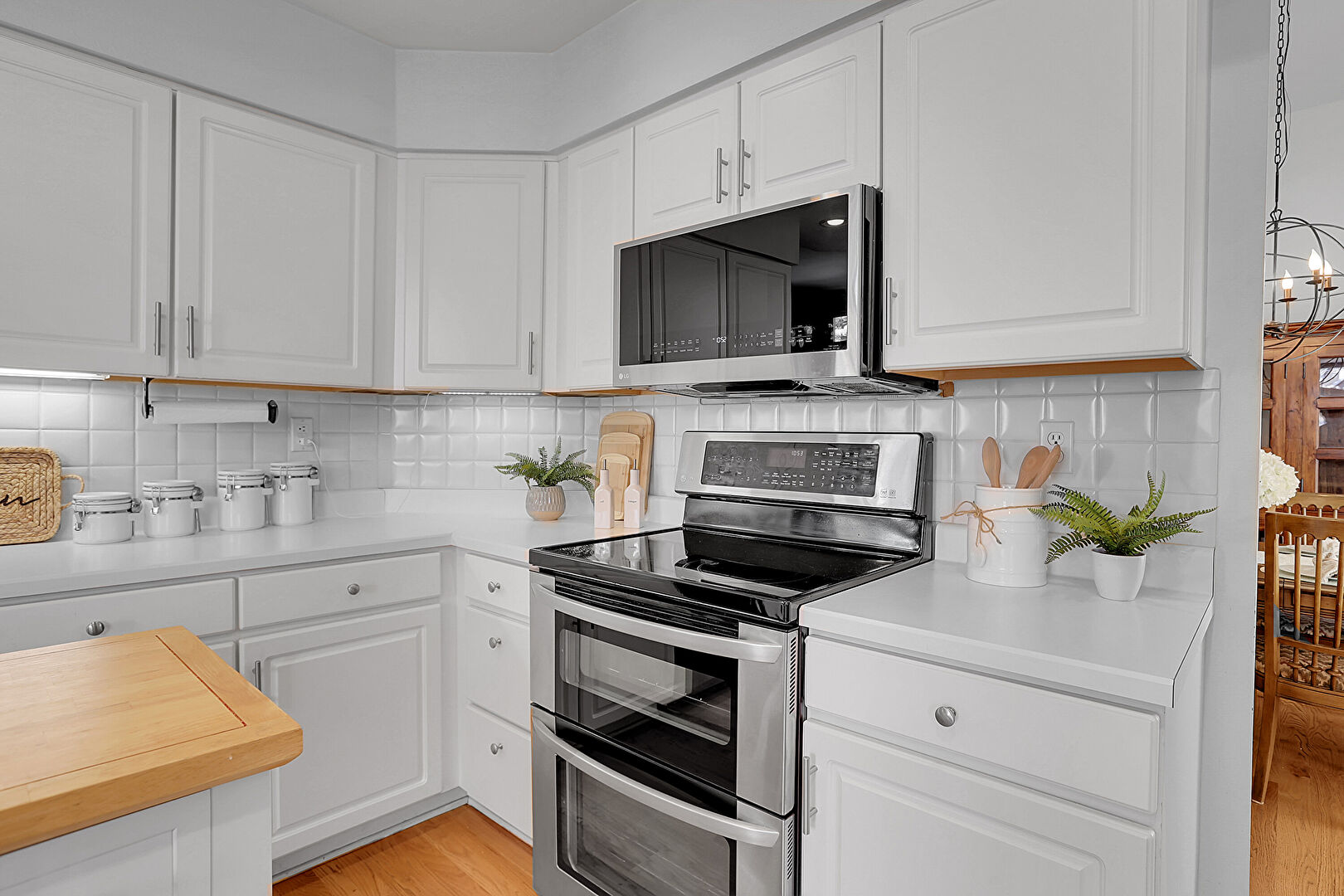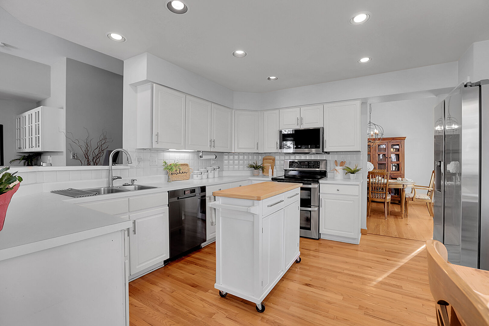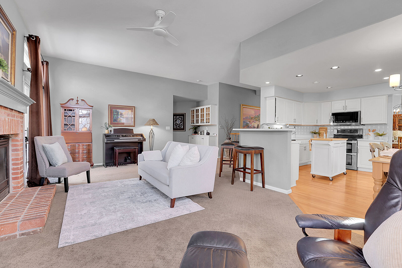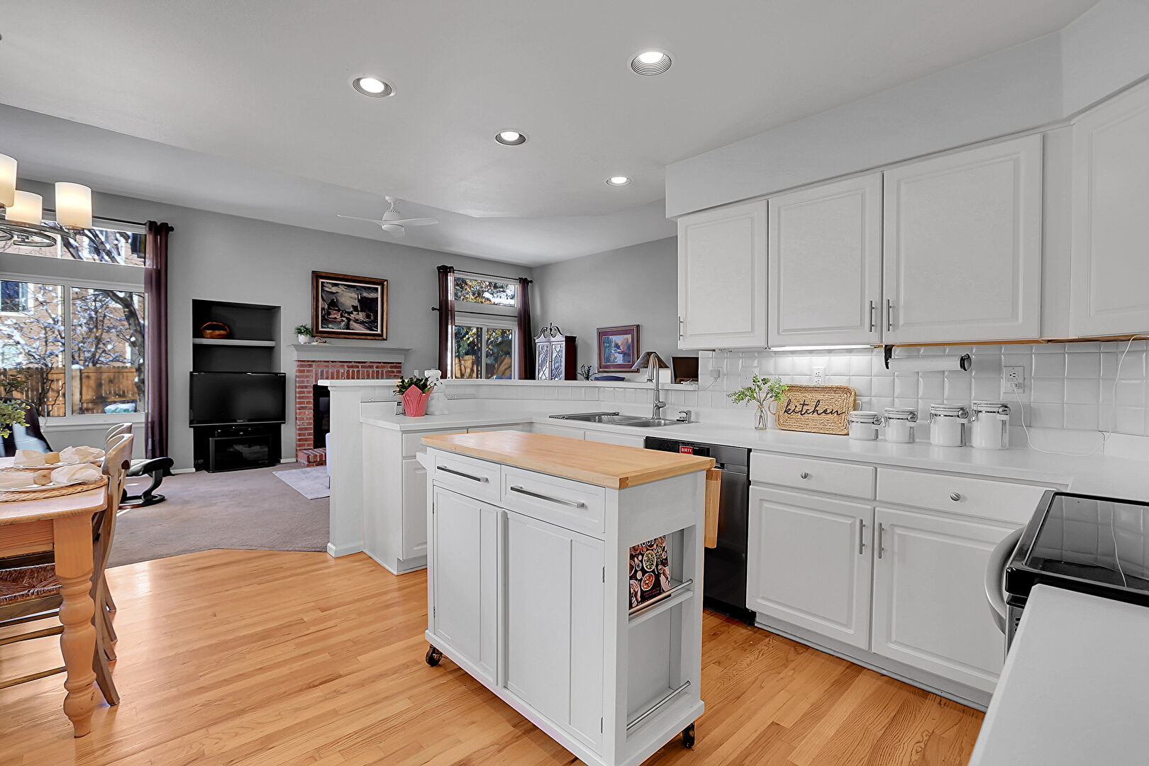 Butcher Block Countertops, Ceiling Fan, Drywall, Fireplace, Kitchen Island, Natural Light, Notable Chandelier, Raised Cabinets, Recessed Lighting, Stone Countertops, Wood Finish Floor, Drywall, Kitchen Peninsula, Raised Cabinets, Stone Countertops