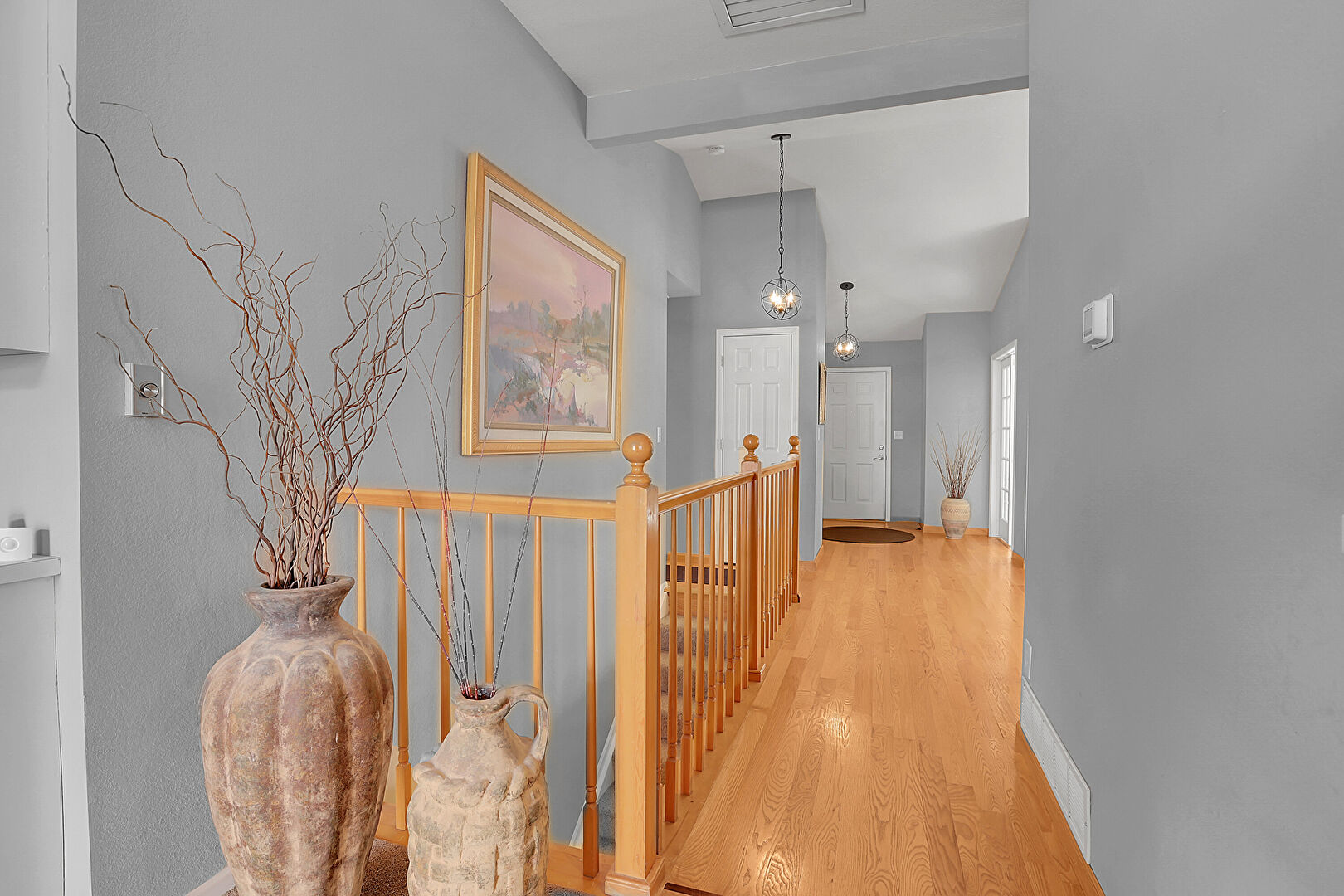 Baseboards Wall, Beamed Ceiling, Drywall, High Ceiling, Upstairs Landing, Wood Finish Floor, Baseboards Wall, Vaulted Ceiling