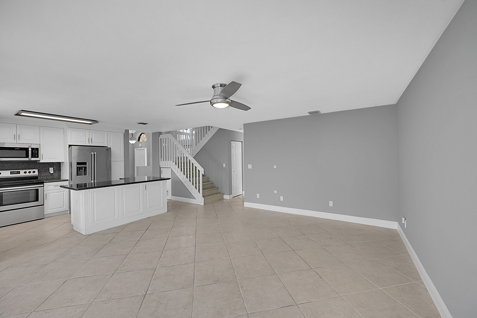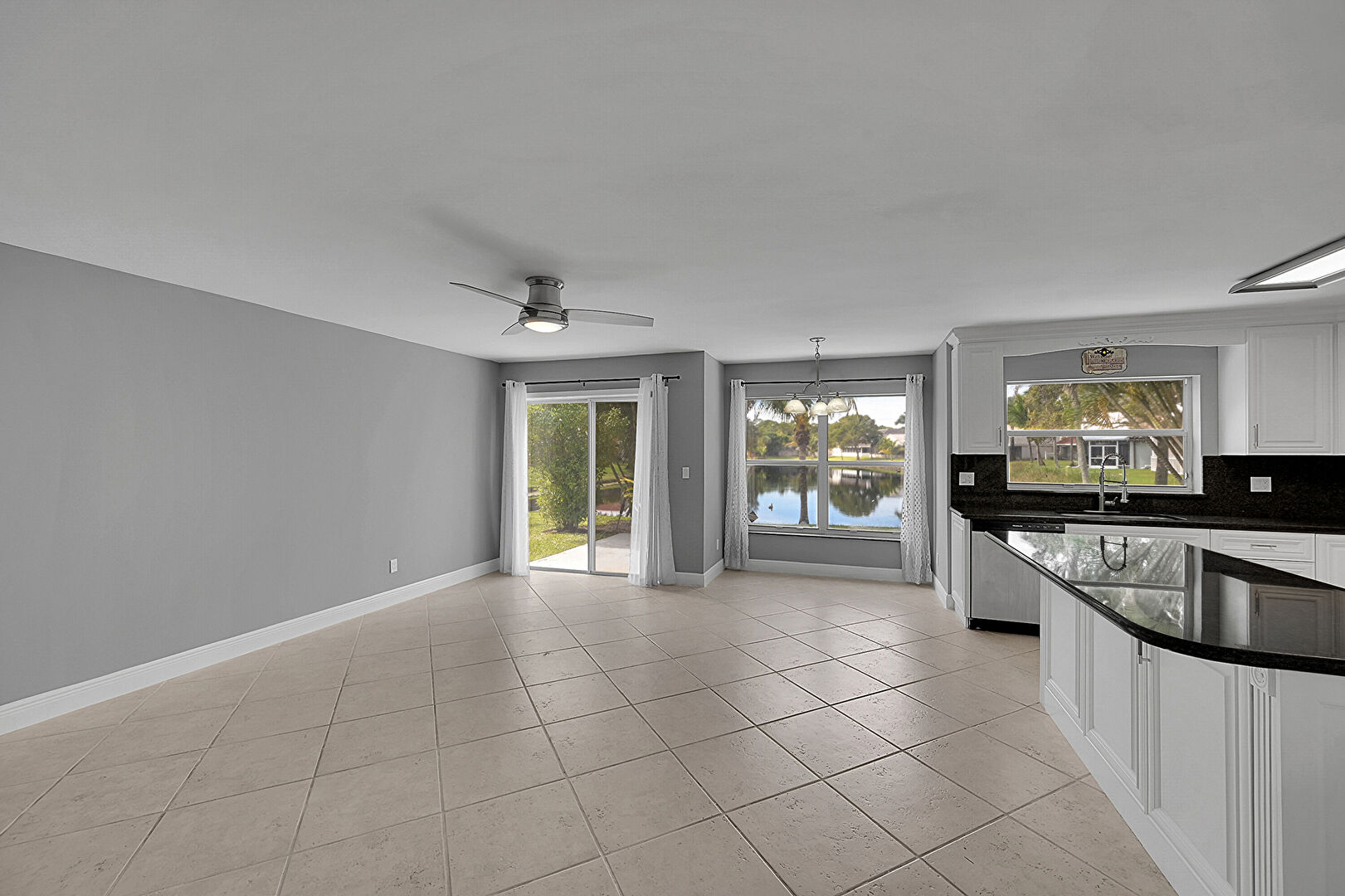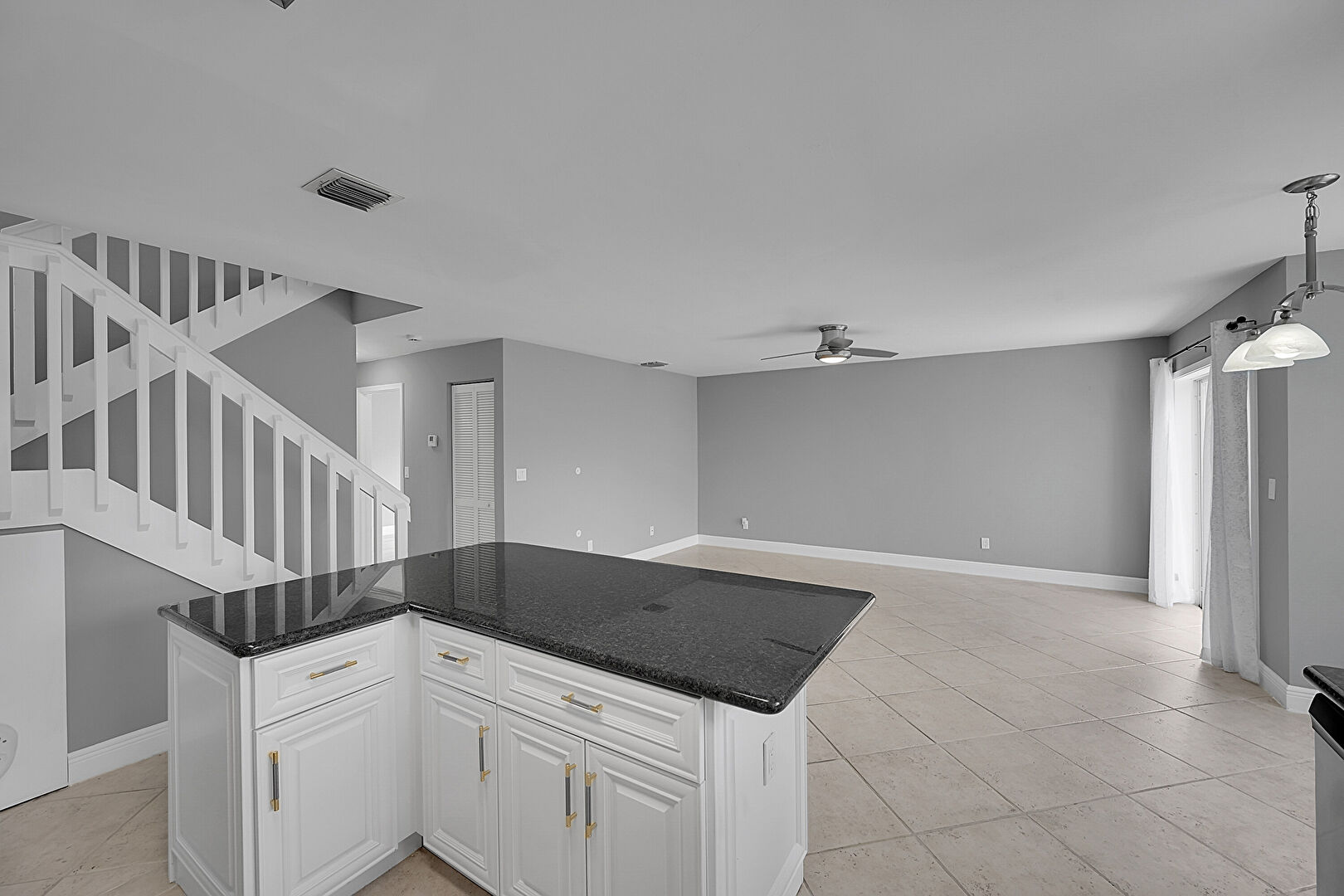 Baseboards Wall, Ceiling Fan, Drywall, Kitchen Island, L Shaped Kitchen, Natural Light, Notable Chandelier, Opens To Living Area, Pendant Lighting, Raised Cabinets, Stone Countertops, Tile Floor, Vent, Water View, Waterfront, Ceiling Fan, Notable Chandelier, Opens To Living Area, Vent