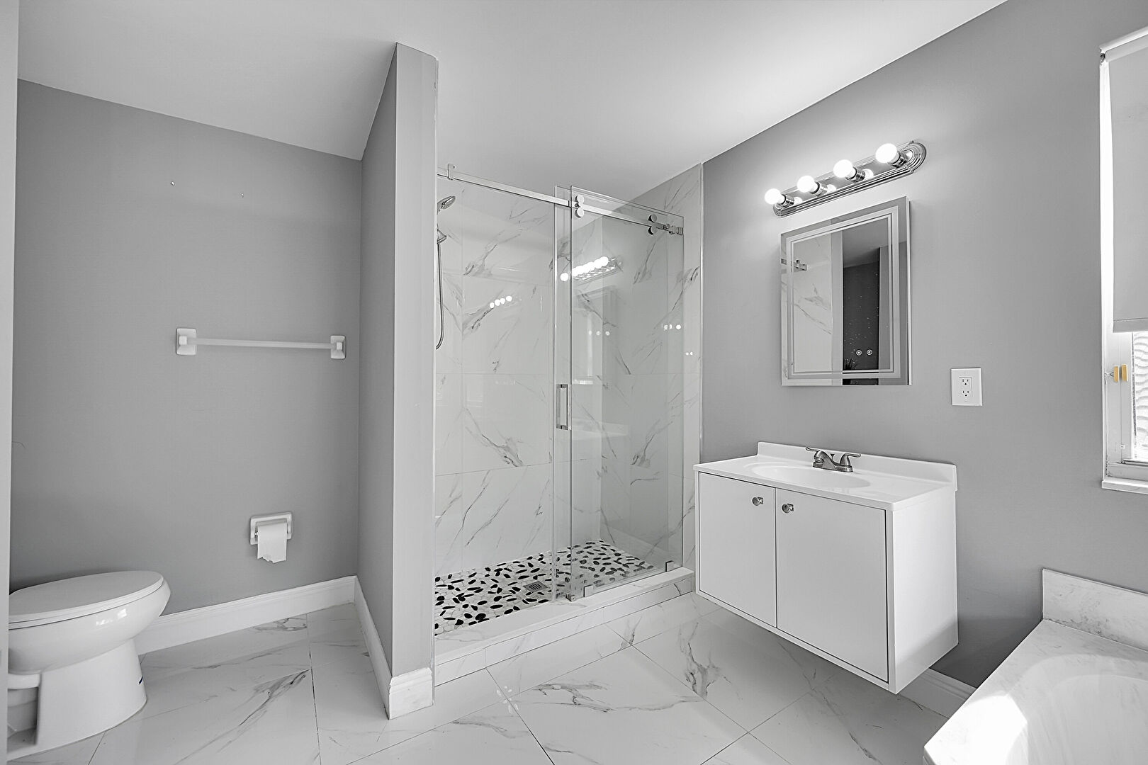 Baseboards Wall, Drywall, Full Bathroom, Marble Finish Floor, Natural Light, Vanity, Full Bathroom, Marble Finish Floor