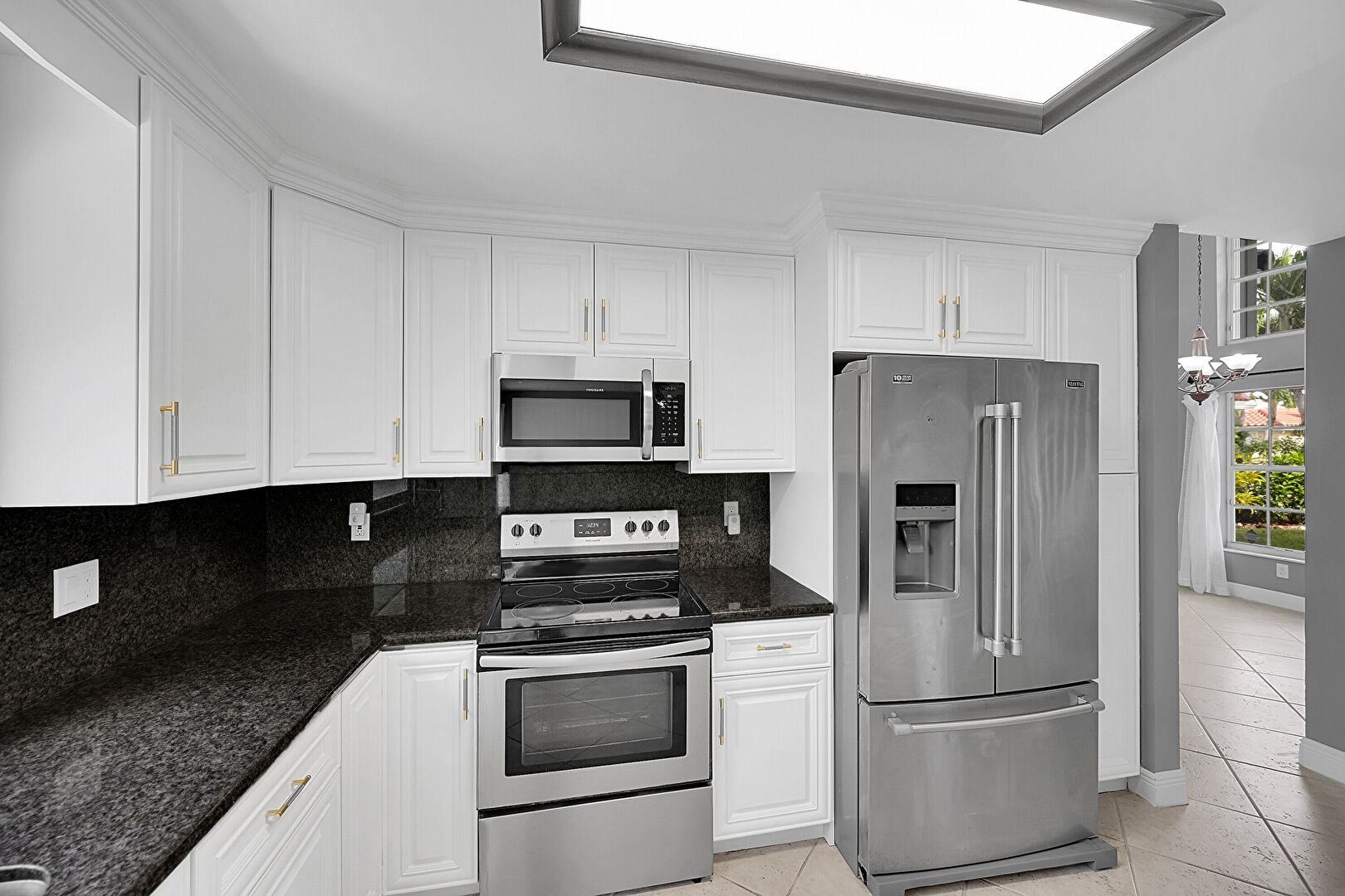 Barn Door, Baseboards Wall, Ceiling Fan, Crown Molding Cabinets, Drywall, Kitchen Island, L Shaped Kitchen, Natural Light, Notable Chandelier, Opens To Living Area, Pendant Lighting, Raised Cabinets, Stone Countertops, Tile Floor, Vent, Water View, Drywall, L Shaped Kitchen, Natural Light, Stone Countertops, Tile Floor, Water View