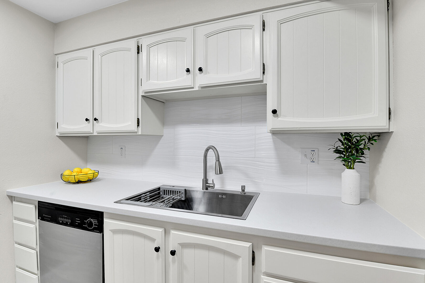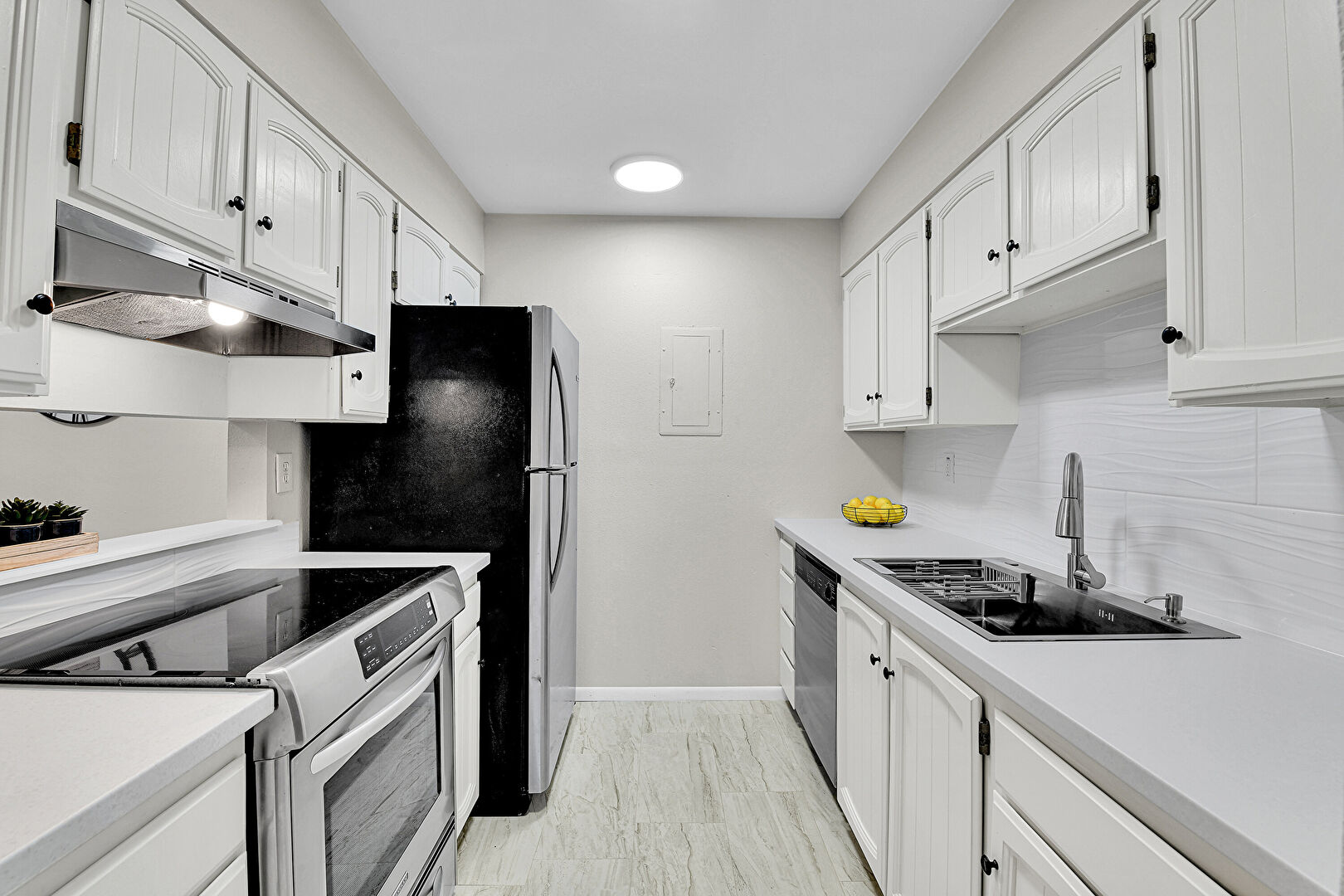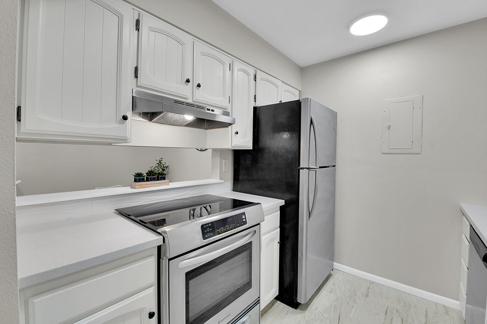 Arched Cabinets, Baseboards Wall, Drywall, Electric Panel, Marble Finish Floor, Open Shelves, Pass Through Window, Shaker Cabinets, Stone Countertops, Visible Hinge Cabinets, Arched Cabinets, Shaker Cabinets