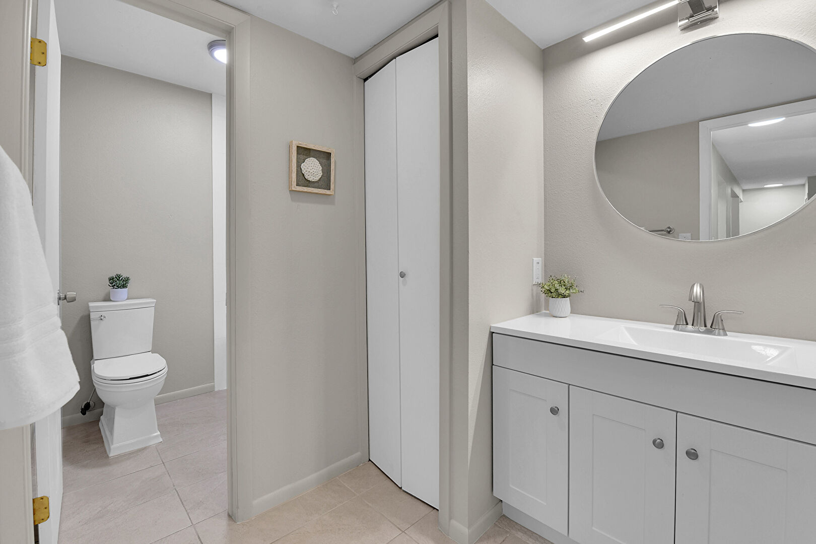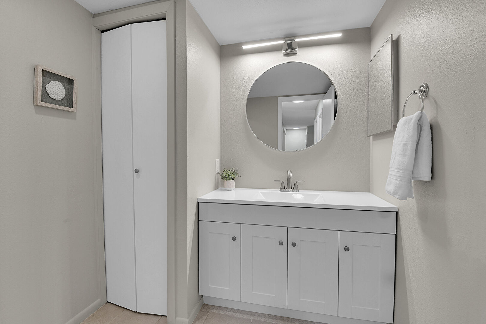 Baseboards Wall, Closet, Combined Bath Shower, Drywall, Full Bathroom, Tile Floor, Vanity, Baseboards Wall, Full Bathroom