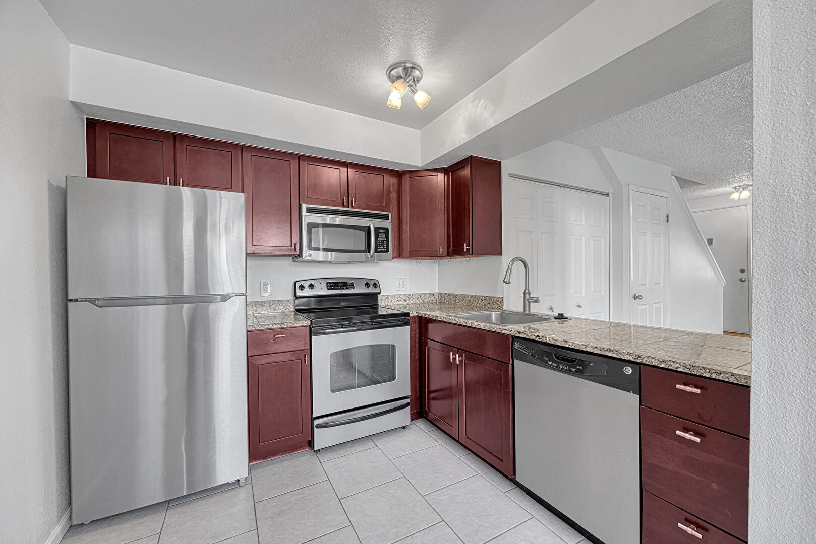 Baseboards Wall, Drywall, Natural Light, Pass Through Window, Pendant Lighting, Reddish Brown Cabinets, Shaker Cabinets, Stone Tile Countertops, Textured Ceiling, Tile Floor, Vent, L Shaped Kitchen, Stone Countertops