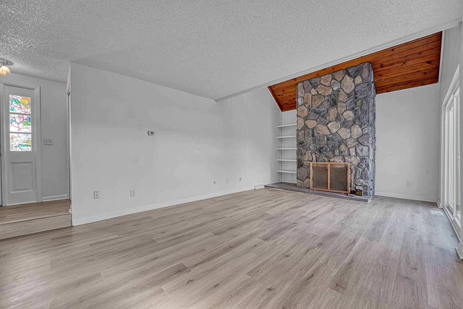 Baseboards Wall, Built In Shelves, Drywall, Fireplace, Natural Light, Textured Ceiling, Wood Finish Floor, Vaulted Ceiling