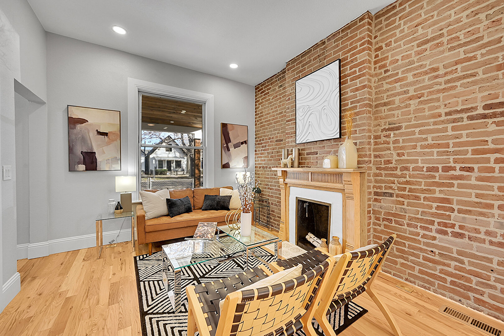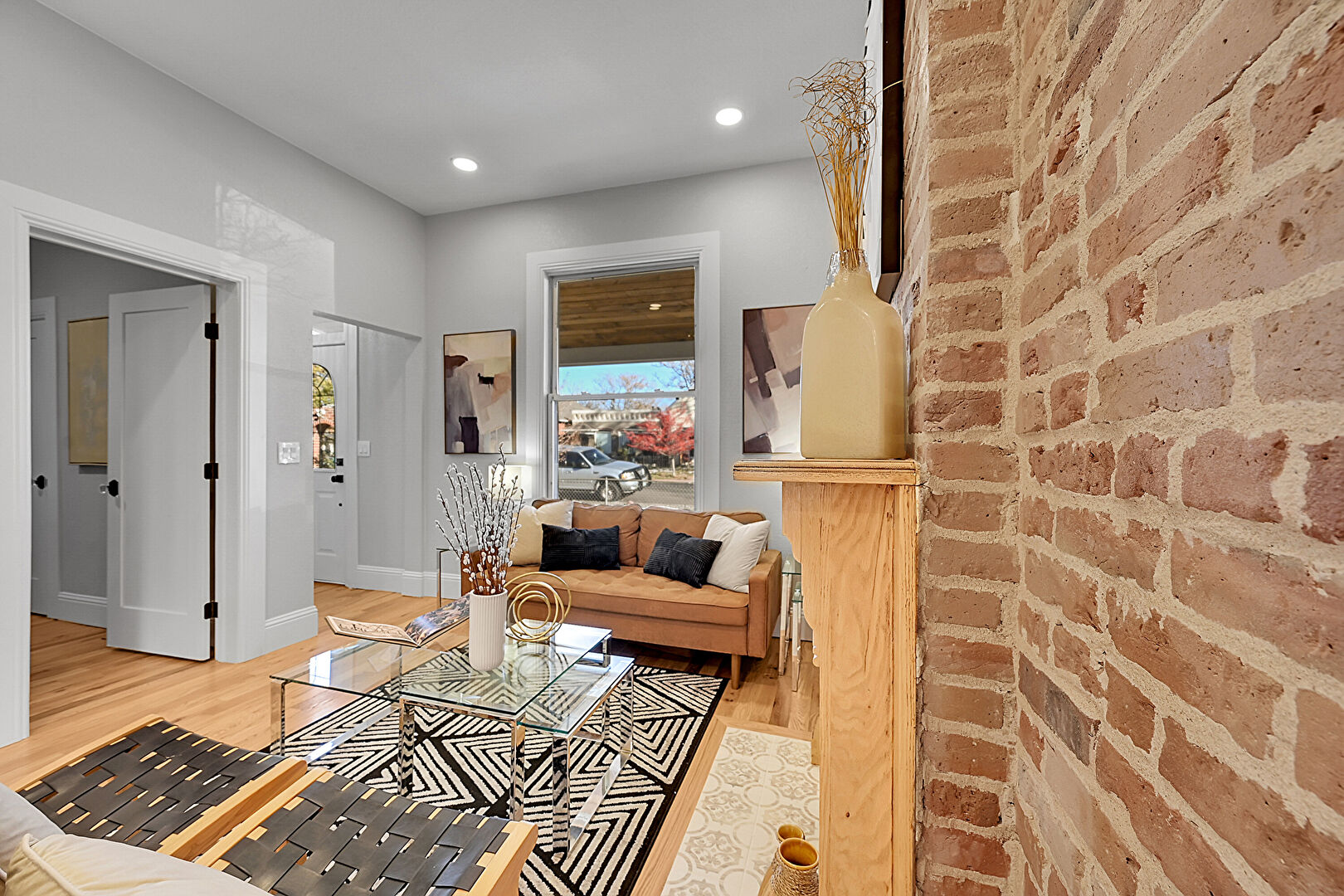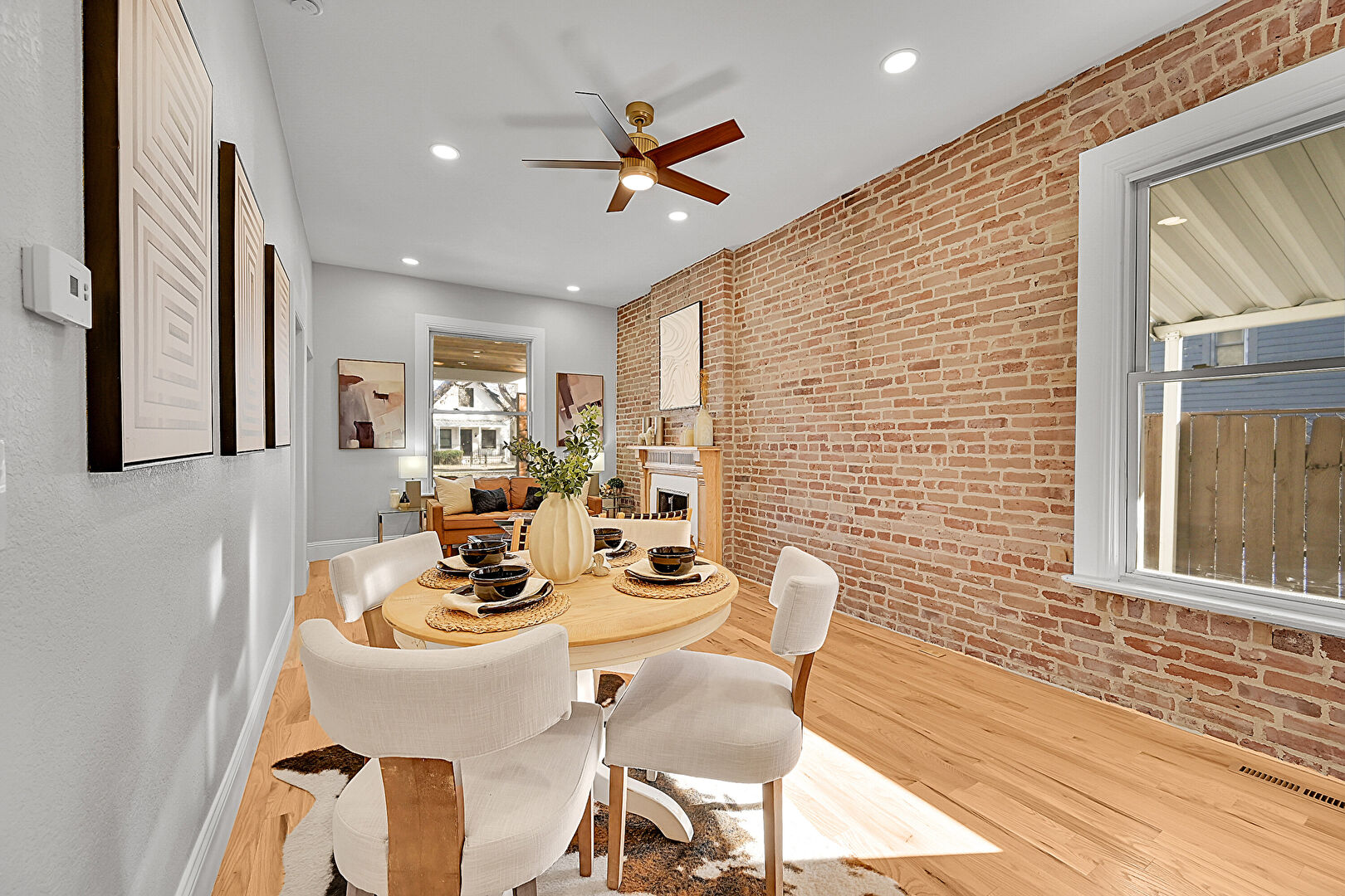 Accent Wall, Baseboards Wall, Brick Wall, Ceiling Fan, Drywall, Natural Light, Recessed Lighting, Stairs, Vent, Wood Finish Floor, Fireplace, Natural Light, Wood Finish Floor