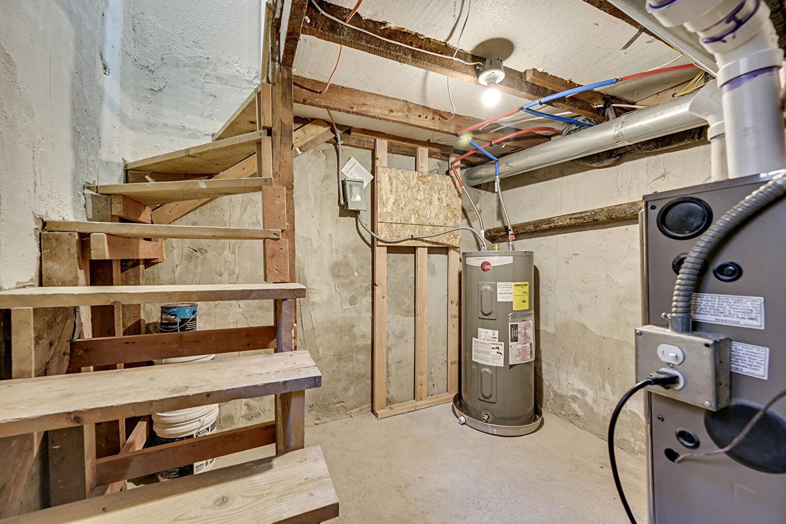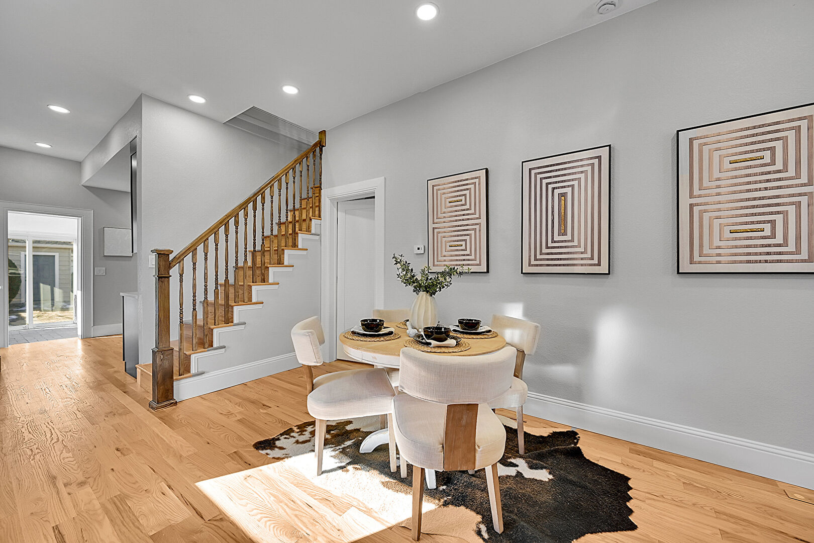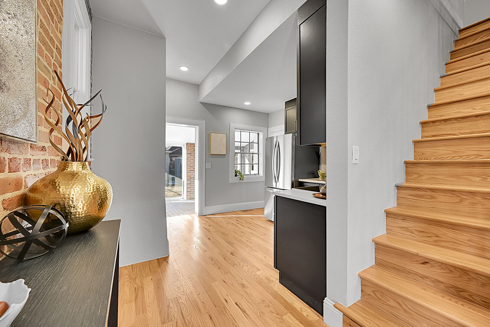 Baseboards Wall, Brick Wall, Drywall, Natural Light, Recessed Lighting, Wood Finish Floor, Stairs