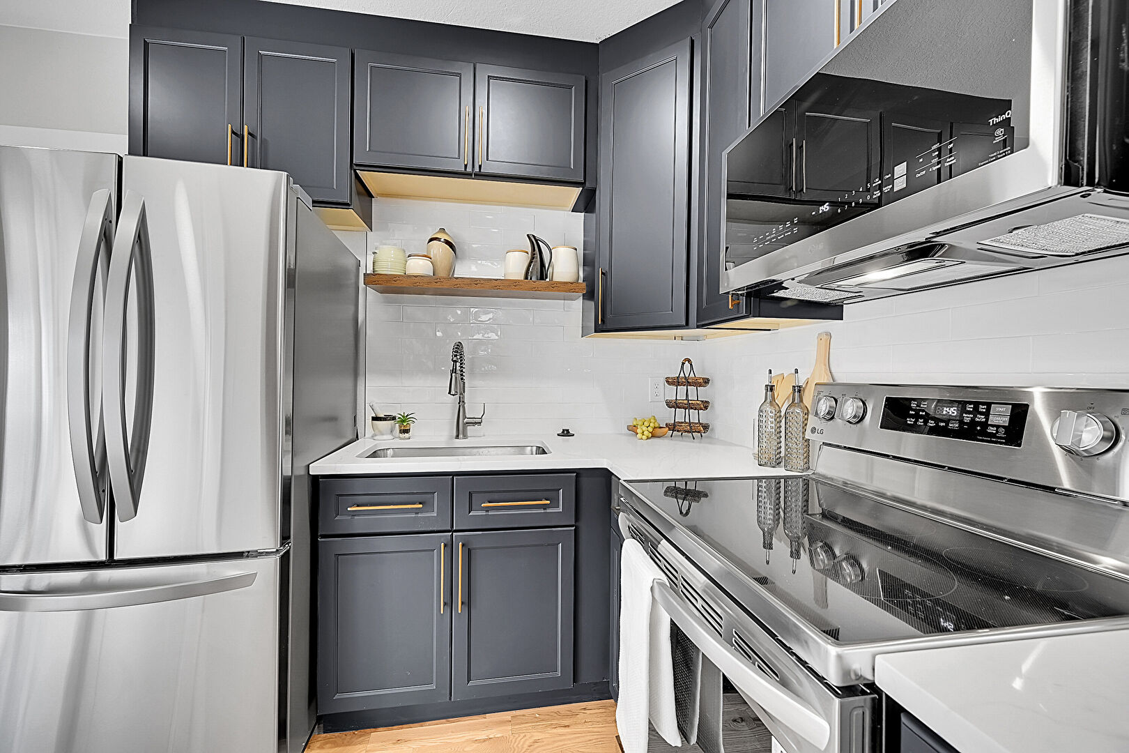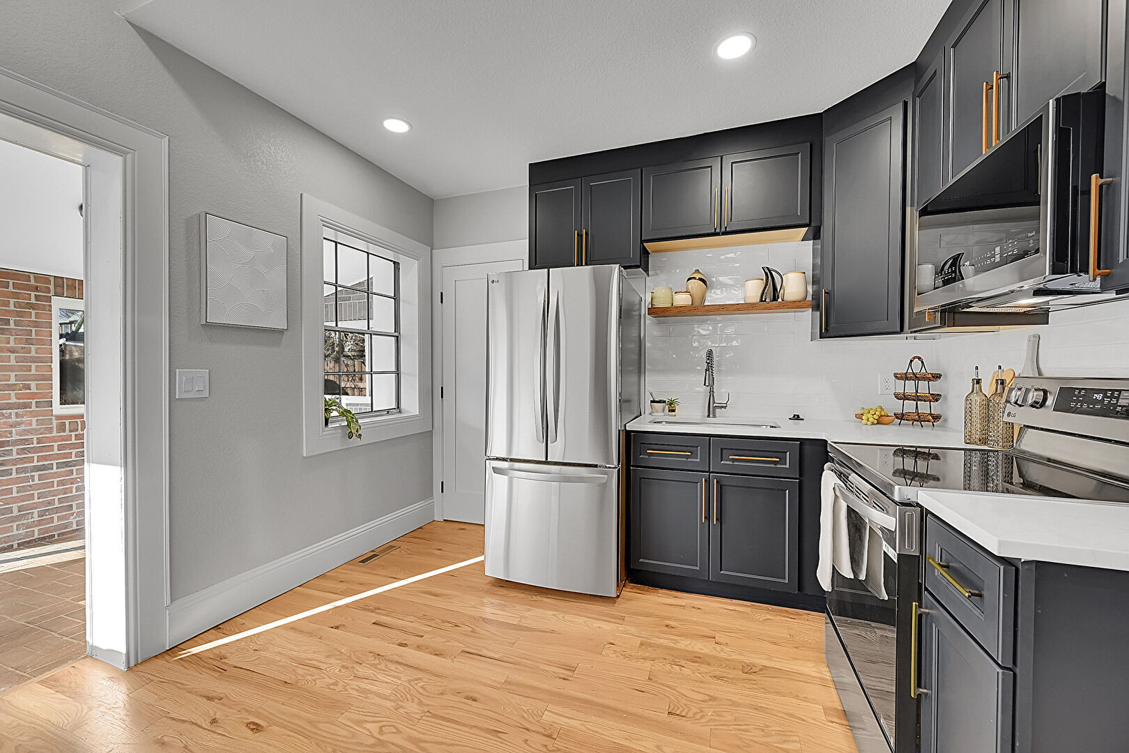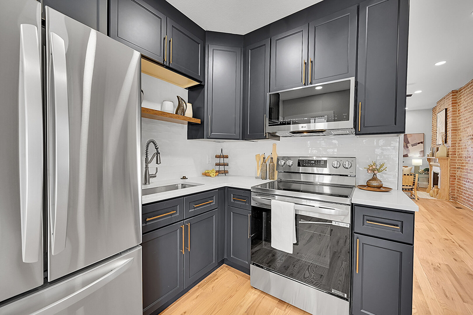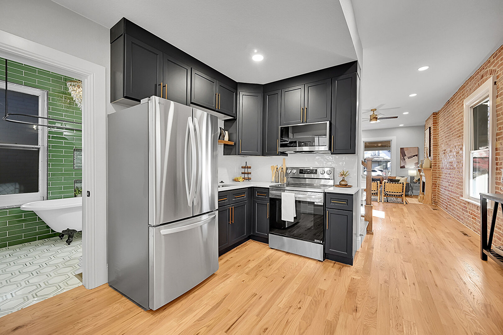 Accent Wall, Baseboards Wall, Black Cabinets, Brick Wall, Ceiling Fan, Drywall, Gray Cabinets, Natural Light, Open Shelves, Recessed Lighting, Shaker Cabinets, Stone Countertops, Wood Finish Floor, Gray Cabinets, Open Shelves, Recessed Lighting, Shaker Cabinets