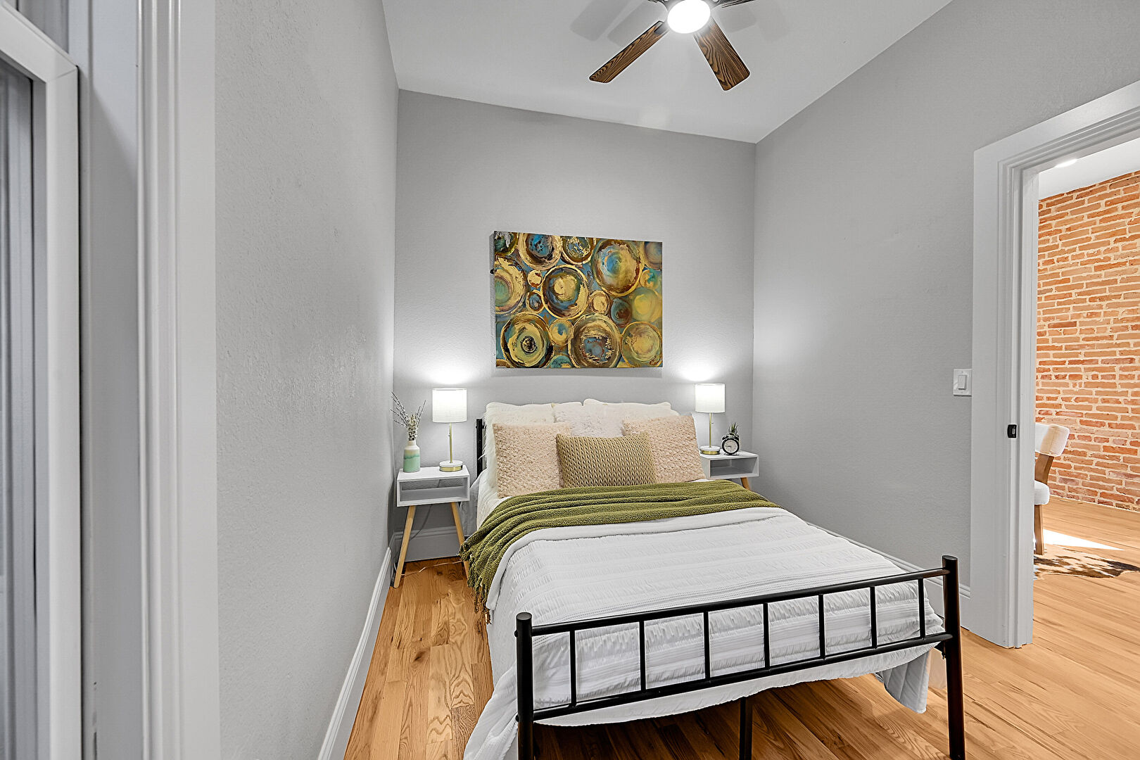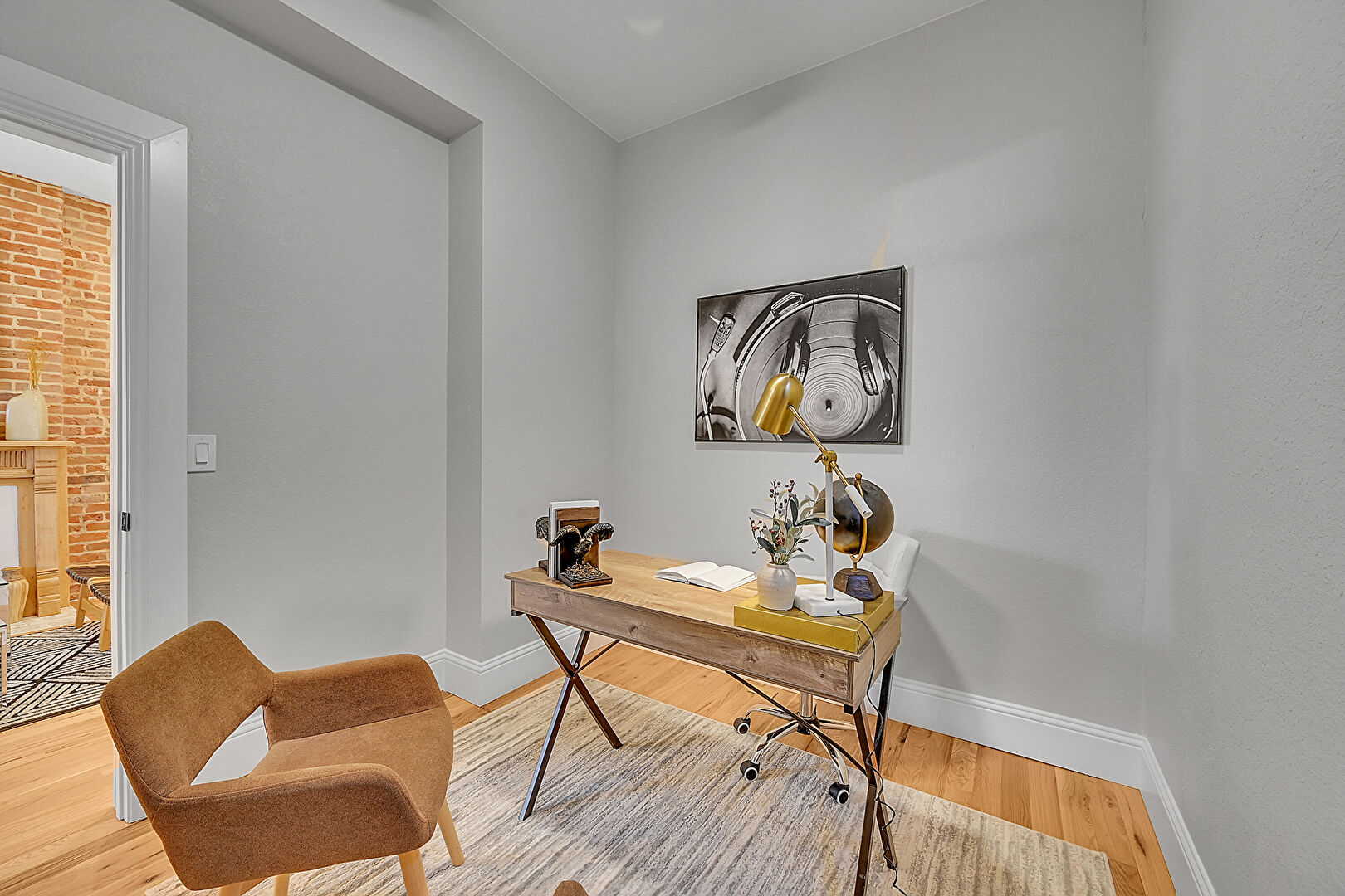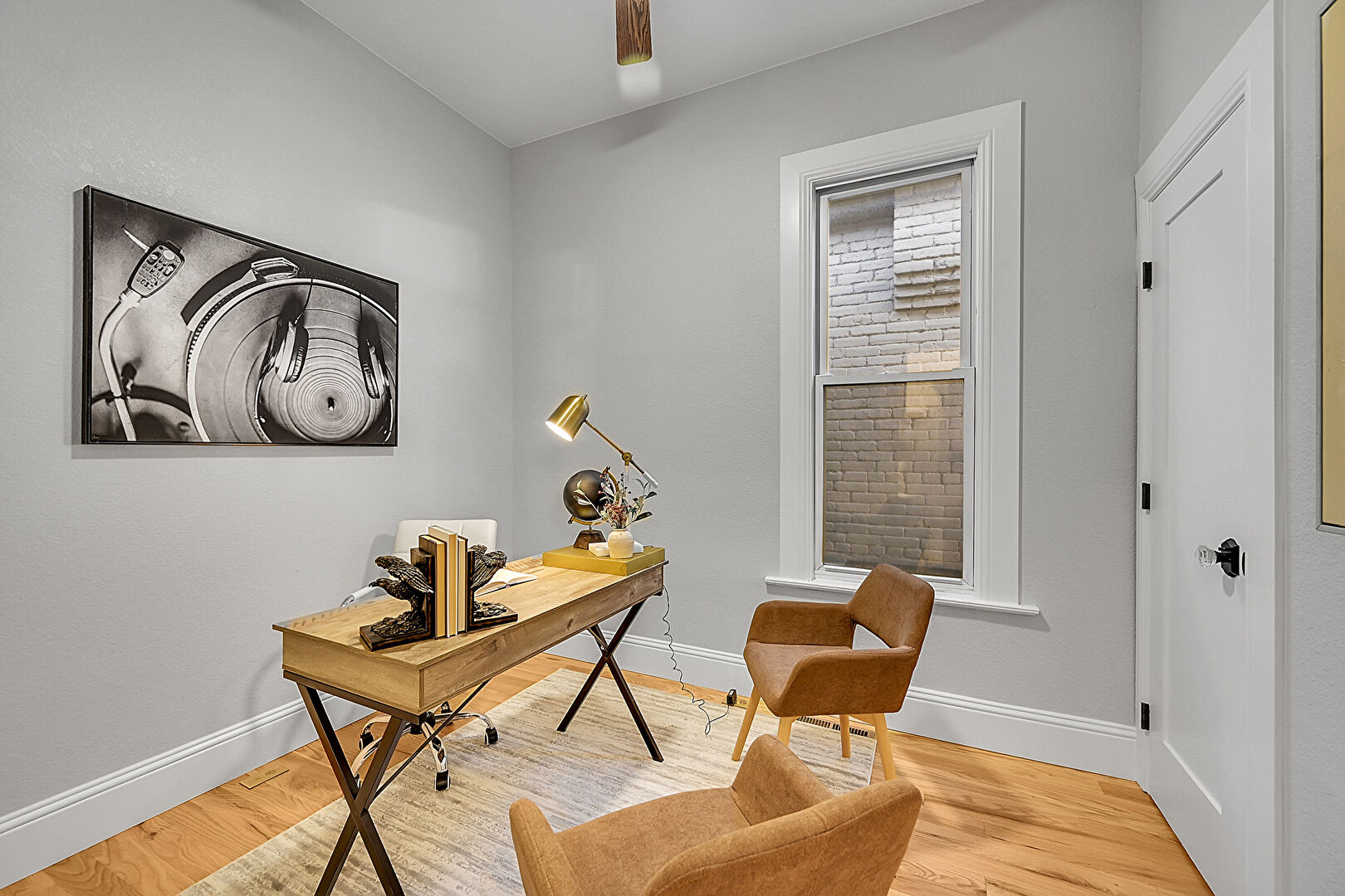 Baseboards Wall, Brick Wall, Ceiling Fan, Drywall, Natural Light, Office Area, Vent, Wood Finish Floor, Baseboards Wall, Wood Finish Floor