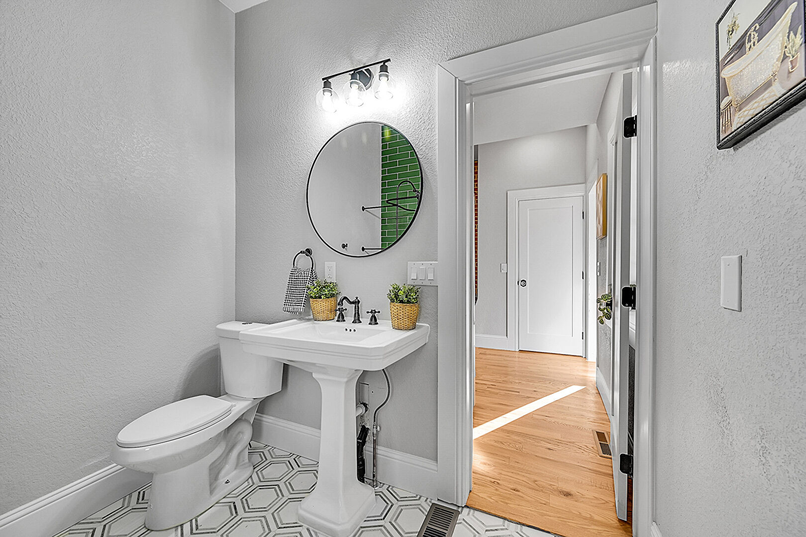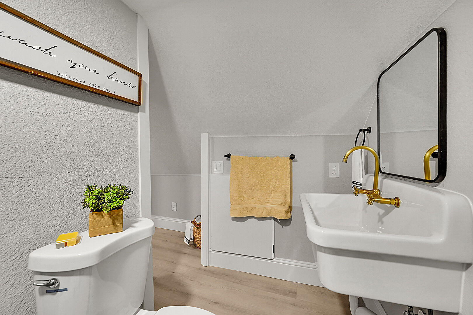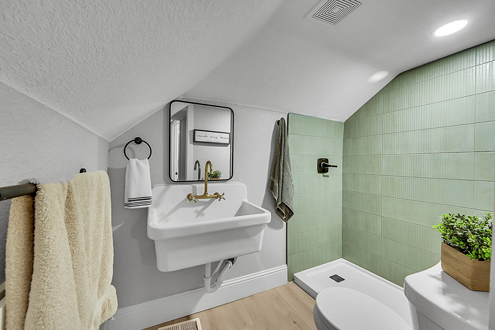 Baseboards Wall, Full Bathroom, Textured Ceiling, Textured Wall, Vaulted Ceiling, Vent, Wood Finish Floor, Half Bathroom, Textured Wall