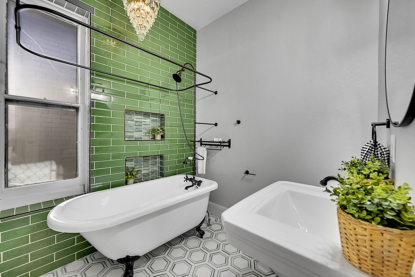 Baseboards Wall, Combined Bath Shower, Drywall, Full Bathroom, Half Bathroom, Textured Wall, Tile Floor, Tile Wall, Vent, Notable Chandelier, Wood Finish Floor