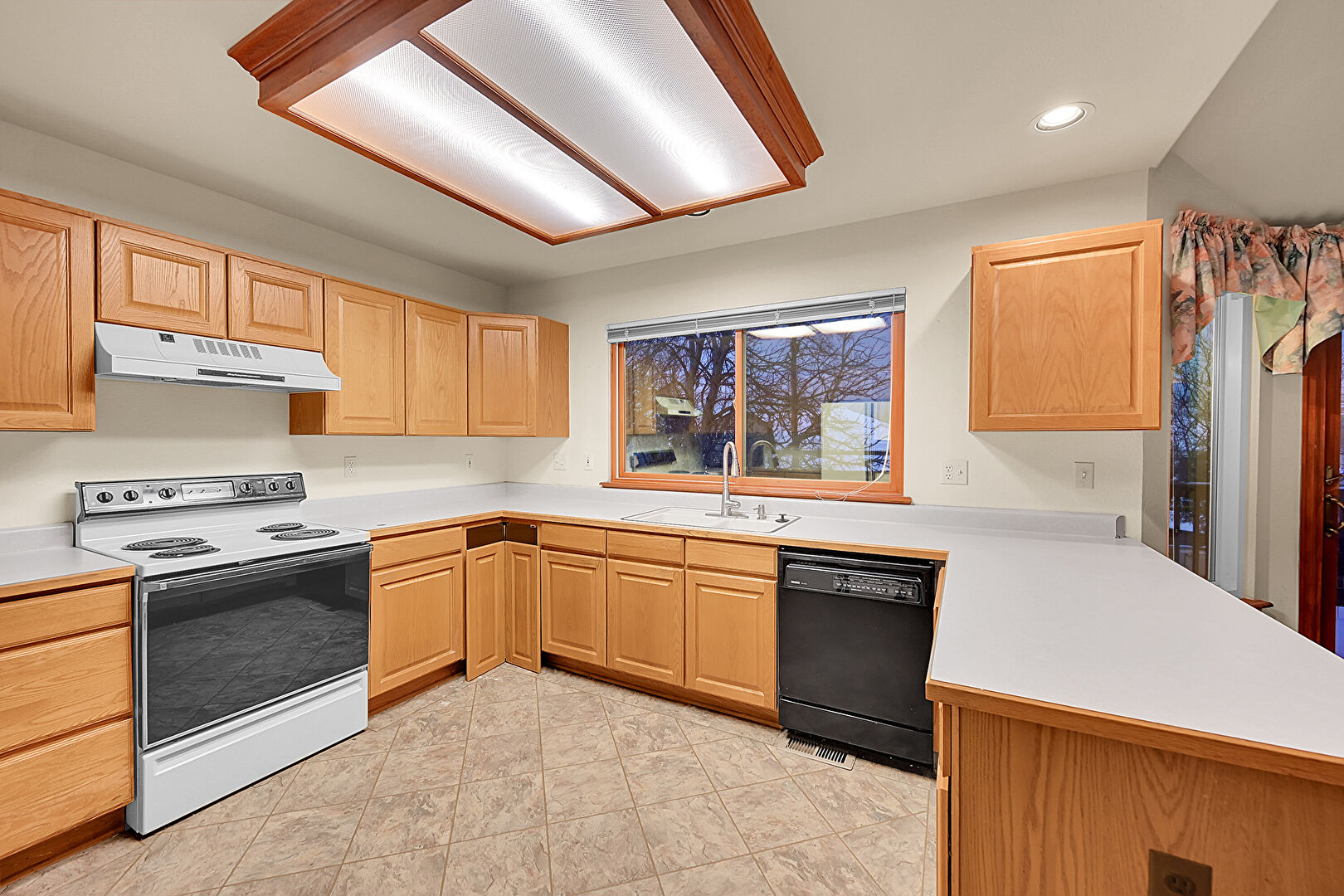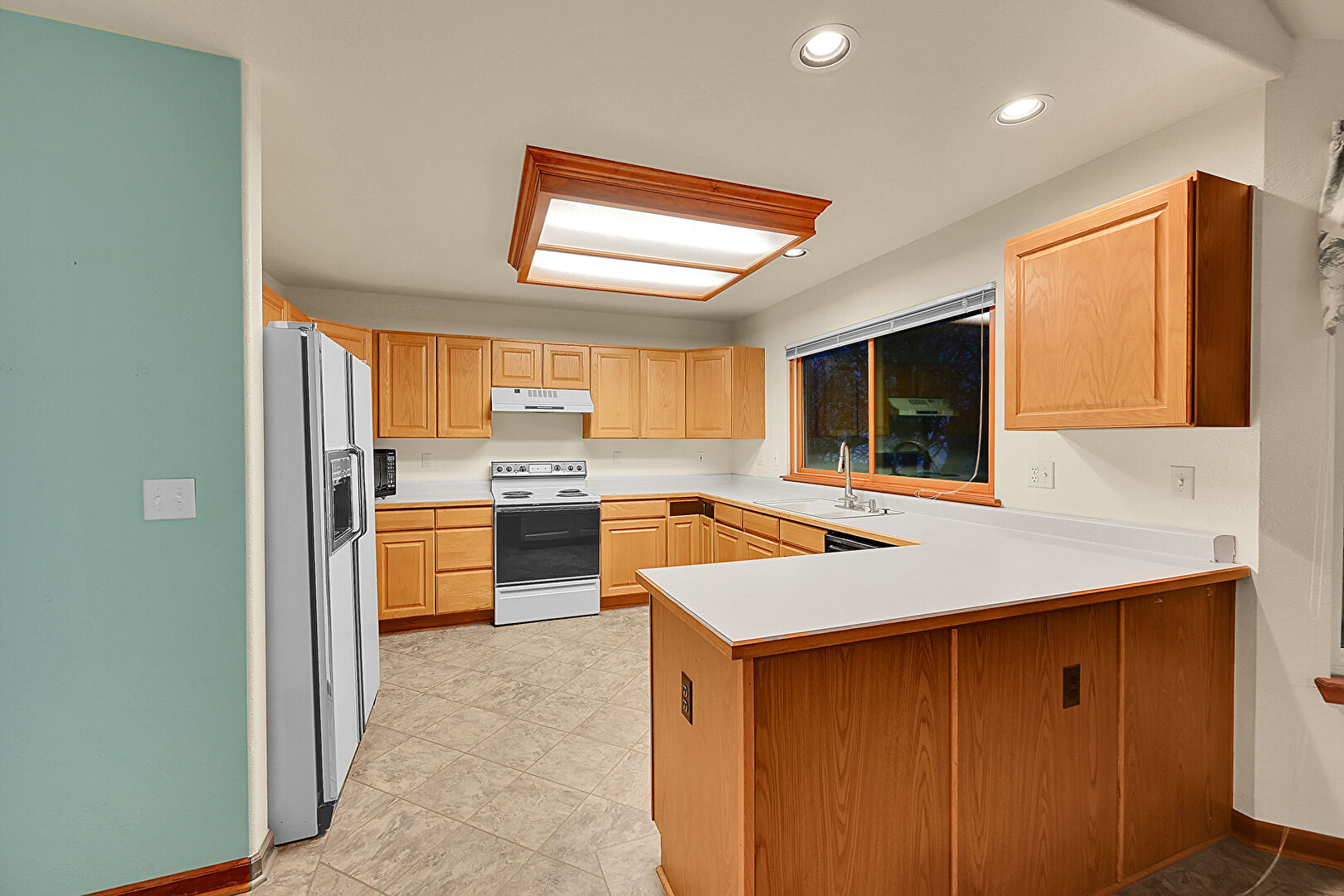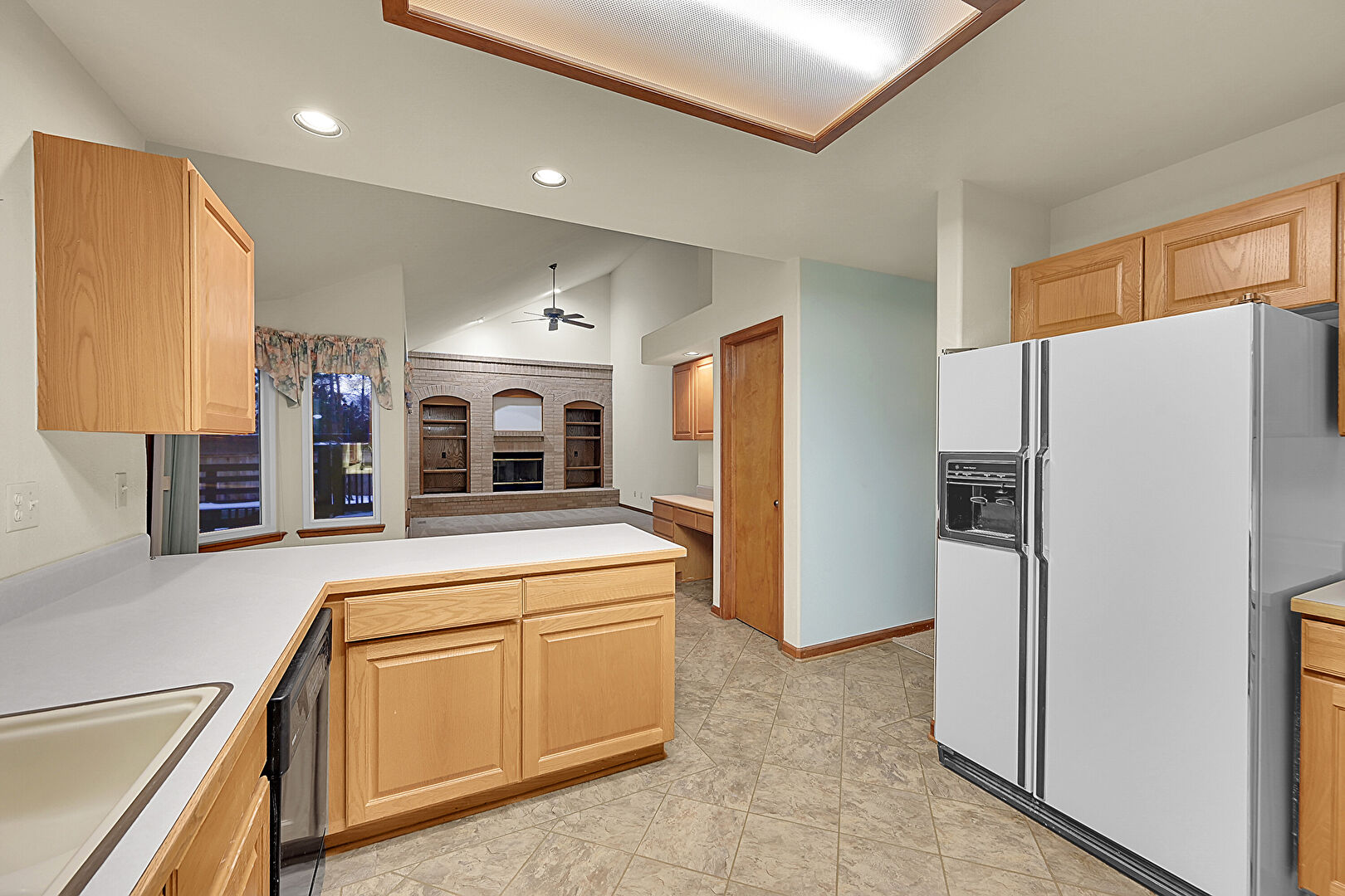 Baseboards Wall, Ceiling Fan, Drywall, Fireplace, G Shaped Kitchen, High Ceiling, Kitchen Peninsula, Medium Brown Cabinets, Natural Light, Opens To Living Area, Raised Cabinets, Recessed Lighting, Tile Floor, Vaulted Ceiling, Vent, G Shaped Kitchen, Natural Light, Raised Cabinets, Recessed Lighting