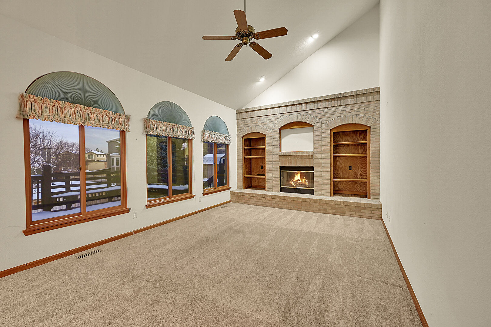 Baseboards Wall, Built In Shelves, Carpet, Ceiling Fan, Drywall, Fireplace, High Ceiling, Natural Light, Recessed Lighting, Vaulted Ceiling, Vent, Baseboards Wall, High Ceiling