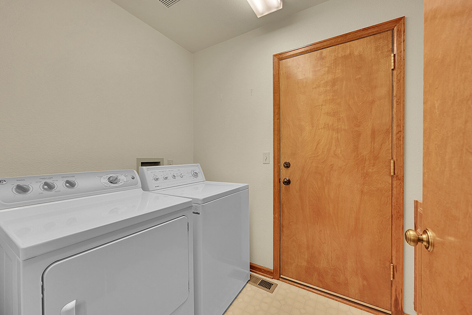 Baseboards Wall, Drywall, Laundry, Vaulted Ceiling, Vent, Vinyl Floor, Washer Hookup