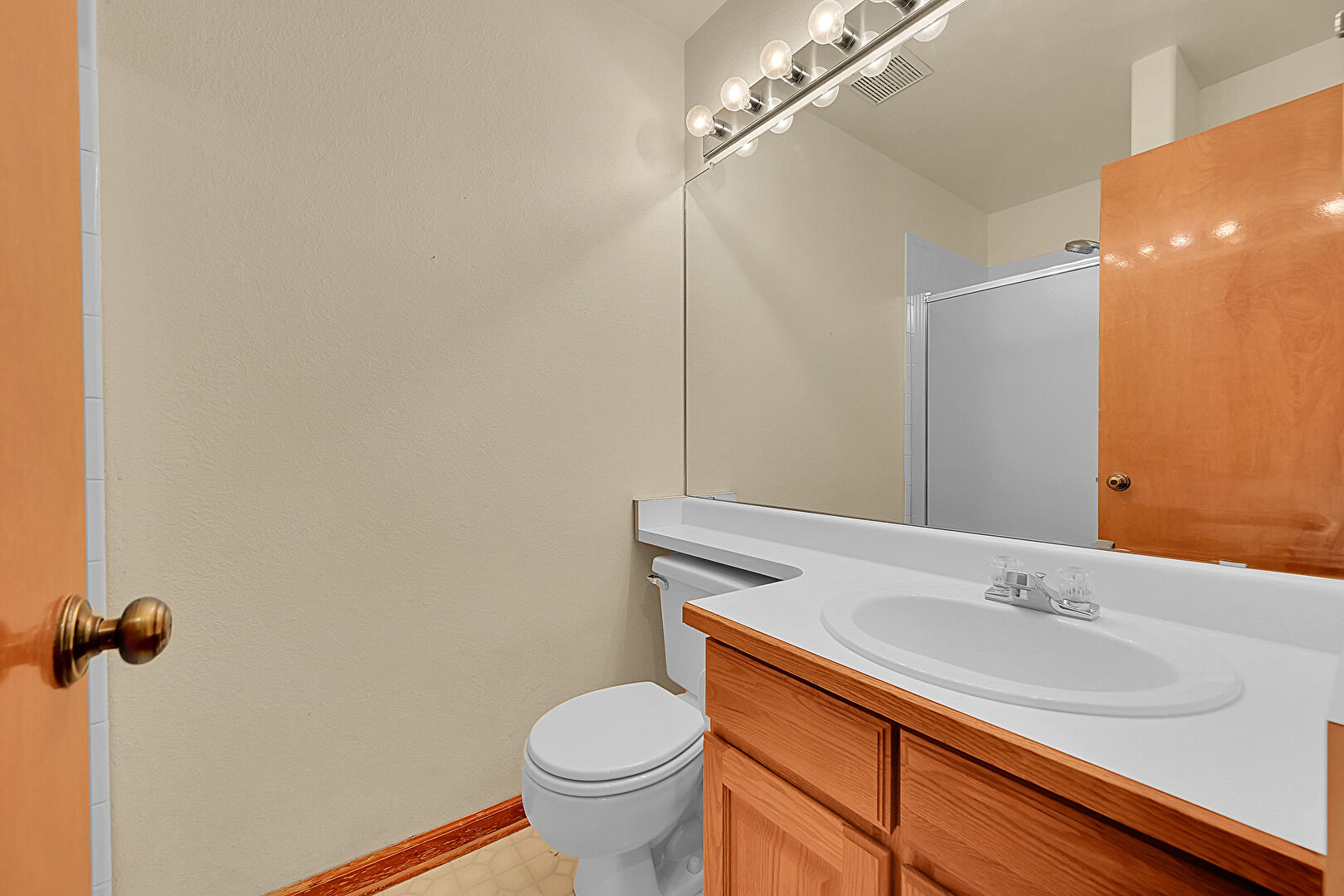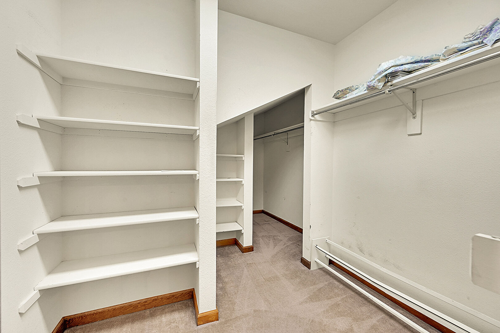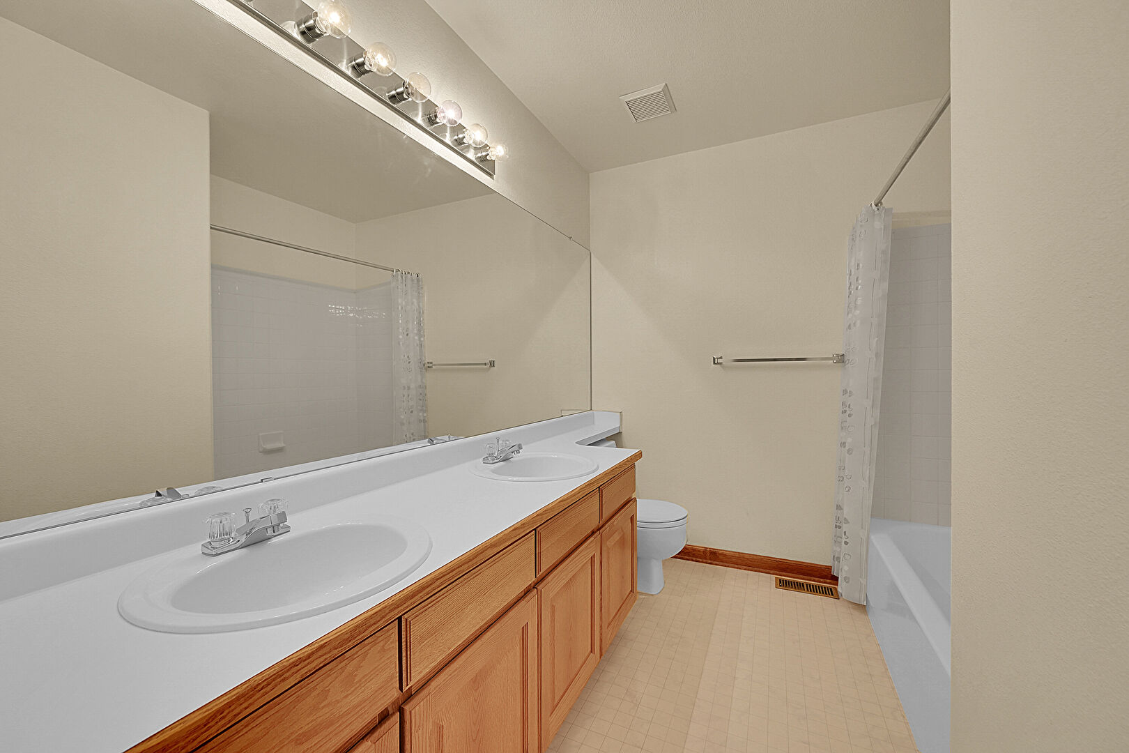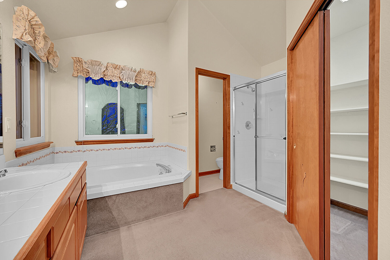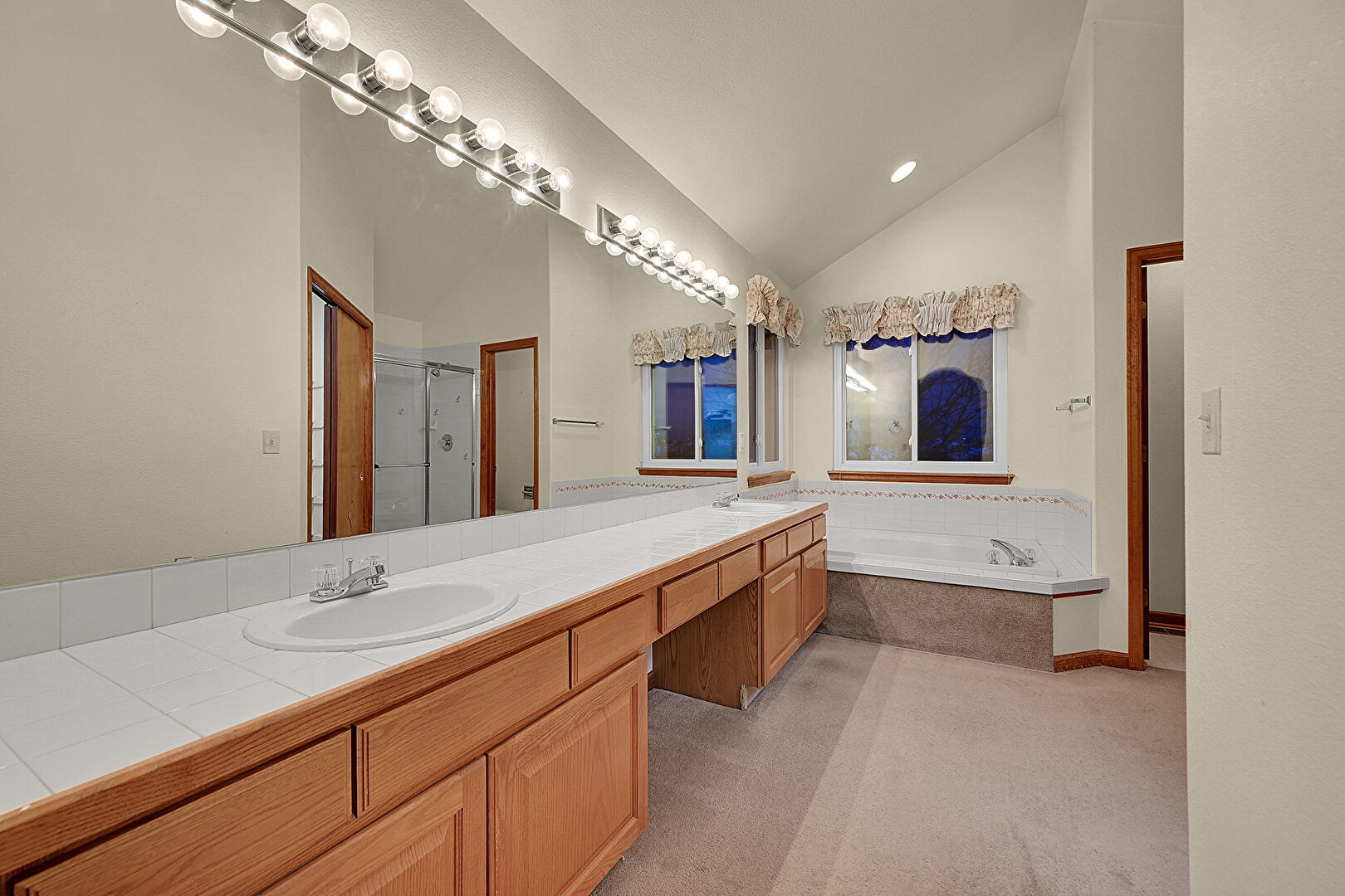 Baseboards Wall, Carpet, Closet, Combined Bath Shower, Double Vanity, Drywall, Full Bathroom, High Ceiling, Recessed Lighting, Vanity, Vaulted Ceiling, Vent, Vinyl Floor, Water Closet, Carpet, Double Vanity, Drywall, Full Bathroom