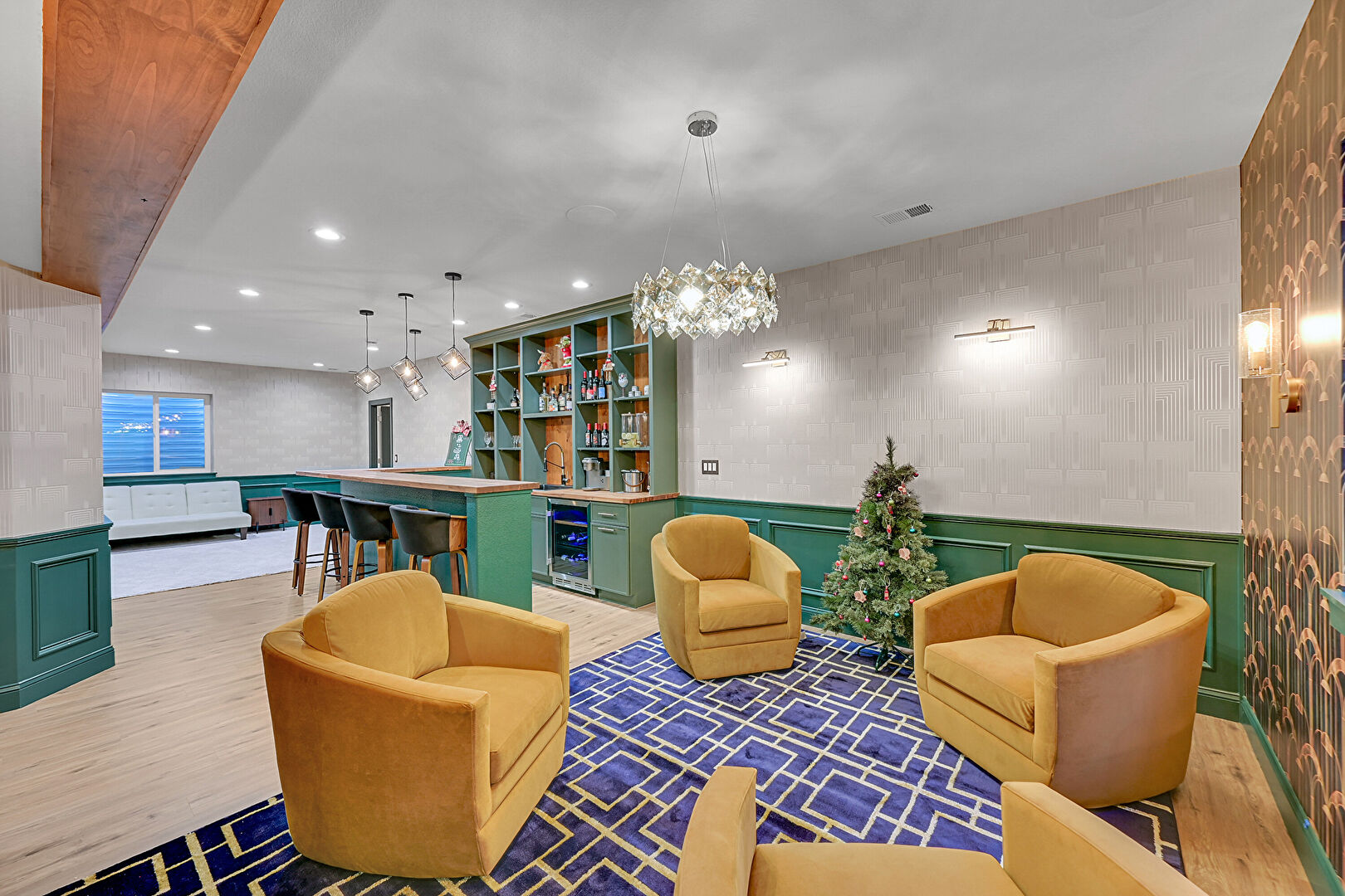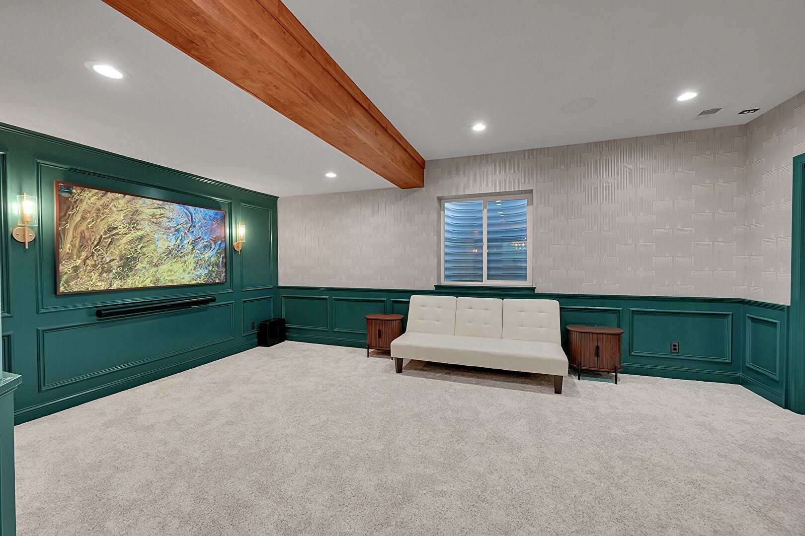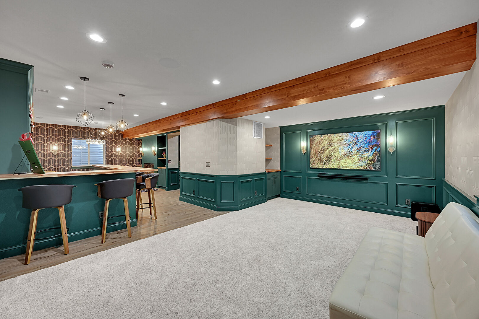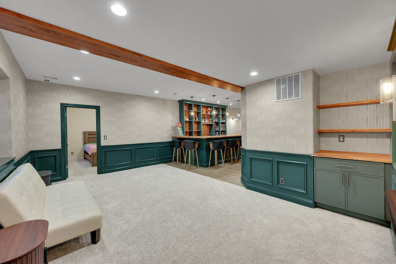 Accent Wall, Basement, Beamed Ceiling, Built In Shelves, Carpet, Fireplace, Indoor Bar, Natural Light, Notable Chandelier, Paneling Wall, Recessed Lighting, Vent, Wainscot Wall, Wallpaper Wall, Wood Finish Floor, Carpet, Fireplace, Indoor Bar, Notable Chandelier, Vent, Wallpaper Wall