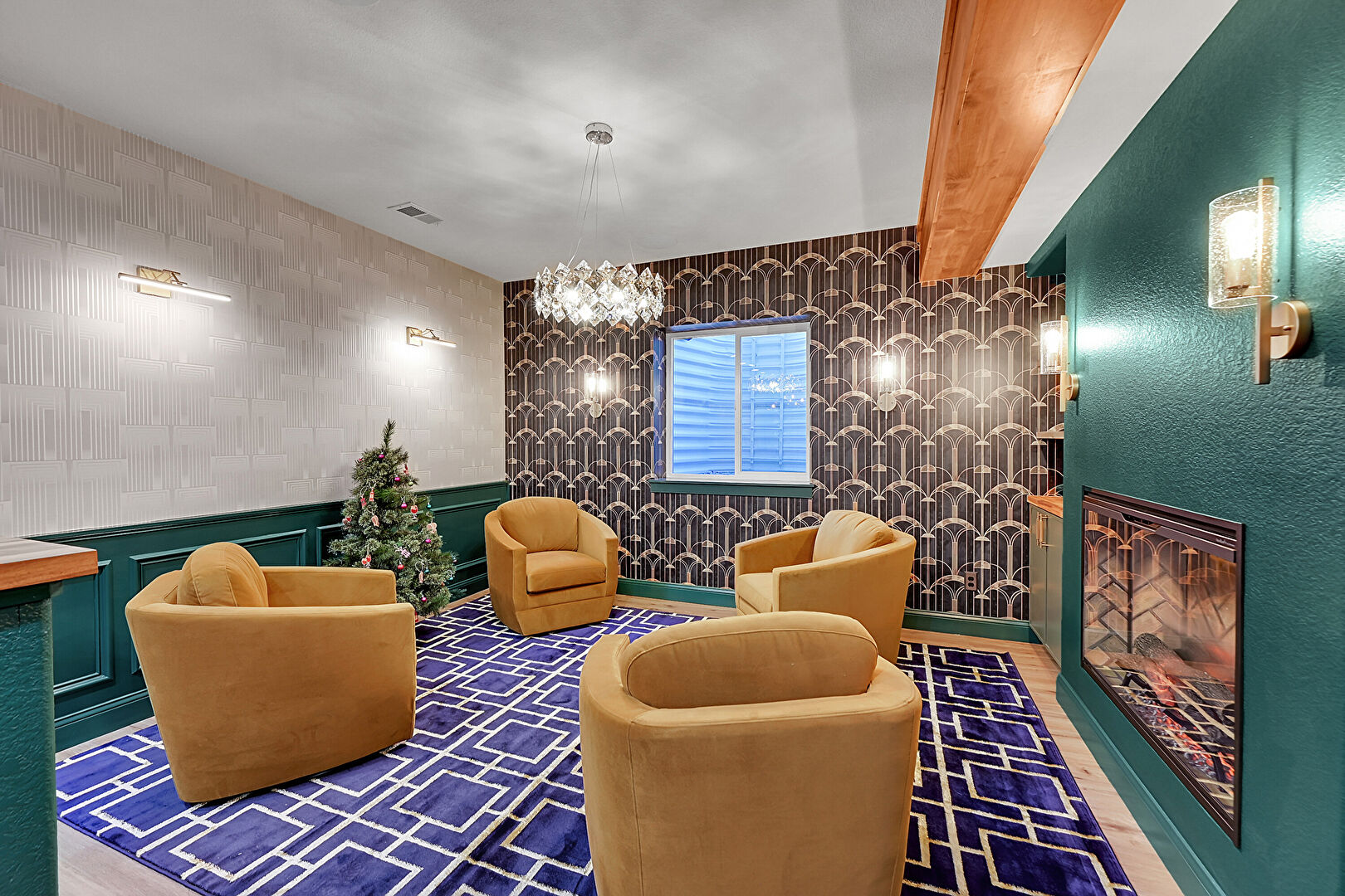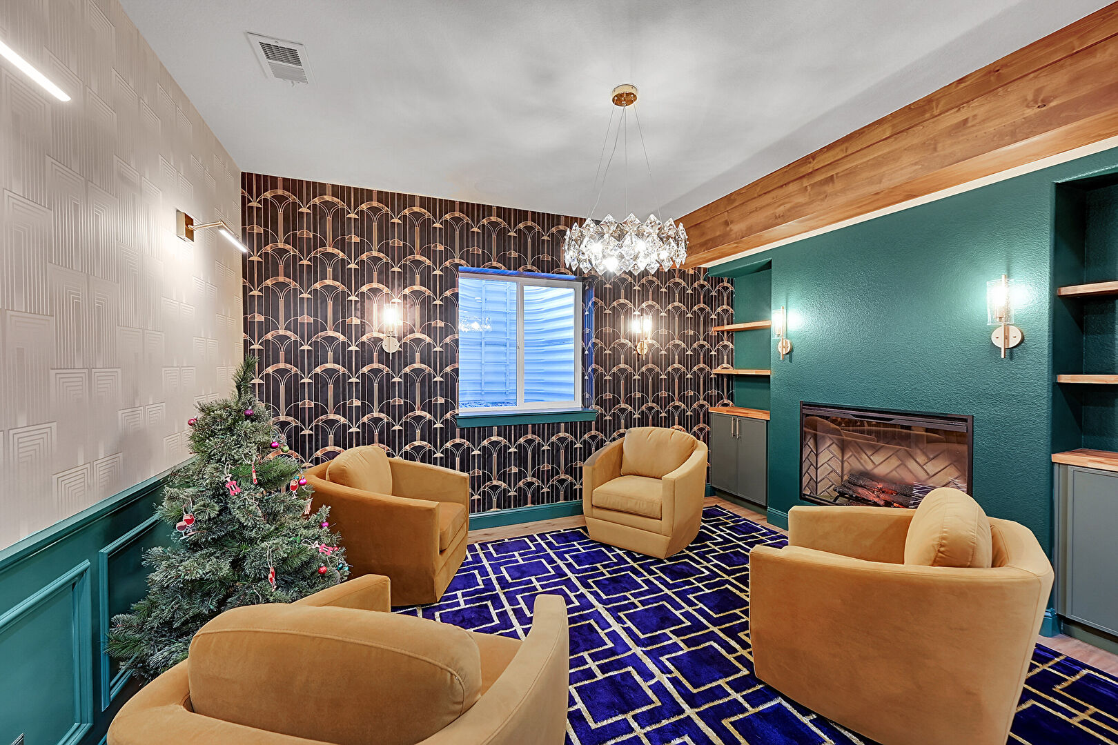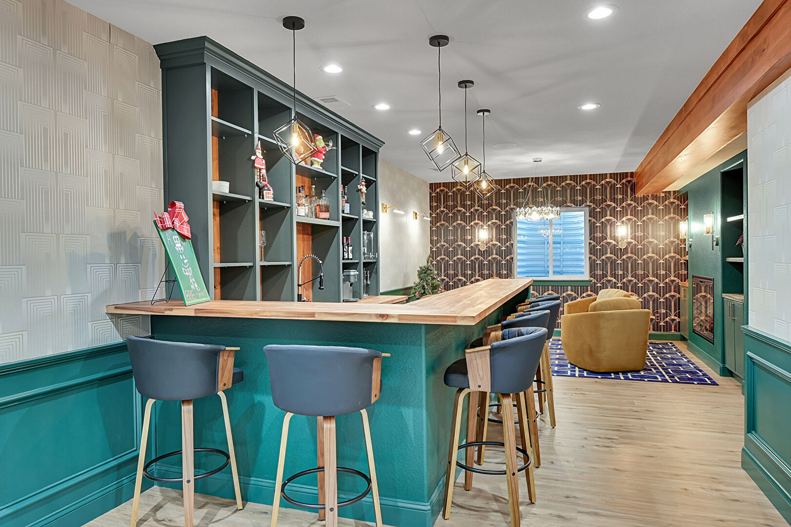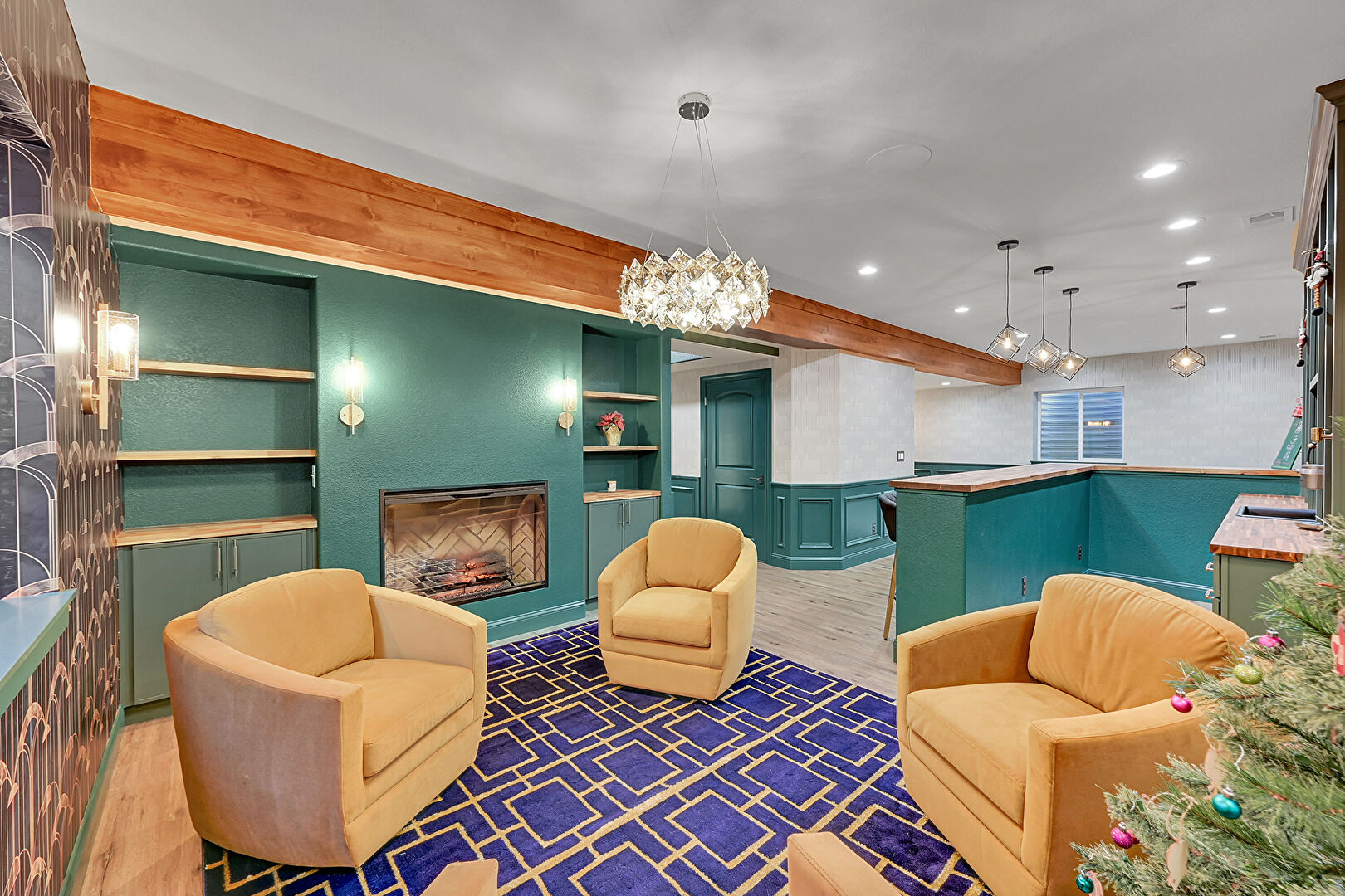 Accent Wall, Basement, Beamed Ceiling, Built In Shelves, Carpet, Fireplace, Indoor Bar, Natural Light, Notable Chandelier, Paneling Wall, Recessed Lighting, Vent, Wainscot Wall, Wallpaper Wall, Wood Finish Floor, Carpet, Fireplace, Indoor Bar, Notable Chandelier, Vent, Wallpaper Wall