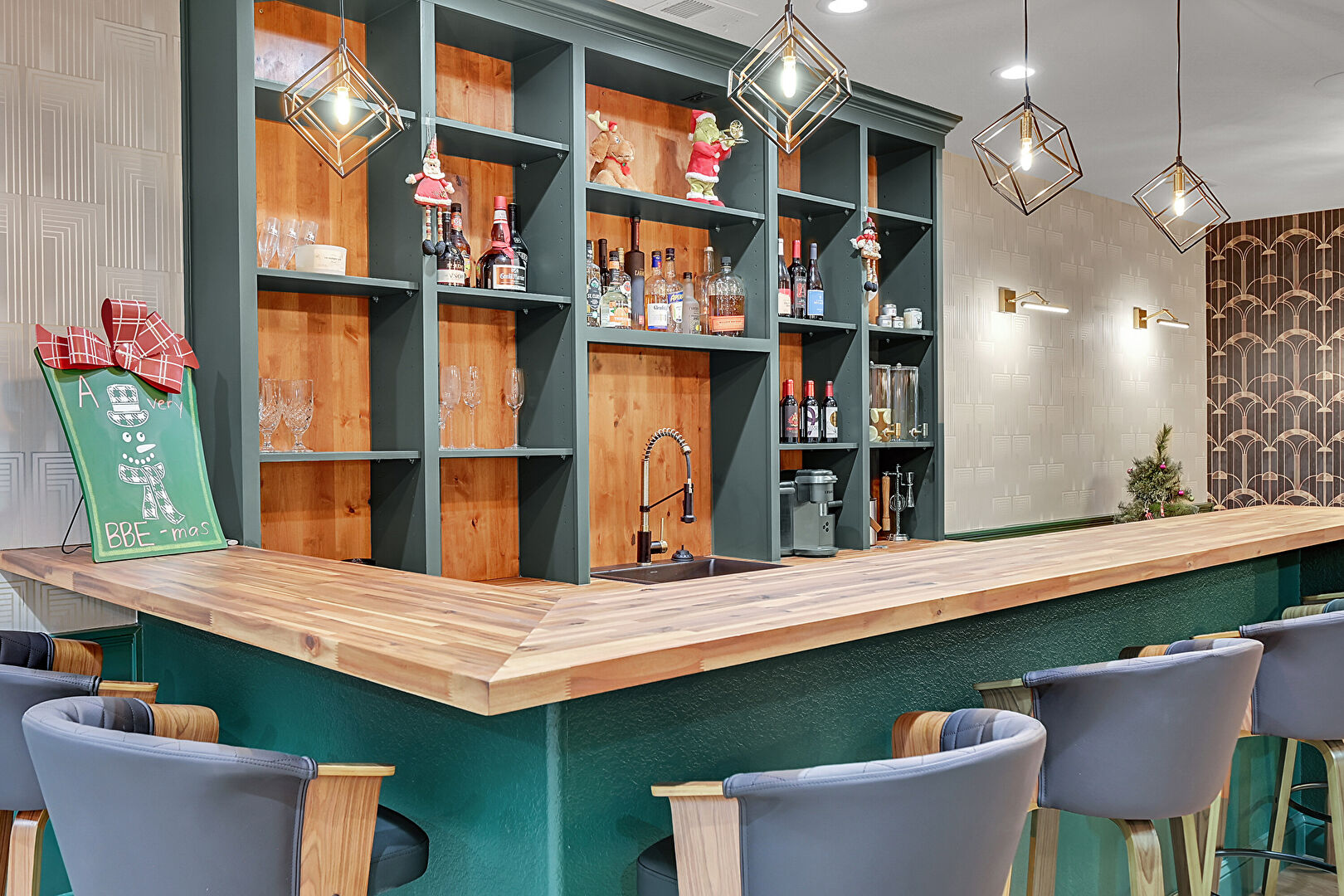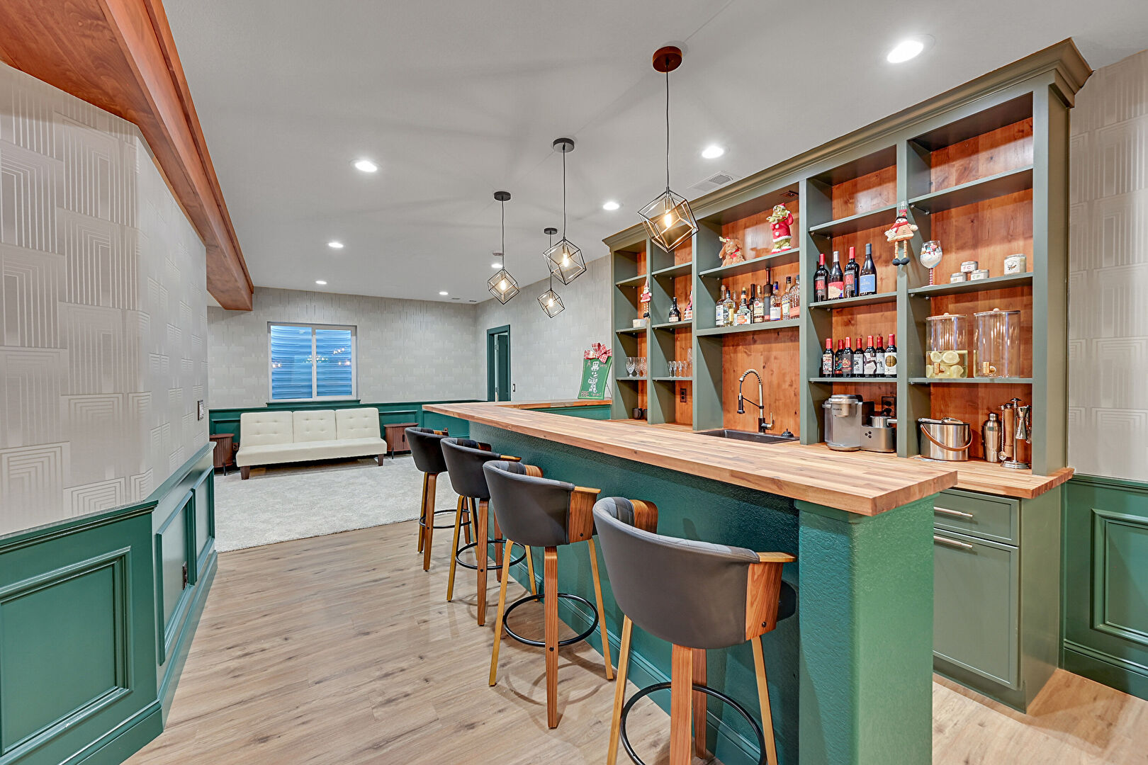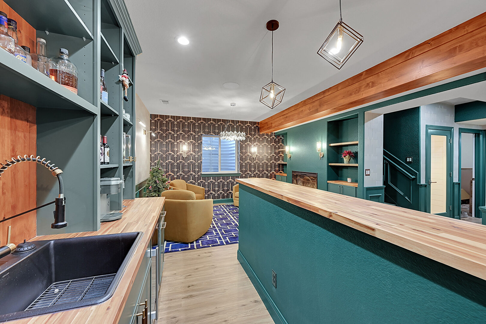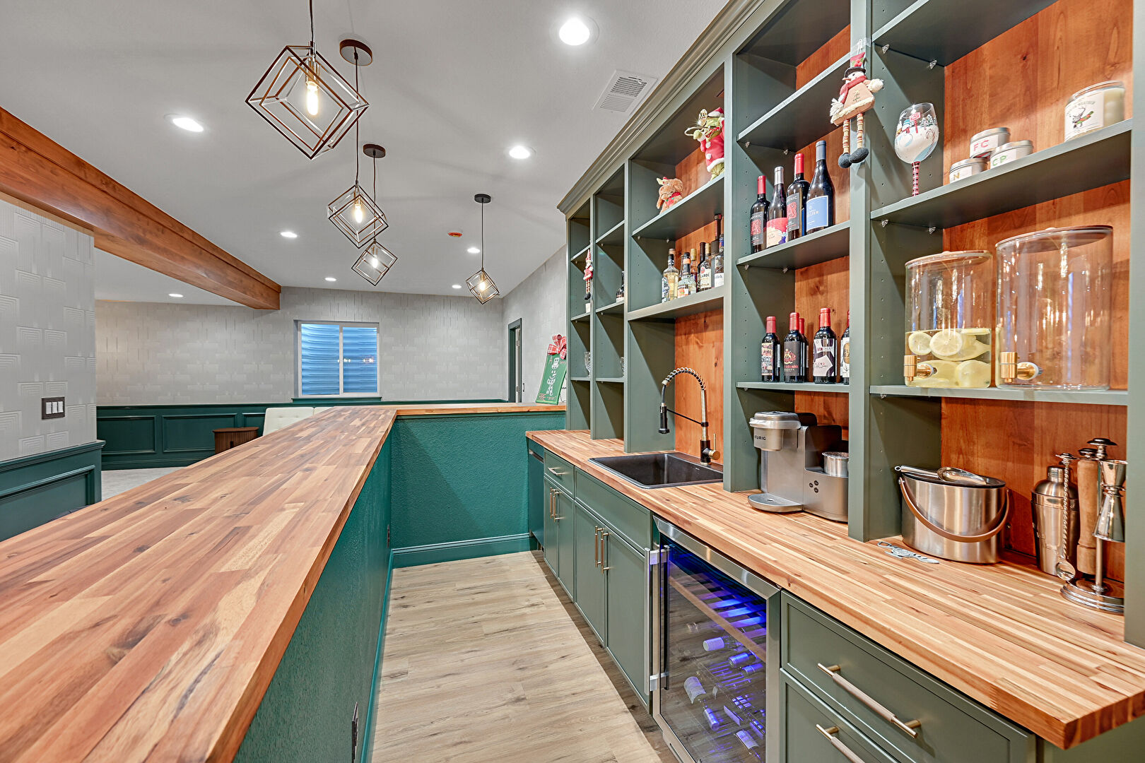Beamed Ceiling, Built In Shelves, Butcher Block Countertops, Green Cabinets, Indoor Bar, Open Shelves, Paneling Wall, Pendant Lighting, Recessed Lighting, Shaker Cabinets, Wainscot Wall, Wallpaper Wall, Wine Cooler, Wood Finish Floor, Accent Wall, Paneling Wall, Recessed Lighting, Vent
