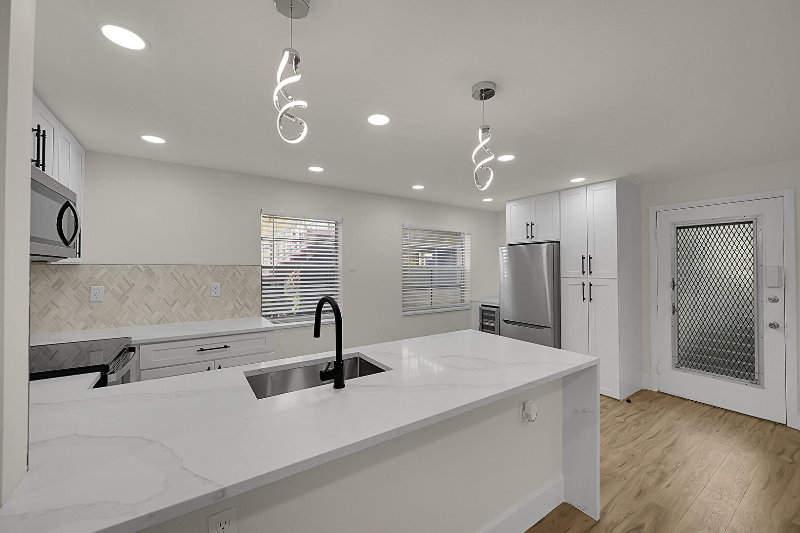 Baseboards Wall, Ceiling Fan, Drywall, Kitchen Peninsula, Natural Light, Opens To Living Area, Pendant Lighting, Recessed Lighting, Shaker Cabinets, Stone Countertops, U Shaped Kitchen, Vent, Wine Cooler, Wood Finish Floor, Baseboards Wall, Opens To Living Area, Shaker Cabinets, Vent, Wine Cooler