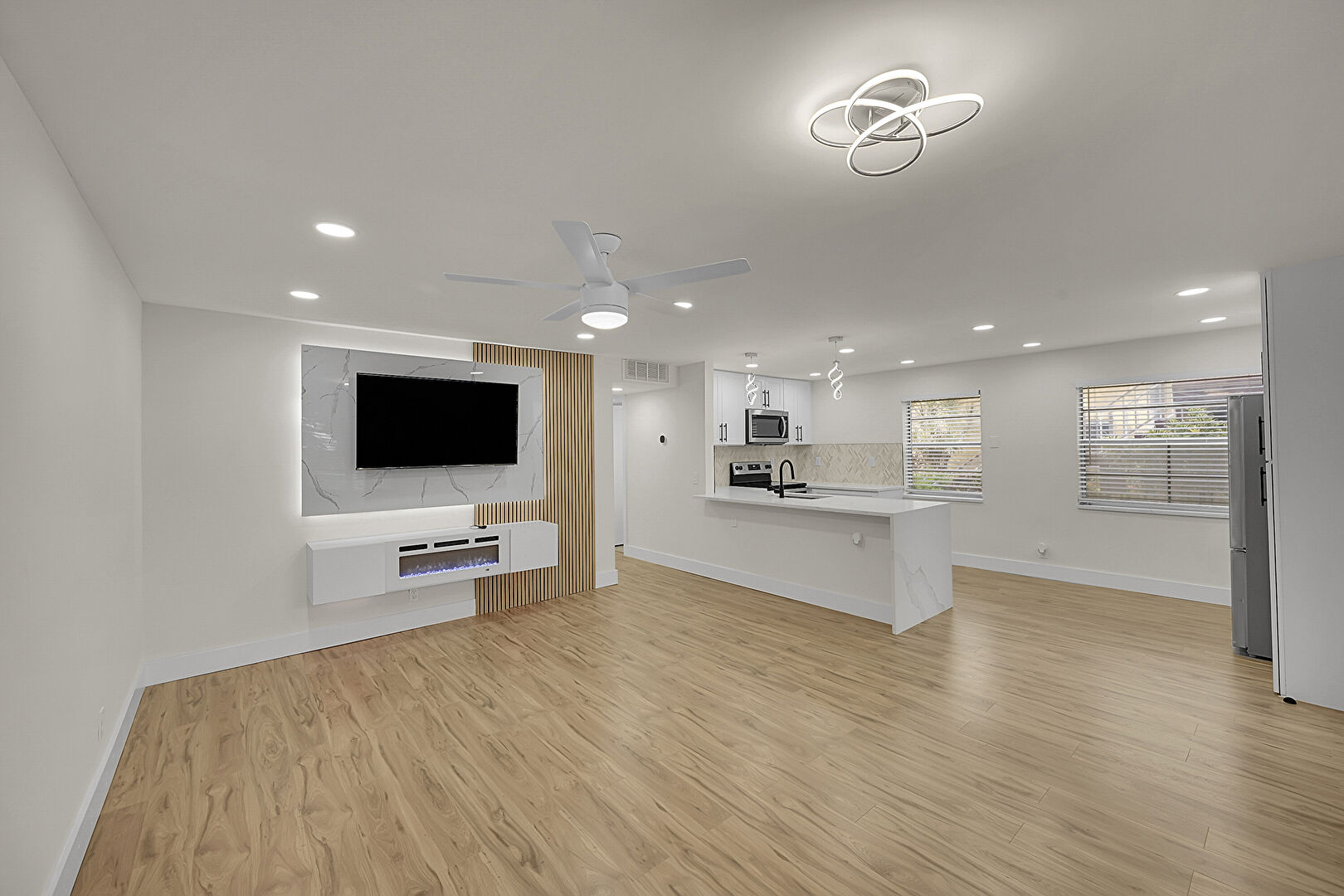 Baseboards Wall, Ceiling Fan, Drywall, Galley Kitchen, Natural Light, Recessed Lighting, U Shaped Kitchen, Vent, Wood Finish Floor, Drywall, Recessed Lighting