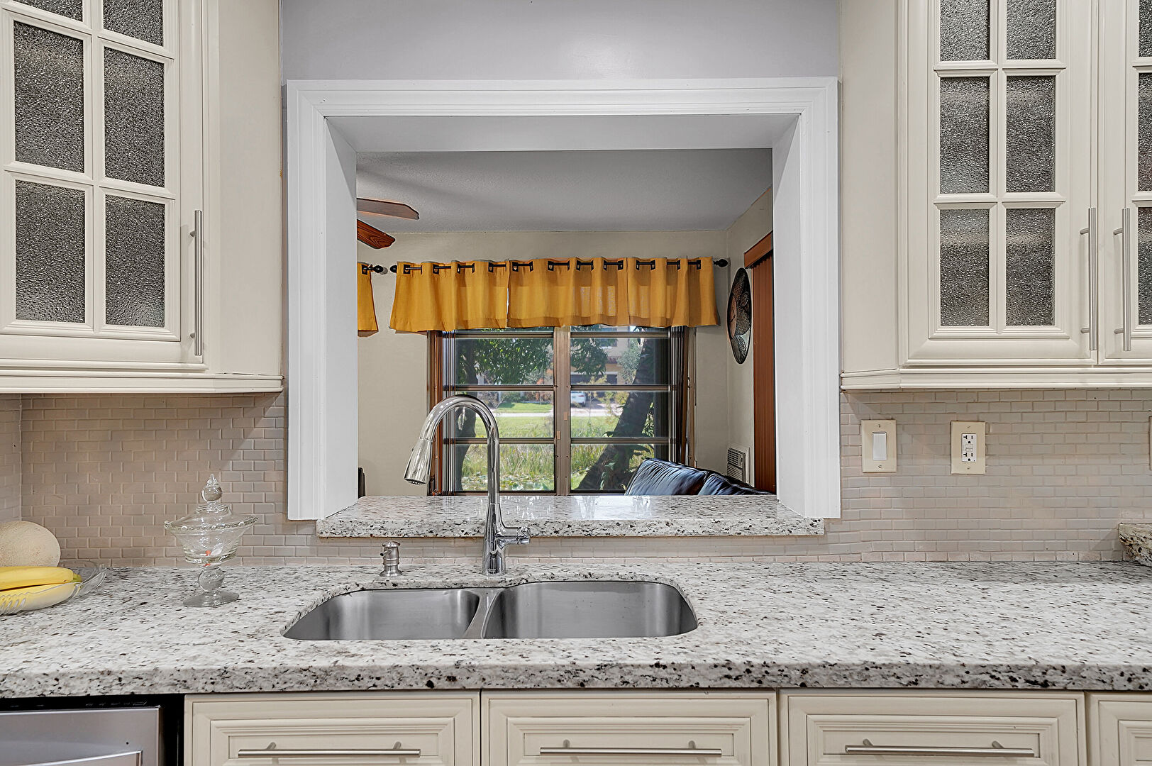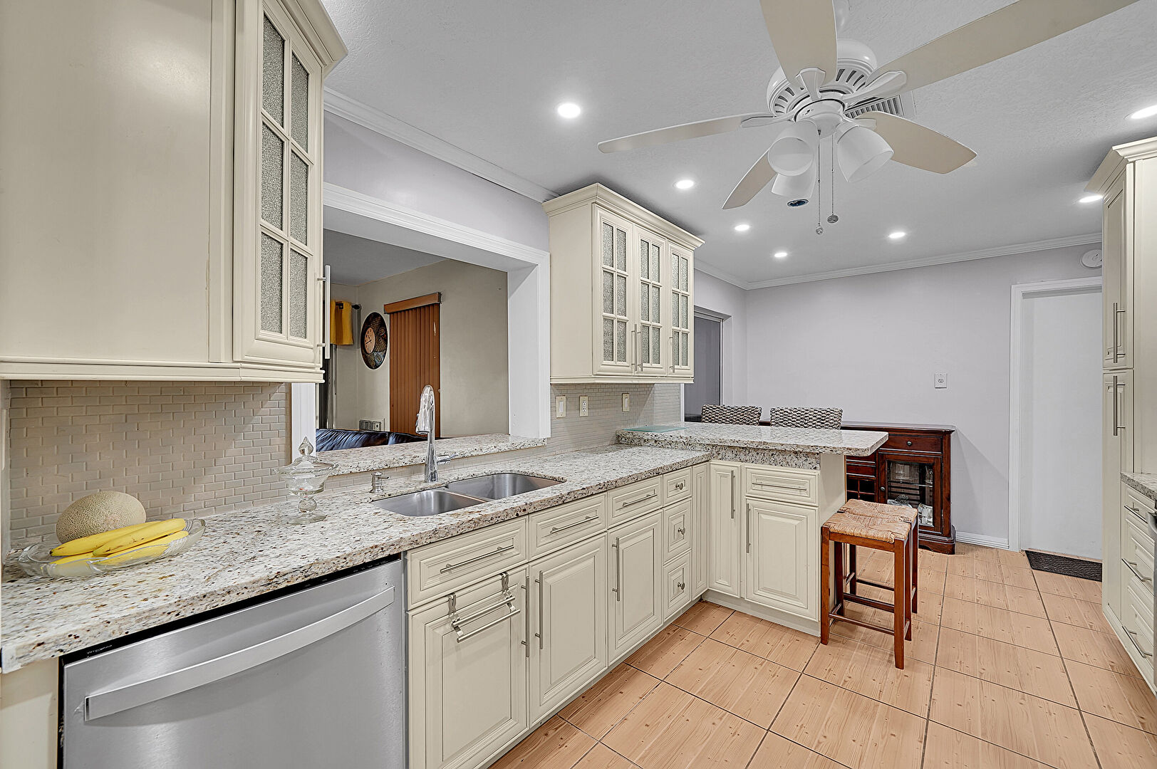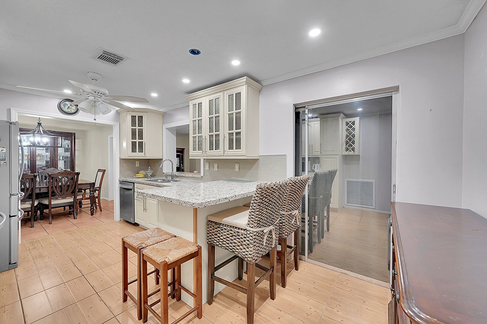 Baseboards Wall, Ceiling Fan, Cream Cabinets, Crown Molding, Crown Molding Cabinets, Drywall, Glass Insert Cabinets, Kitchen Bar, Kitchen Peninsula, Natural Light, Notable Chandelier, Pass Through Window, Pendant Lighting, Raised Cabinets, Recessed Lighting, Stone Countertops, Tile Floor, Toaster, Vent, Wood Finish Floor, Cream Cabinets, Notable Chandelier, Stone Countertops, Tile Floor, Vent