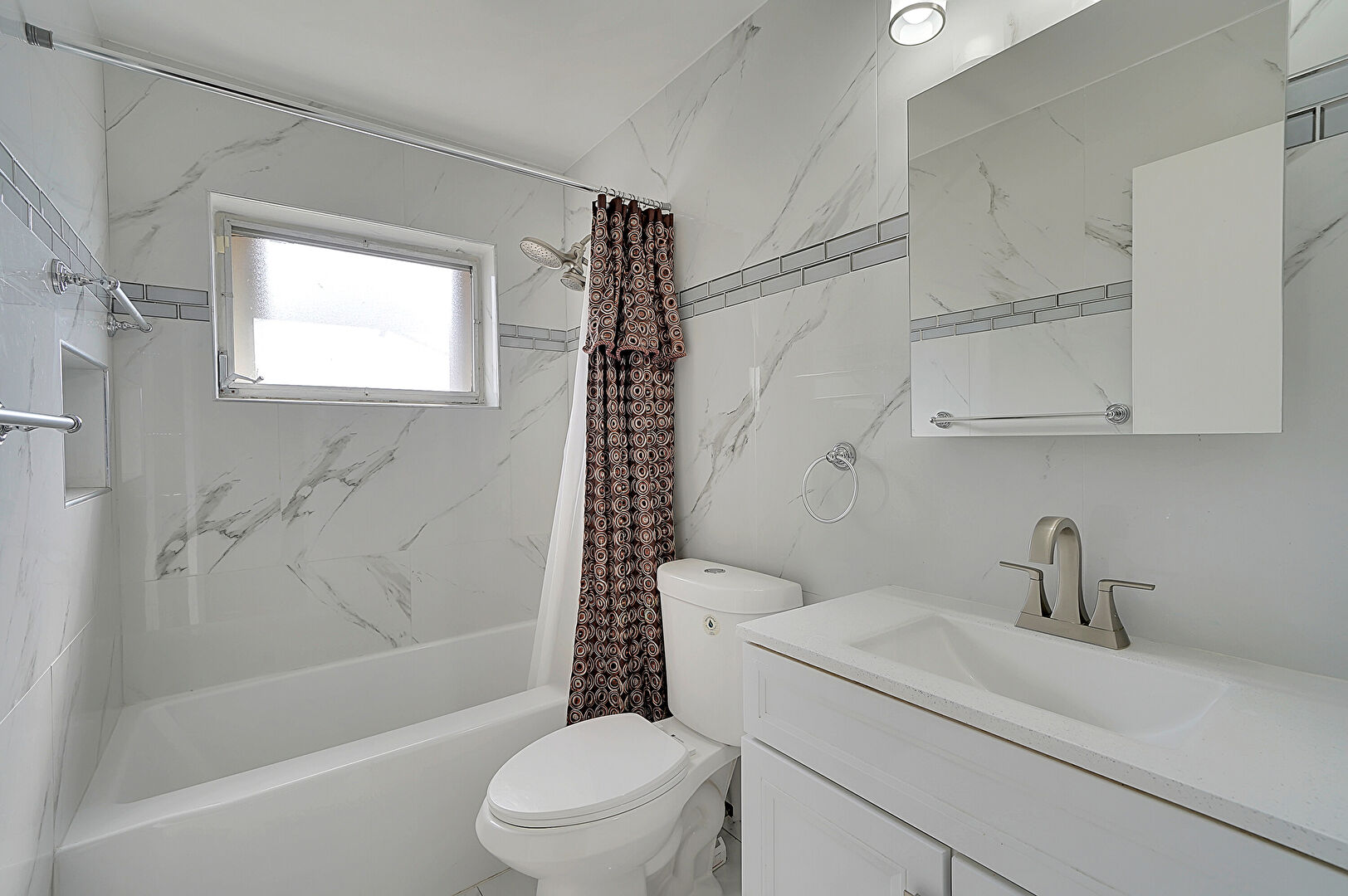 Combined Bath Shower, Full Bathroom, Natural Light, Vanity, Tile Wall