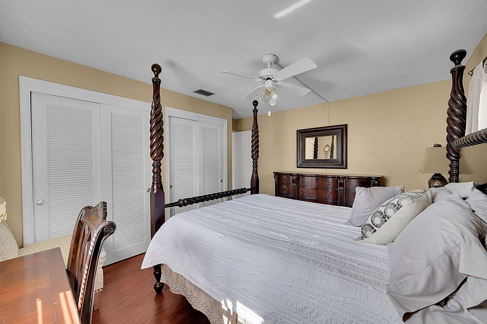 Ceiling Fan, Drywall, Natural Light, Vent, Wood Finish Floor, Textured Ceiling, Two Closets