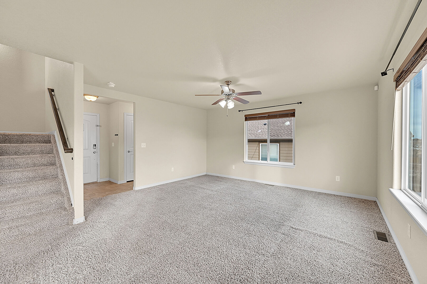Baseboards Wall, Carpet, Ceiling Fan, Drywall, L Shaped Kitchen, Natural Light, Notable Chandelier, Stairs, Vent, Baseboards Wall, Ceiling Fan, Recessed Lighting