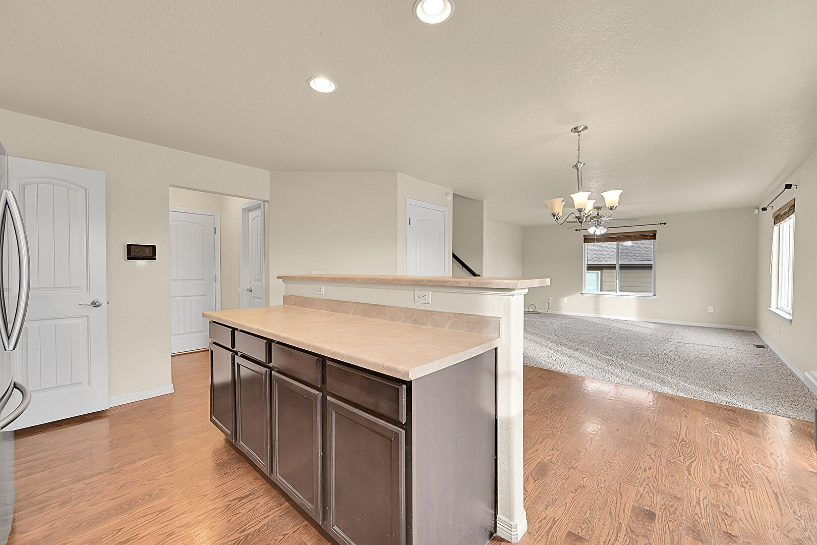 Baseboards Wall, Crown Molding Cabinets, Dark Brown Cabinets, Drywall, Kitchen Bar, Kitchen Island, L Shaped Kitchen, Natural Light, Notable Chandelier, Pendant Lighting, Recessed Lighting, Shaker Cabinets, Stone Countertops, Textured Ceiling, Vent, Wood Finish Floor, Dark Brown Cabinets, Kitchen Island, Opens To Living Area, Textured Ceiling