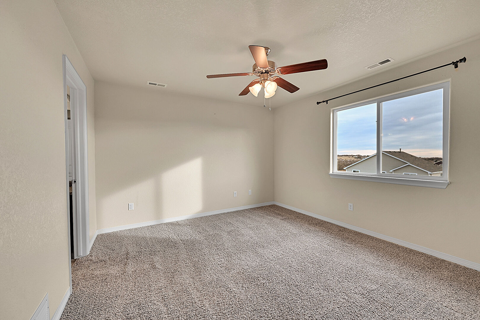 Baseboards Wall, Carpet, Ceiling Fan, Drywall, Natural Light, Textured Ceiling, Vent, Carpet, Ensuite Bathroom