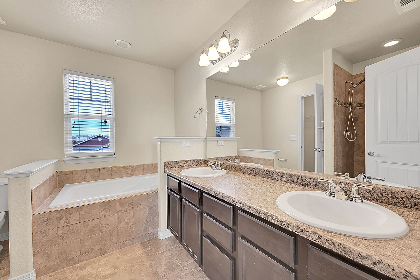Double Vanity, Drywall, Full Bathroom, Natural Light, Tile Floor, Vent, Drywall, Recessed Lighting