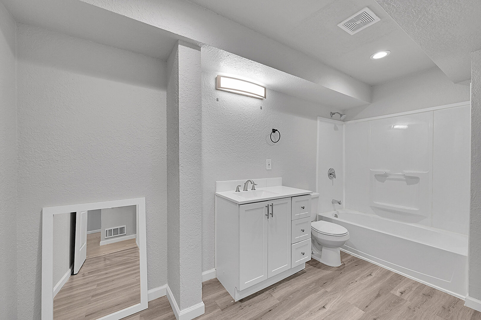 Baseboards Wall, Basement, Combined Bath Shower, Full Bathroom, Half Bathroom, Natural Light, Recessed Lighting, Textured Ceiling, Textured Wall, Vanity, Vent, Wood Finish Floor, Combined Bath Shower, Full Bathroom, Tile Floor