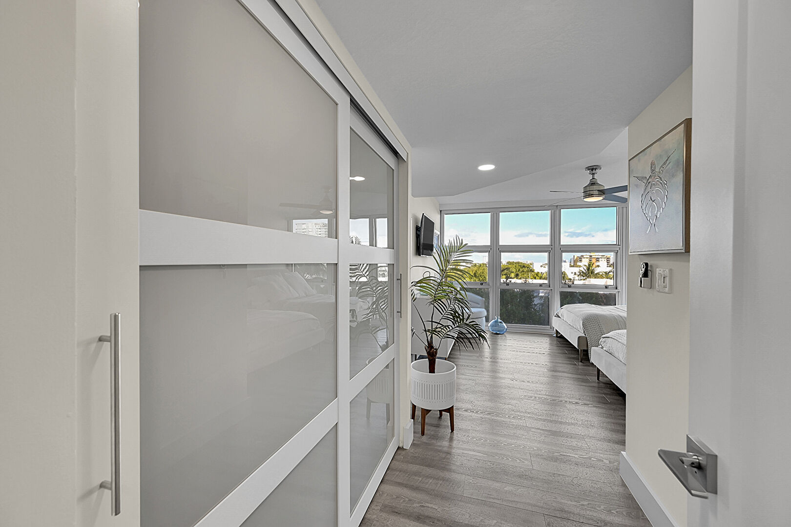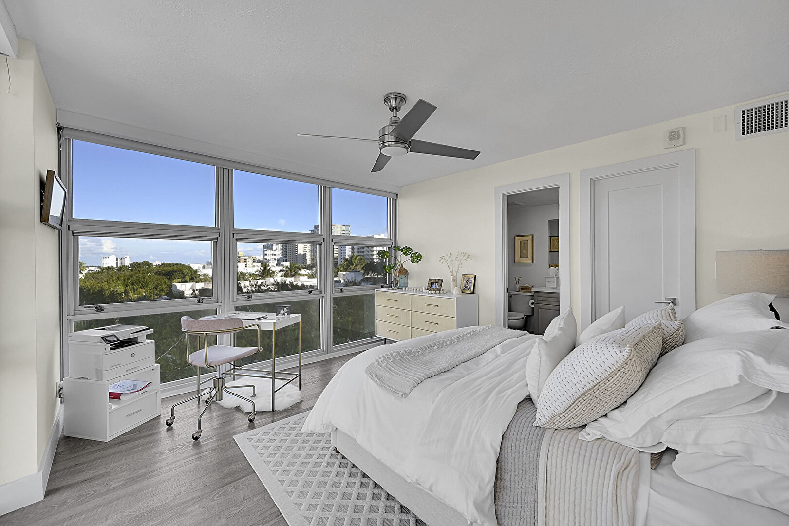 Accent Wall, Access To Exterior, Baseboards Wall, Ceiling Fan, City View, Drywall, Ensuite Bathroom, Floor Ceiling Windows, Natural Light, Smoke Carbon Monoxide Detector, Vent, Wood Finish Floor, Floor Ceiling Windows, Sunroom, Tile Wall, Wood Finish Floor