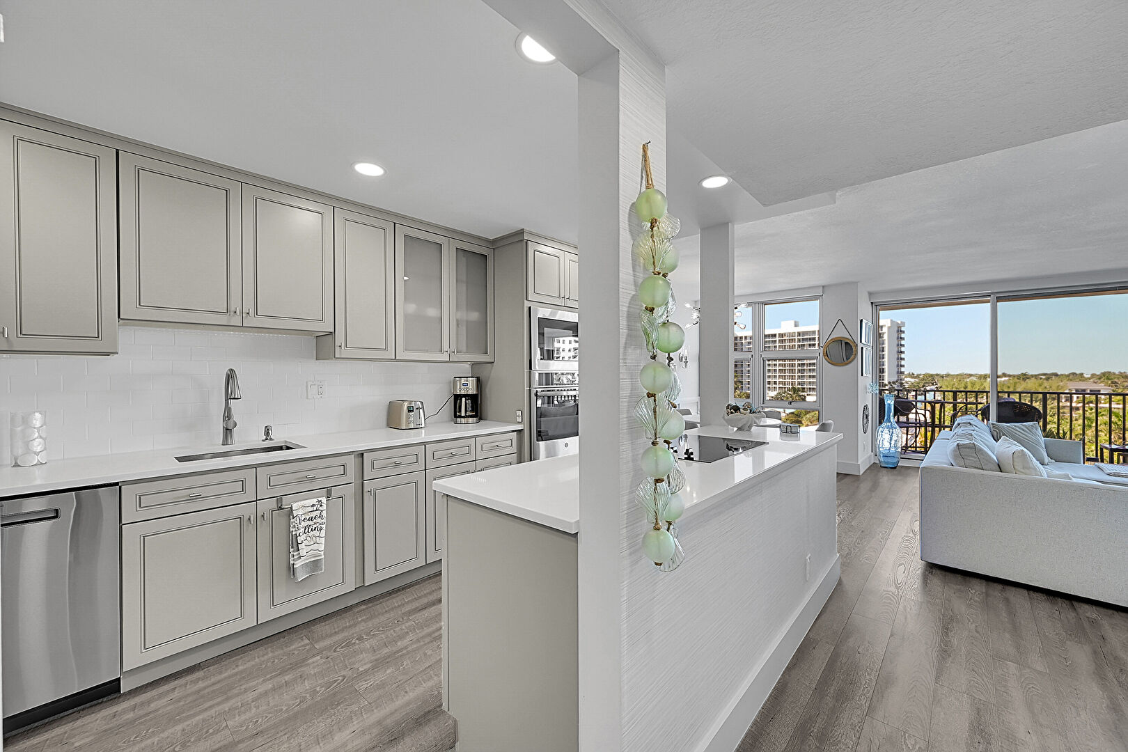 Baseboards Wall, Crown Molding Cabinets, Drywall, Glass Insert Cabinets, Gray Cabinets, Kitchen Bar, Kitchen Island, L Shaped Kitchen, Natural Light, Notable Chandelier, Opens To Living Area, Pendant Lighting, Raised Cabinets, Recessed Lighting, Shaker Cabinets, Stone Countertops, Vent, Wine Cooler, Wood Finish Floor, Drywall, Gray Cabinets, Shaker Cabinets, Wood Finish Floor