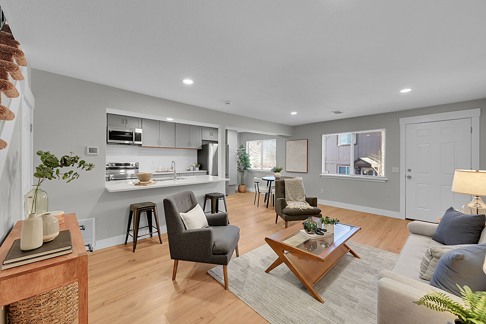 Baseboards Wall, Drywall, Gray Cabinets, Kitchen Bar, Kitchen Island, Kitchen Peninsula, Natural Light, One Wall Kitchen, Opens To Living Area, Recessed Lighting, Shaker Cabinets, Stone Countertops, Vent, Wood Finish Floor, Baseboards Wall, Drywall, Pass Through Window, Stone Countertops