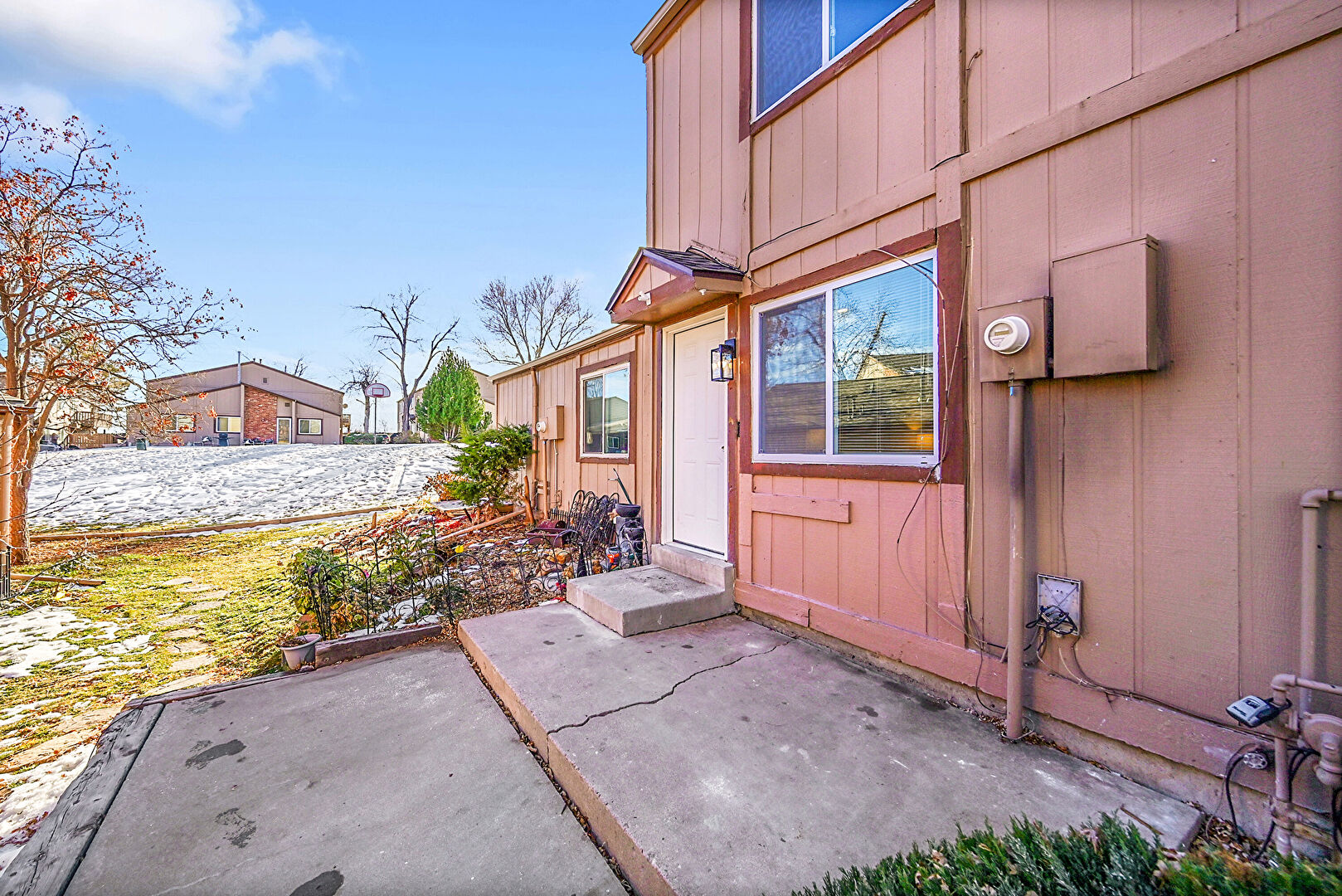 Board Batten Siding, Concrete Foundation, Fence, Gutters, Patio, Vertical Siding, Downspout, Electric Meter