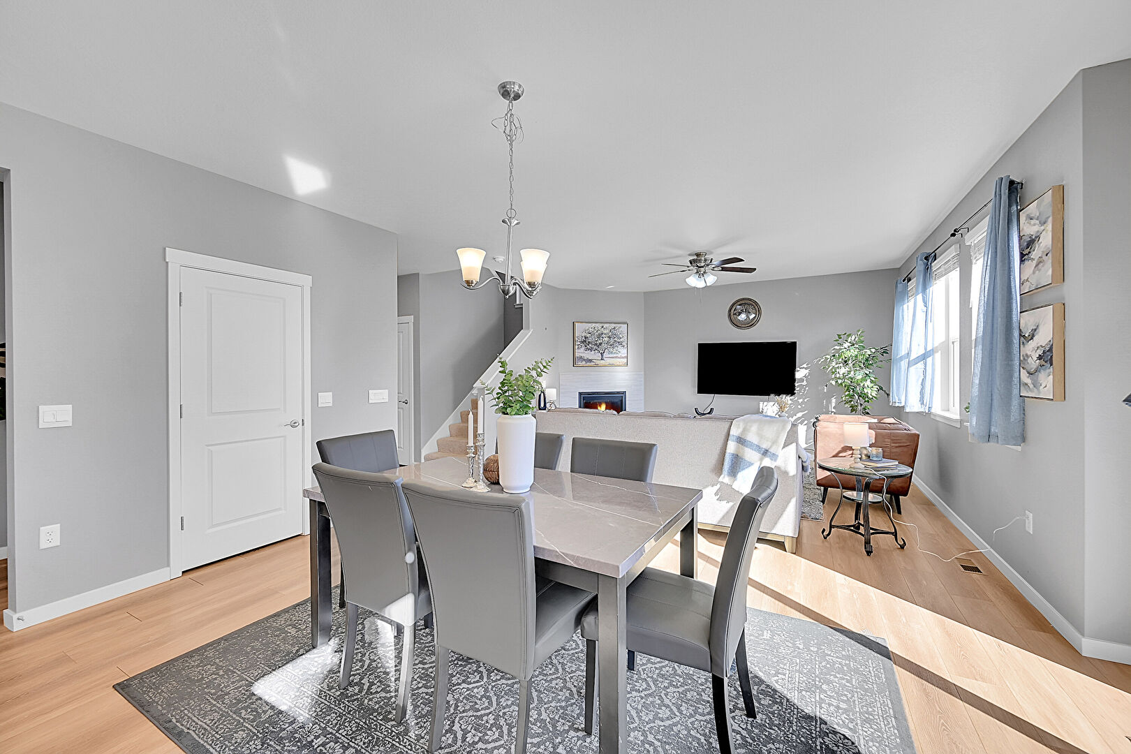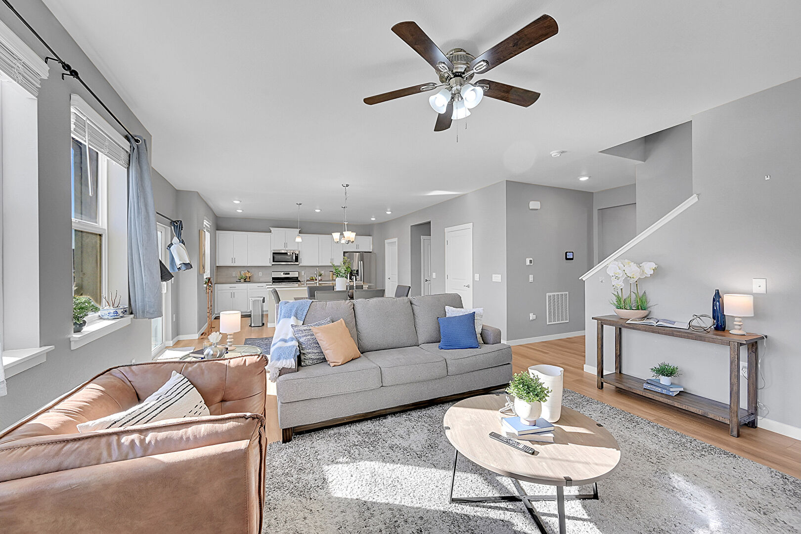 Baseboards Wall, Ceiling Fan, Drywall, Fireplace, Natural Light, Notable Chandelier, Recessed Lighting, Wood Finish Floor, One Wall Kitchen, Stairs