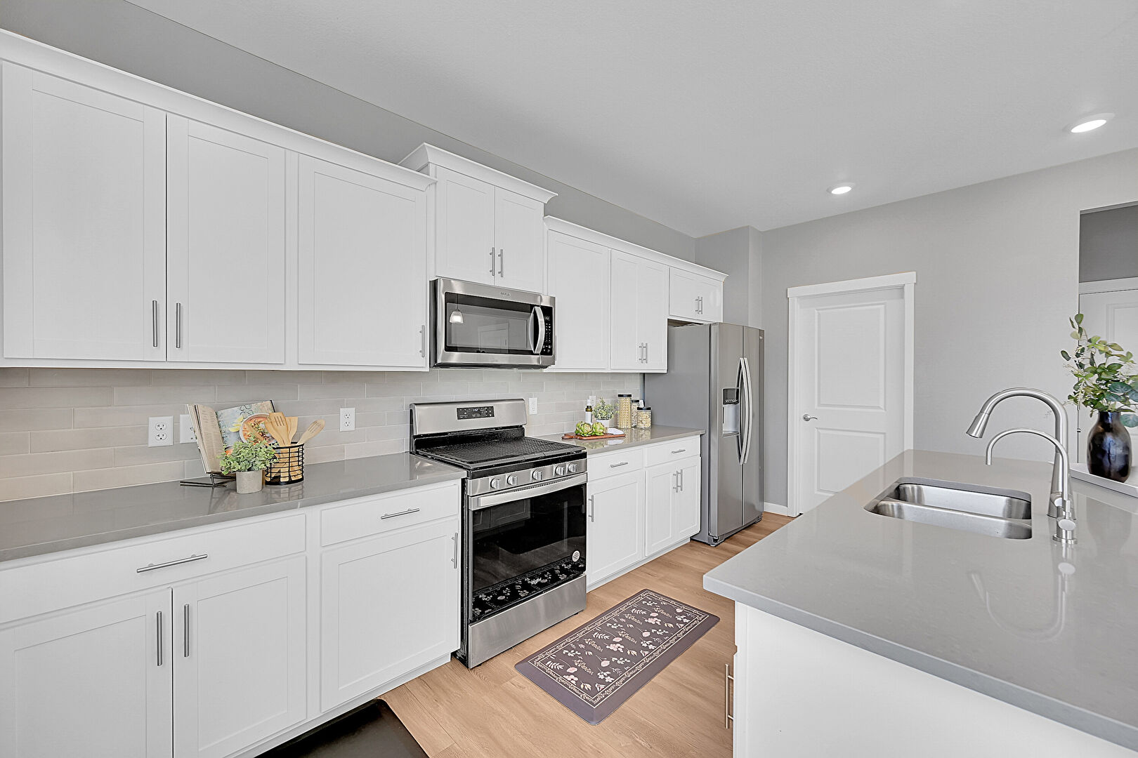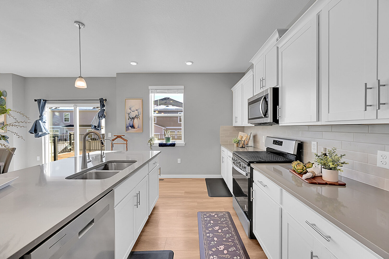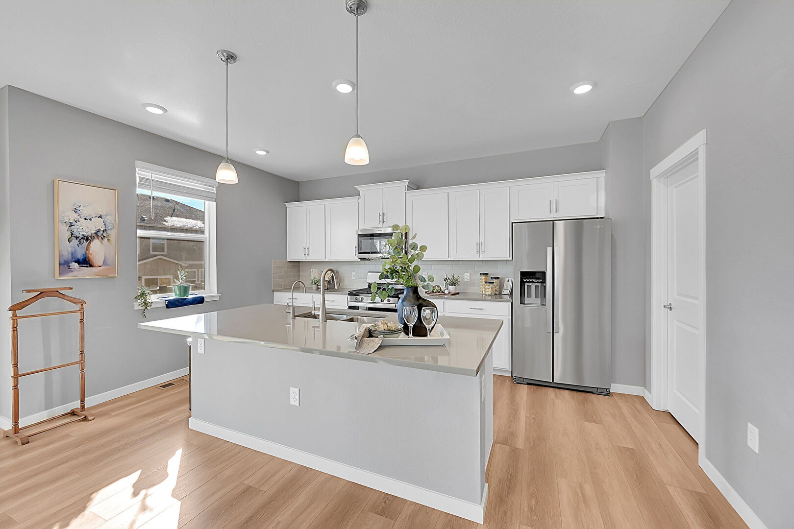 Baseboards Wall, Ceiling Fan, Crown Molding Cabinets, Drywall, Kitchen Island, Natural Light, Notable Chandelier, One Wall Kitchen, Opens To Living Area, Pendant Lighting, Recessed Lighting, Shaker Cabinets, Stone Countertops, Wood Finish Floor, Crown Molding Cabinets, Recessed Lighting, Shaker Cabinets