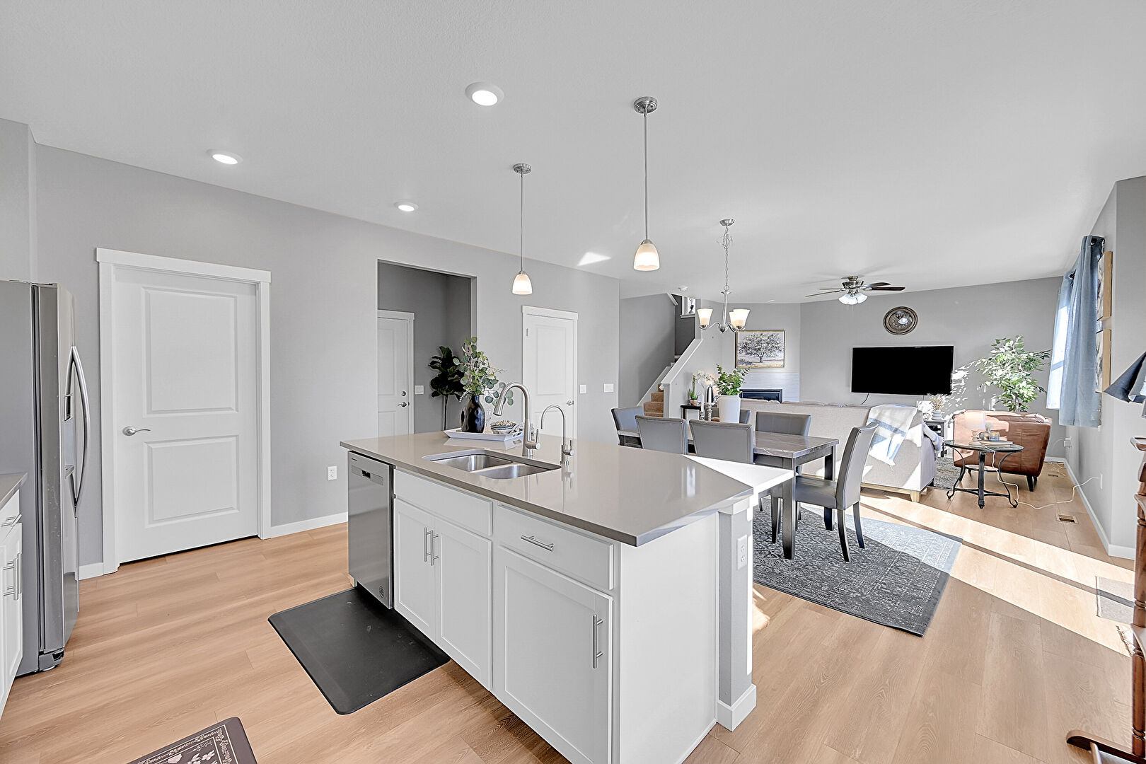 Baseboards Wall, Carpet, Ceiling Fan, Drywall, Fireplace, L Shaped Kitchen, Natural Light, Notable Chandelier, Recessed Lighting, Stairs, Textured Ceiling, Vent, Wood Finish Floor, Baseboards Wall, Carpet, Drywall, Recessed Lighting