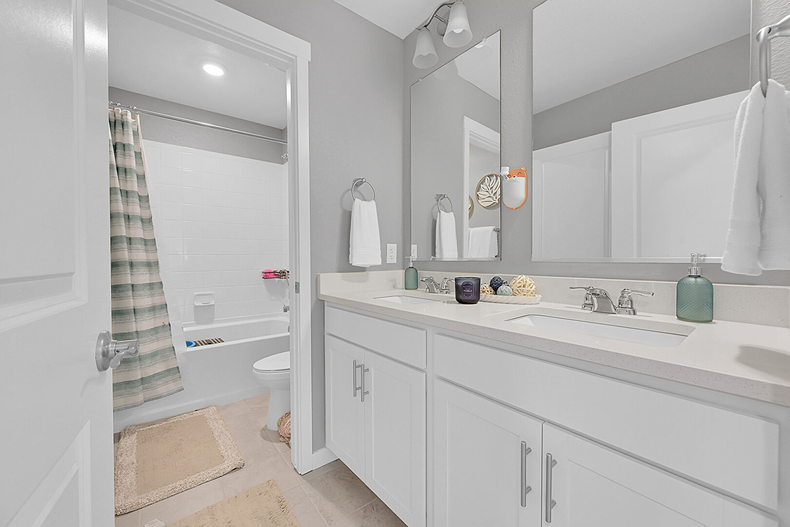 Double Vanity, Drywall, Full Bathroom, Natural Light, Tile Floor, Vent, Baseboards Wall