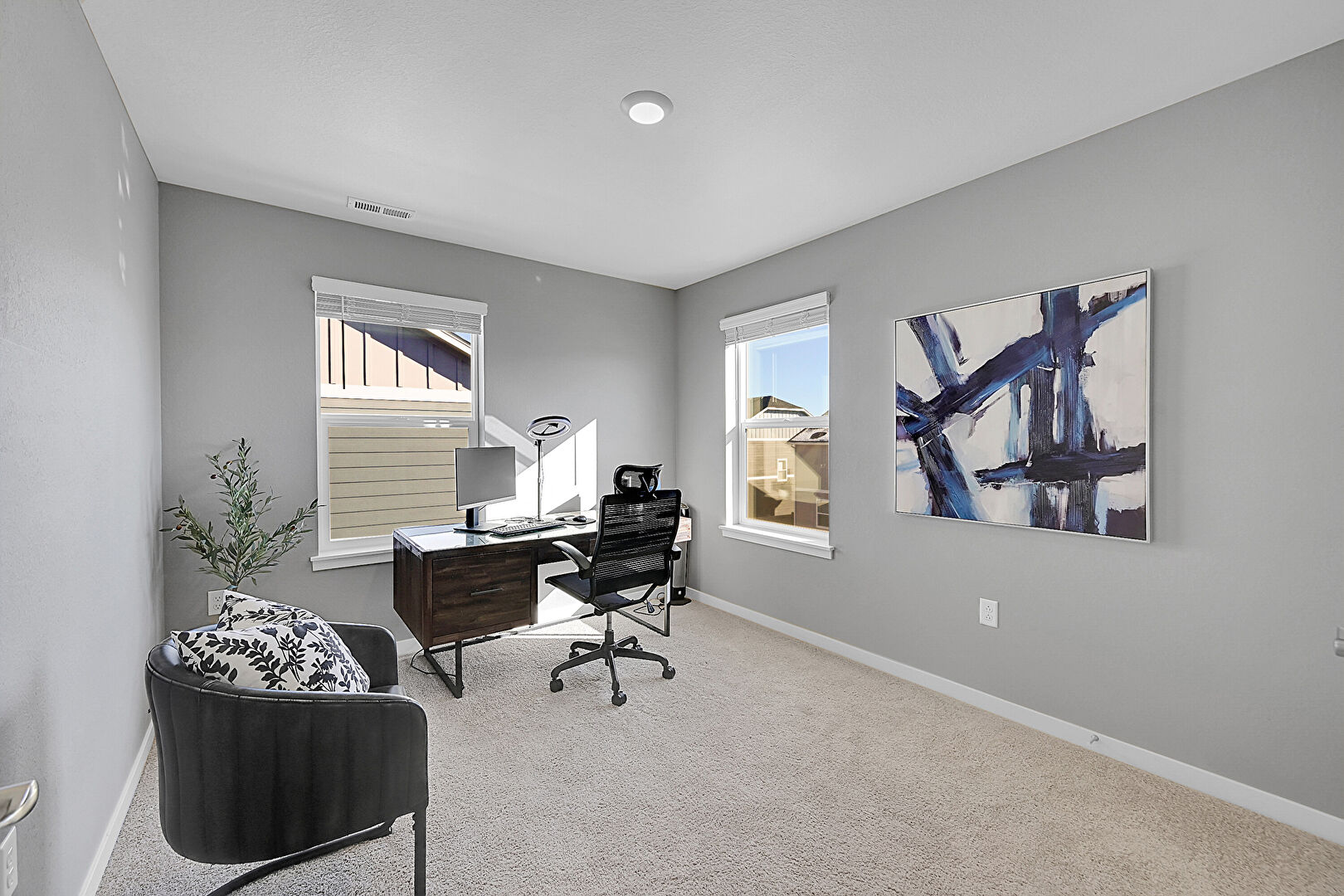 Baseboards Wall, Carpet, Drywall, Natural Light, Office Area, Recessed Lighting, Scuttle, Natural Light, Vent