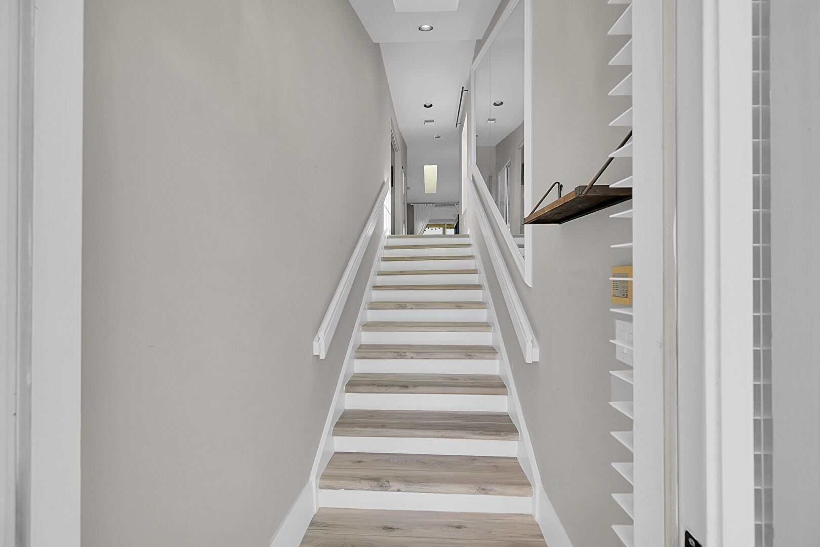 Baseboards Wall, Drywall, Natural Light, Recessed Lighting, Skylight, Tile Floor, Upstairs Landing, Wood Finish Floor, Baseboards Wall, Recessed Lighting, Stairs