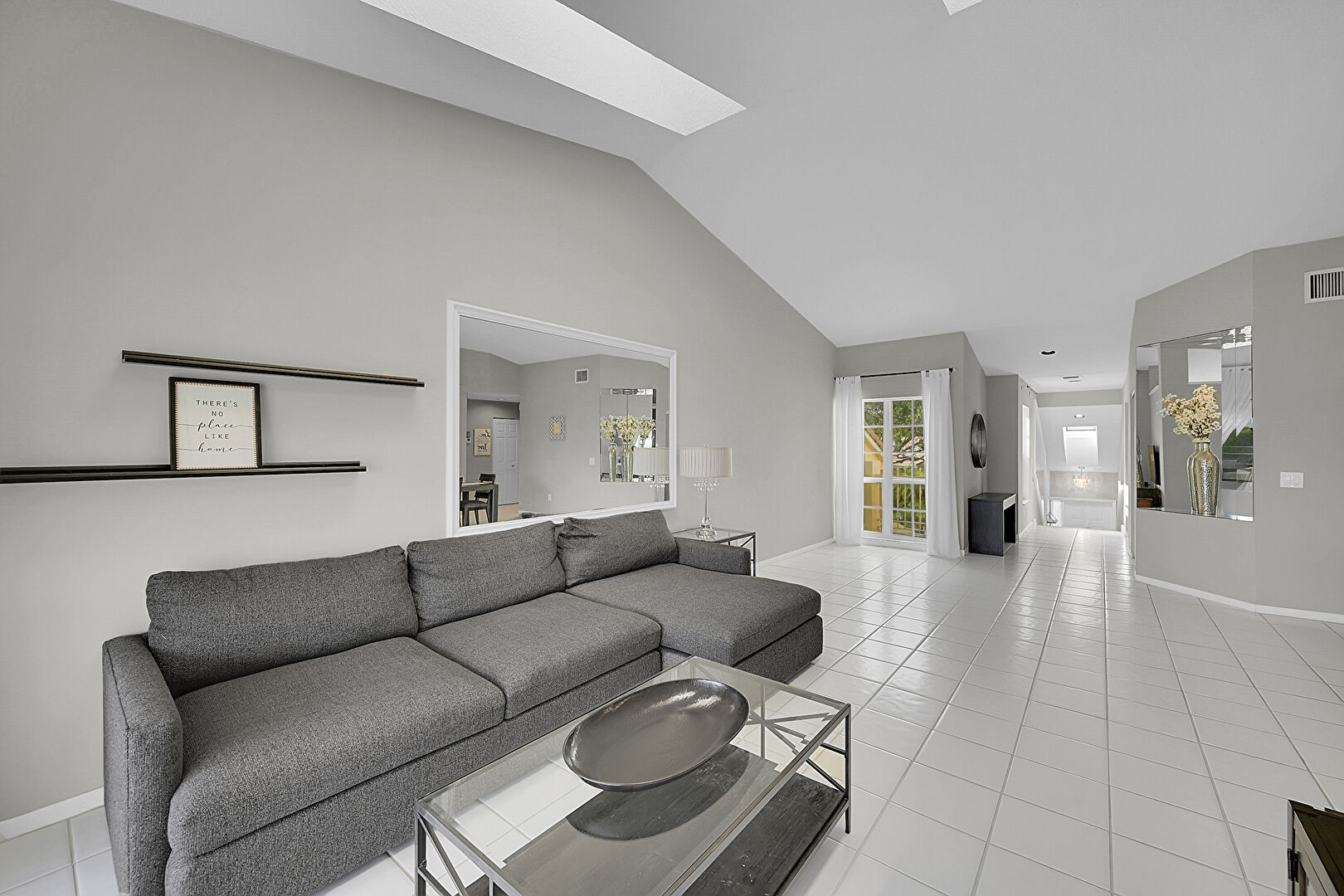 Baseboards Wall, Cathedral Ceiling, Drywall, High Ceiling, Natural Light, Notable Chandelier, Skylight, Tile Floor, Vaulted Ceiling, Vent, Natural Light, Tile Floor, Track Lighting