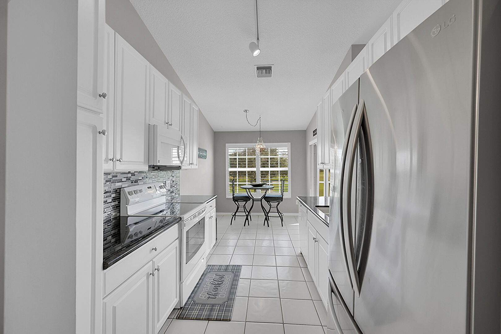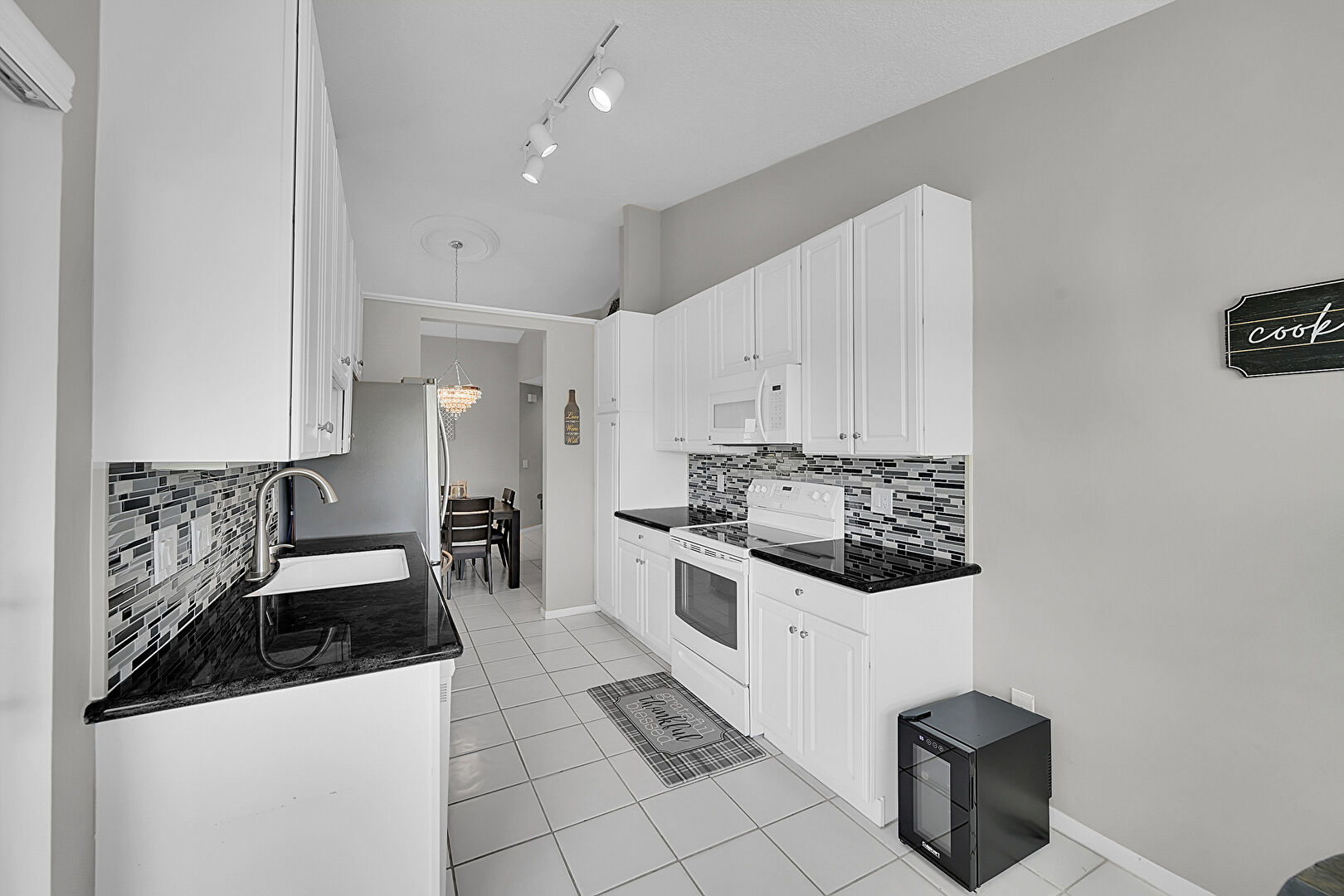 Baseboards Wall, Drywall, Galley Kitchen, Natural Light, Notable Chandelier, Pendant Lighting, Raised Cabinets, Stone Countertops, Textured Ceiling, Tile Floor, Track Lighting, Vent, Wall Mounted Ac, Pendant Lighting, Stone Countertops